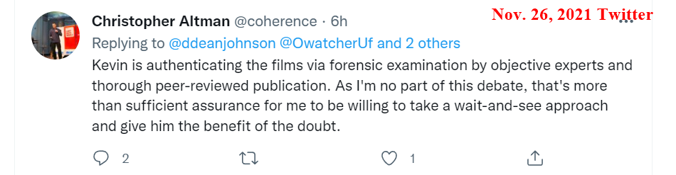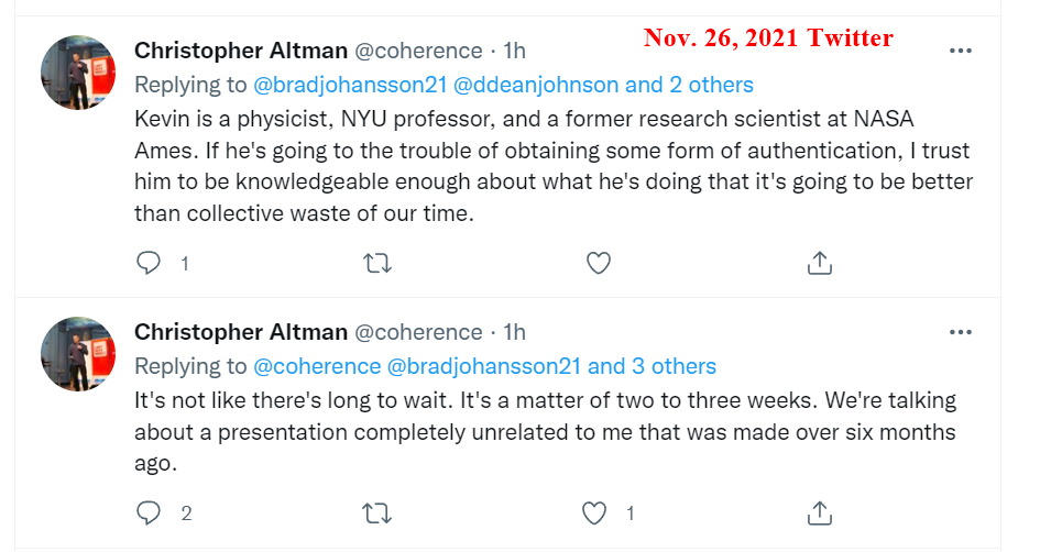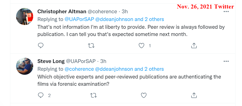 On a few occasions since Kevin Knuth's August 2021 AIAA presentation, having previously found Knuth unresponsive to my communication attempts, I directed inquiries to various parties whom I thought might have insight into the status of the promised scientific article. For example, on November 26, 2021, on open Twitter (not in private Direct Messages), I inquired of Christopher Altman regarding the status of the promised scientific paper. (Altman, Knuth, and Szydagis were among the seven men on that date listed as "The Team" for the nonprofit organization UAPx. Please note that Altman has no connection with Ray Stanford, and neither does UAPx as an organization have any such connection as far as I am aware.) Christopher Altman replied (on open public Twitter) that Knuth "is authenticating the films via forensic examination by objective experts and through peer-reviewed examination," and said that a paper would come out in two or three weeks. Over a period of hours, Altman and I exchanged a substantial number of further open-Twitter messages on the matter, with a number of other persons also participating in the discussion; here are a few samples.