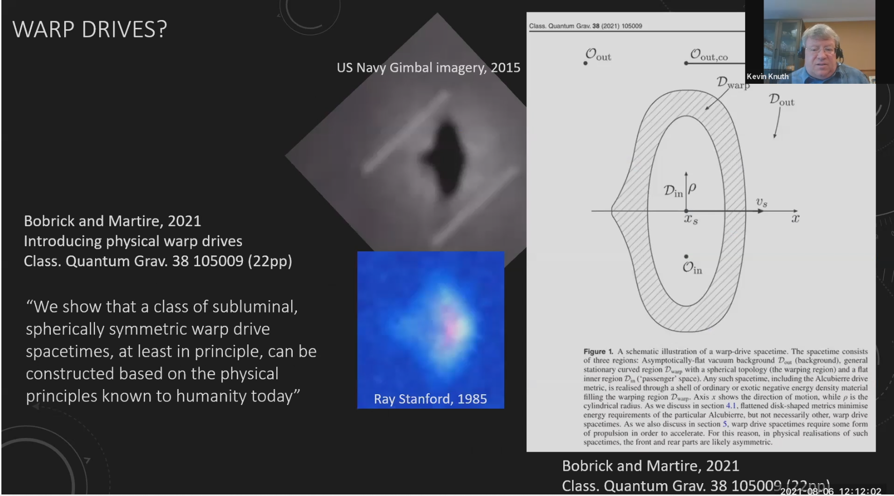 The first slide in Knuth's August 6, 2021 presentation at the AIAA forum listed as co-authors Matthew Szydagis and David Mason, and in his opening remarks, Knuth acknowledged both men as having contributed. However, David Mason (an accomplished electrical engineer) later communicated to me that his contribution to the presentation was limited to certain interesting thermal images that he obtained in 2019, and that he had no knowledge of or involvement in the Ray Stanford material.