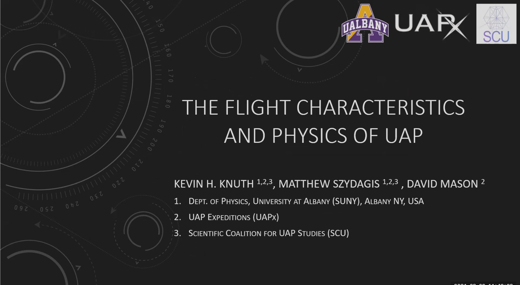 The Scientific Coalition for UAP Studies is a nonprofit organization devoted to evidence-based research into unidentified aerial phenomena. It had an annual conference scheduled for June 5-6, 2021, for which attendance was virtual due to the COVID-19 pandemic. Among the scheduled speakers was Kevin Knuth, Ph.D., a physicist and associate professor on the faculty of the University at Albany (State University of New York).