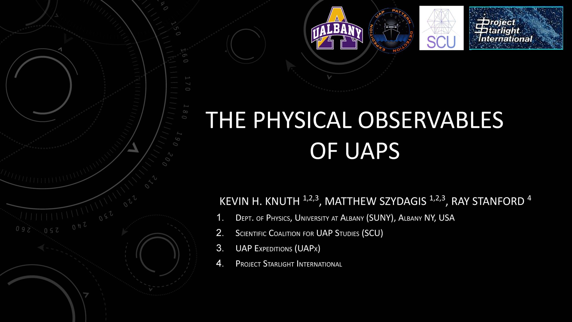 Only a few days before the conference, Knuth submitted a 67-slide slideshow in PDF format titled, "The Physical Observables of UAPs." Like other such resources submitted by scheduled speakers, the PDF was posted on a website to which access was limited to paid conference pre-registrants (of which I was one). On June 3, I downloaded my copy. On the first slide, Knuth, Matthew Szydagis, and Ray Stanford were listed as co-authors.