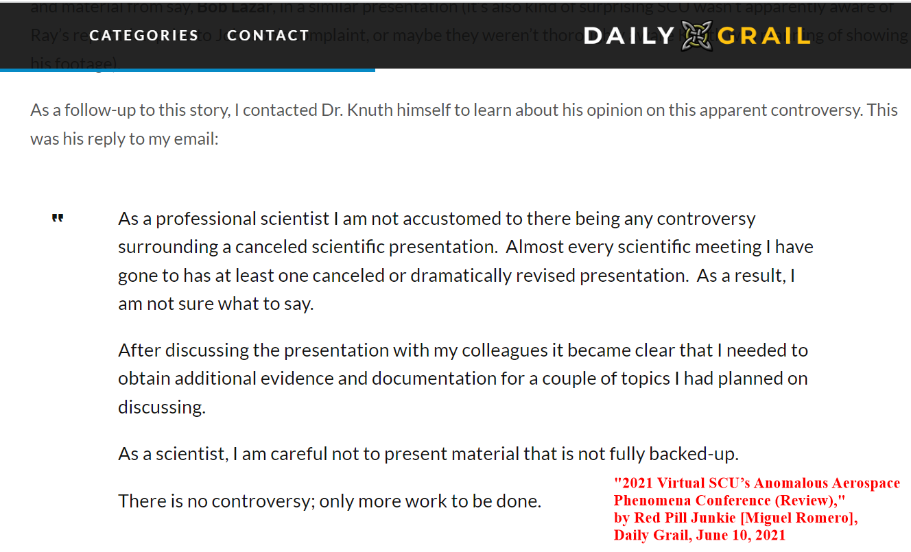It is a perfectly valid concern, and one that would have also been applicable if someone had chosen to include quotes and material from say, Bob Lazar, in a similar presentation (it’s also kind of surprising SCU wasn’t apparently aware of Ray’s reputation prior to Johnson’s complaint, or maybe they weren’t thoroughly aware Knuth was planning of showing his footage).I contacted Dr. Knuth himself to learn about his opinion on this apparent controversy. This was his reply to my email: