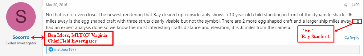 Supplemental information: A cautionary tale. In quite recent years, Stanford himself repeatedly publicly claimed that a 35 mm photo that he took at Socorro, New Mexico, in 1964, at the site of the famous incident reported by policeman Lonnie Zamora (on which stood a small "dynamite shack"), upon enlargement showed an egg-shaped UFO aloft in the background, with the very distinctive landing gear just as described by Zamora. As Stanford described the photo in a 2015 podcast appearance, it was "a wonderful photograph in which...people will be able to see, in broad daylight...the Socorro object [egg-shaped UFO], with its landing gear deployed." Stanford even said that he was going to write a second book on Socorro, in which this amazing photo would be a featured element. After years of discussion of this claim, several Stanford acolytes publicly insisted that Stanford had proceeded to have the image validated by "a respected [NASA] Goddard employee who is an expert in photo analysis," who determined that the image showed an airborne object 0.6 miles from that camera (see sample screenshots below). Yet on September 15, 2020, Stanford himself admitted on a Martin Willis YouTube program that careful examination of the original negative had revealed that there was no egg craft with distinctive landing gear deployed -- just an improperly cleaned negative.