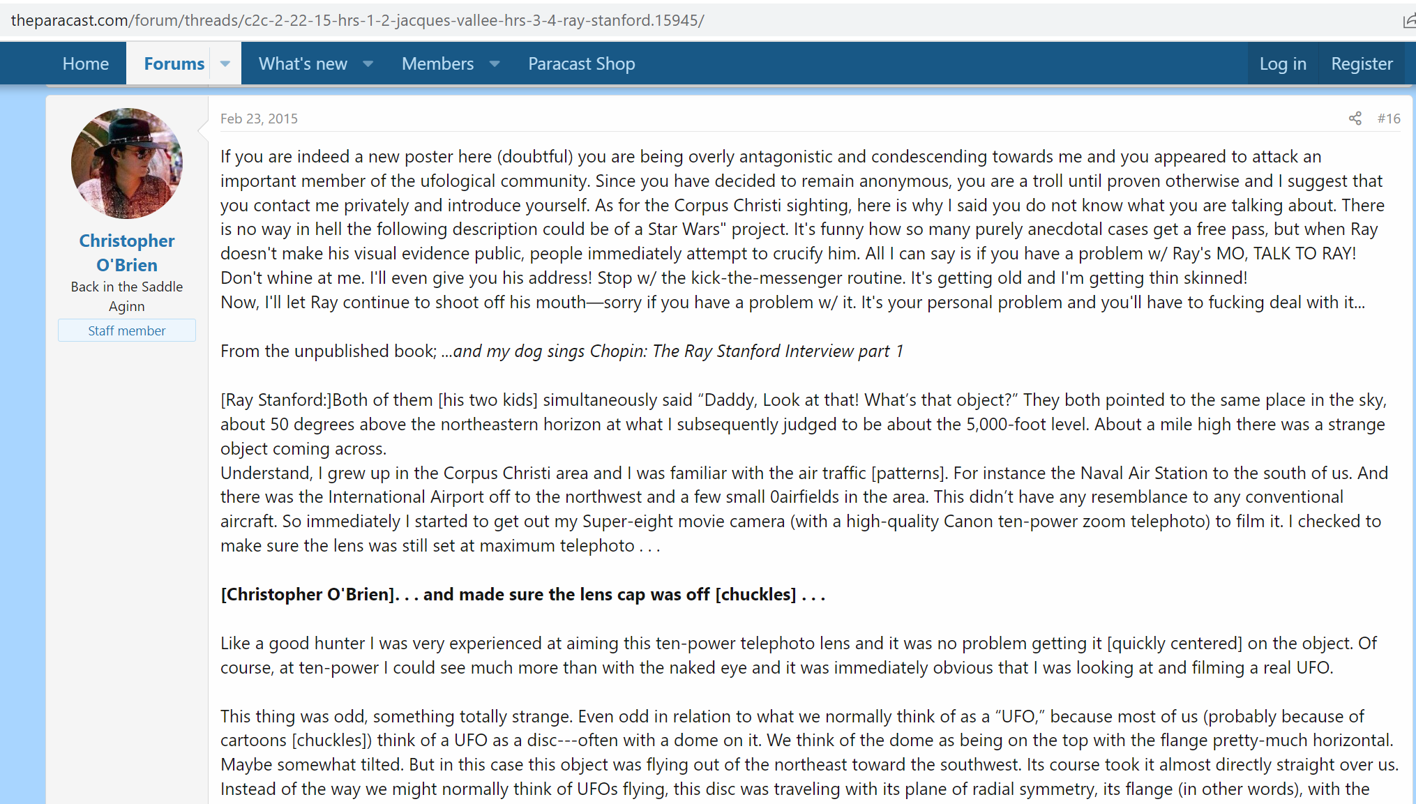 (2) Interview of Ray Stanford by Christopher O'Brien. Interview date not specified, but apparently conducted sometime in the 2002-2007 range. A transcript was posted by O'Brien on the Paracast.com forum on February 23, 2015. A link to a PDF file containing O'Brien's posted transcript is below.