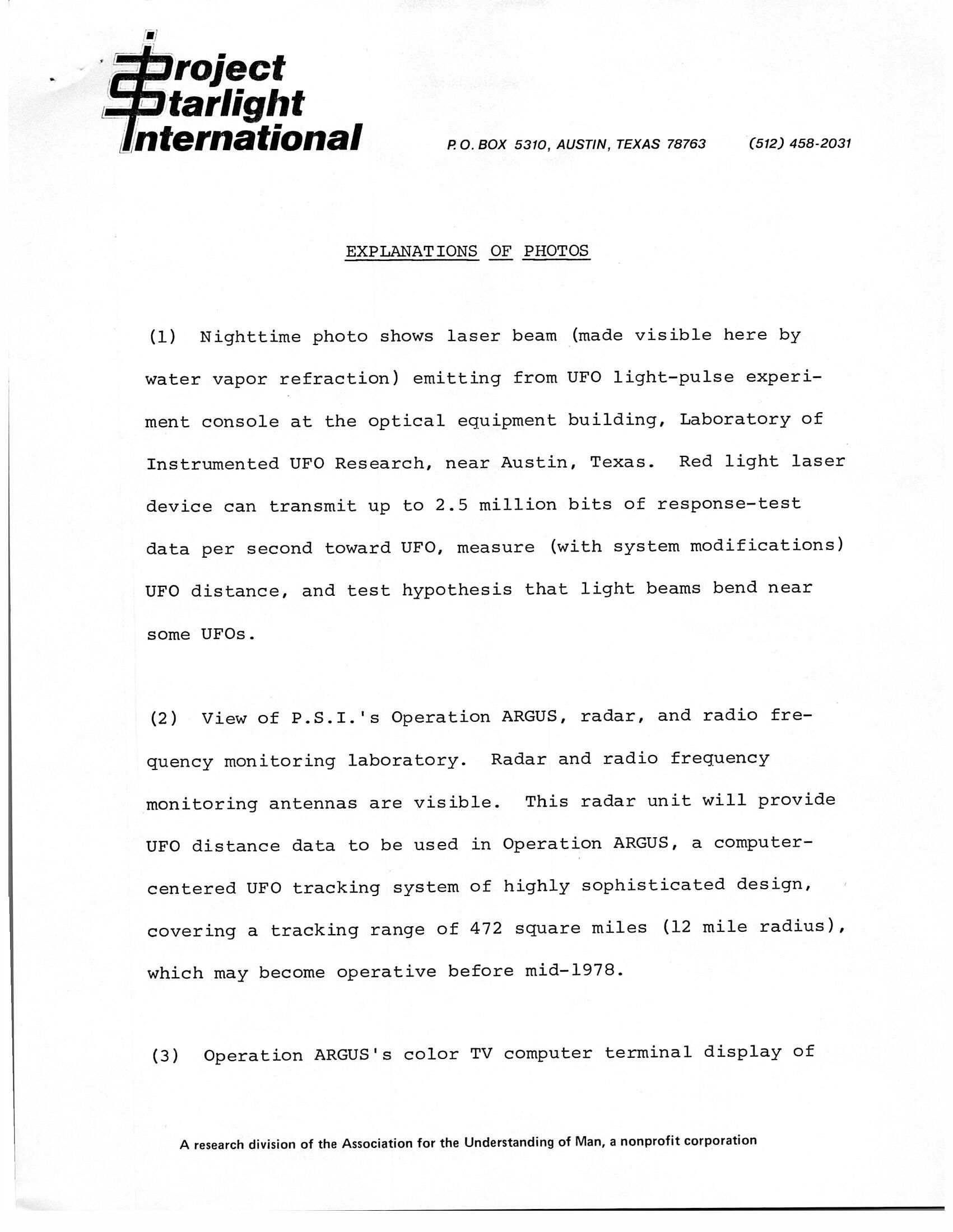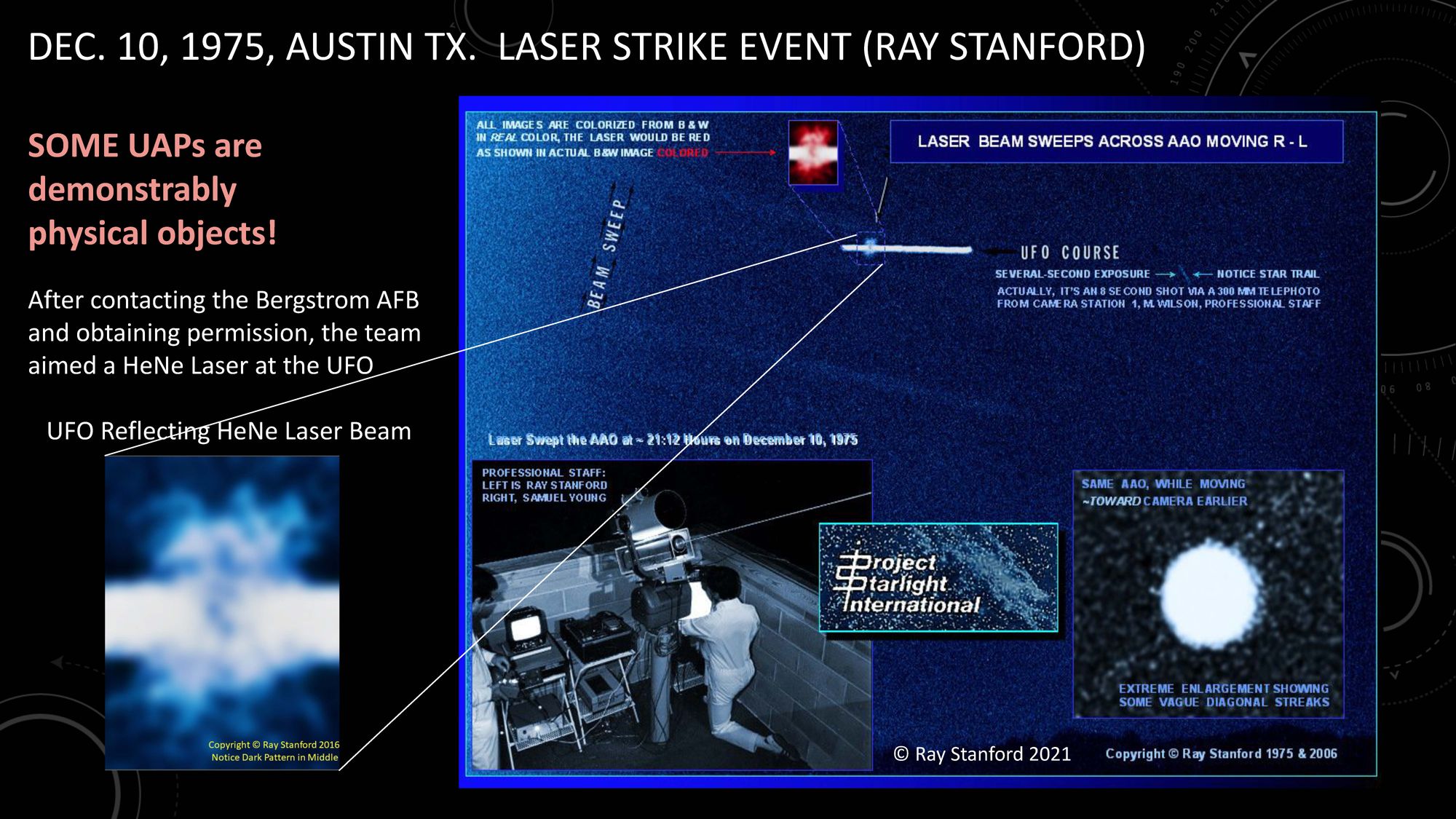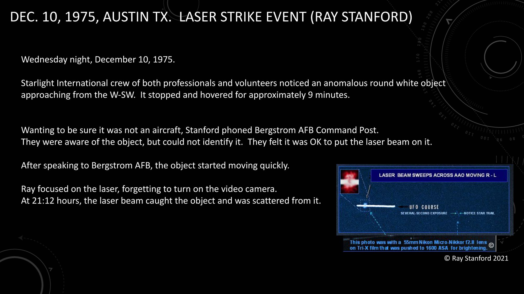 As the story is told in the submission to SCU, as a UFO hovers in the distant night sky for about 8 minutes, Stanford telephones "the Bergstrom Air Force Base Command Post" in Austin; the Air Force tells Stanford that they are aware of the UFO (e.g., are tracking it) "but could not identify it"; the Air Force authorizes Ray Stanford to shoot a laser at the UFO ("After contacting the Bergstrom AFB and obtaining permission, the team aimed a HeNeLaser at the UFO"); and a time-exposure photo shows the laser hitting the UFO ("caught the object and was scattered from it").