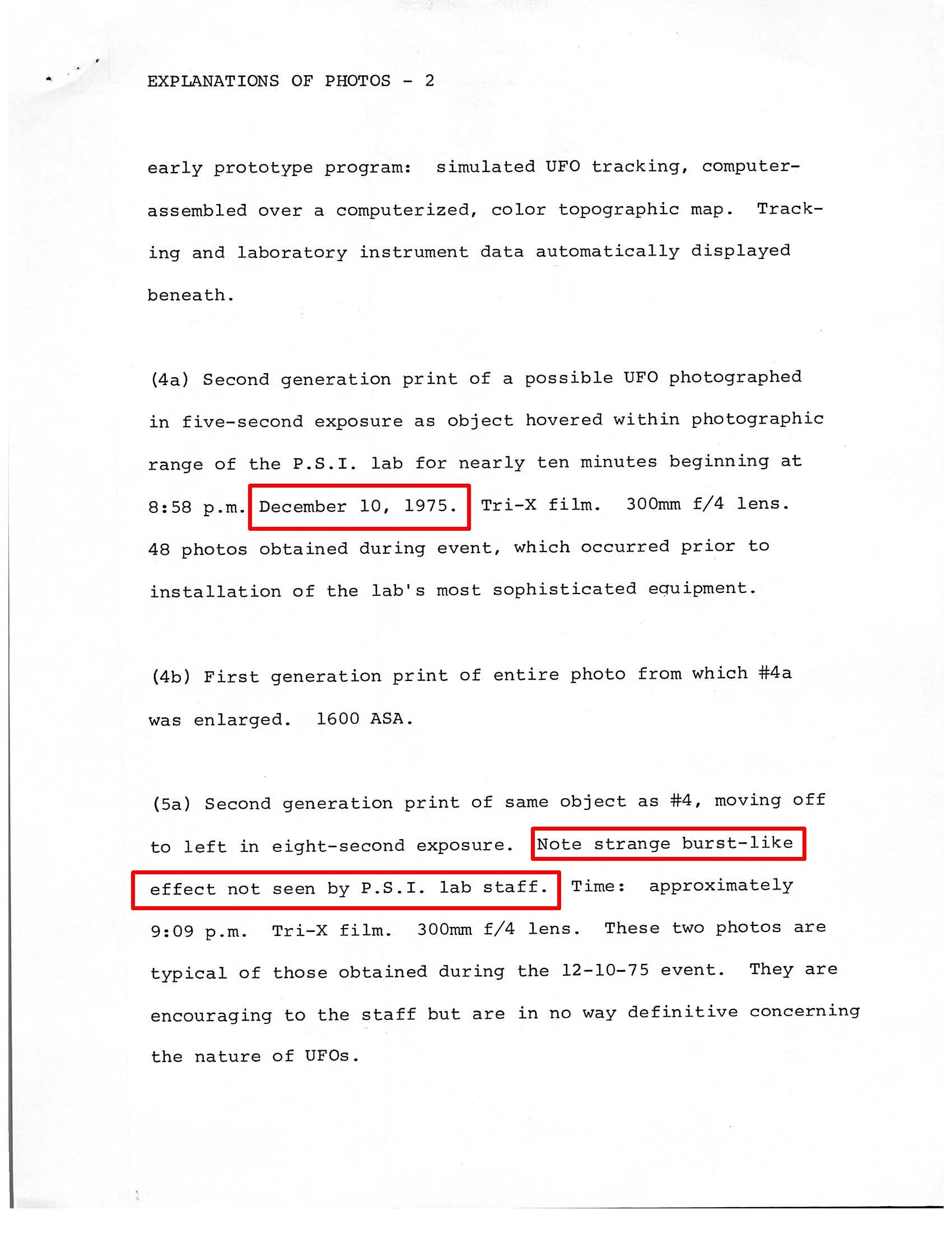 Before zooming in on the Corpus Christi event, however, we must spend some time on the matter of a sixth event depicted in the June 2021 slideshow– an event at which I was personally present and took photos, as did a number of other persons associated with Project Starlight International. The event occurred on December 10, 1975, beginning at about 8:58 PM local time, at the Project Starlight rural research site near Lake Travis, northwest of Austin, Texas. I possess detailed contemporary records relating to the incident. I consider the event to have been very likely prosaic, while Stanford then and now considered it be a UFO encounter, but the important thing to get across here is that the version that appeared in the slideshow submitted to SCU had been heavily fictionalized – by which I mean, enhanced by sensational elements that Stanford added to the story long after the fact. And I can prove it.