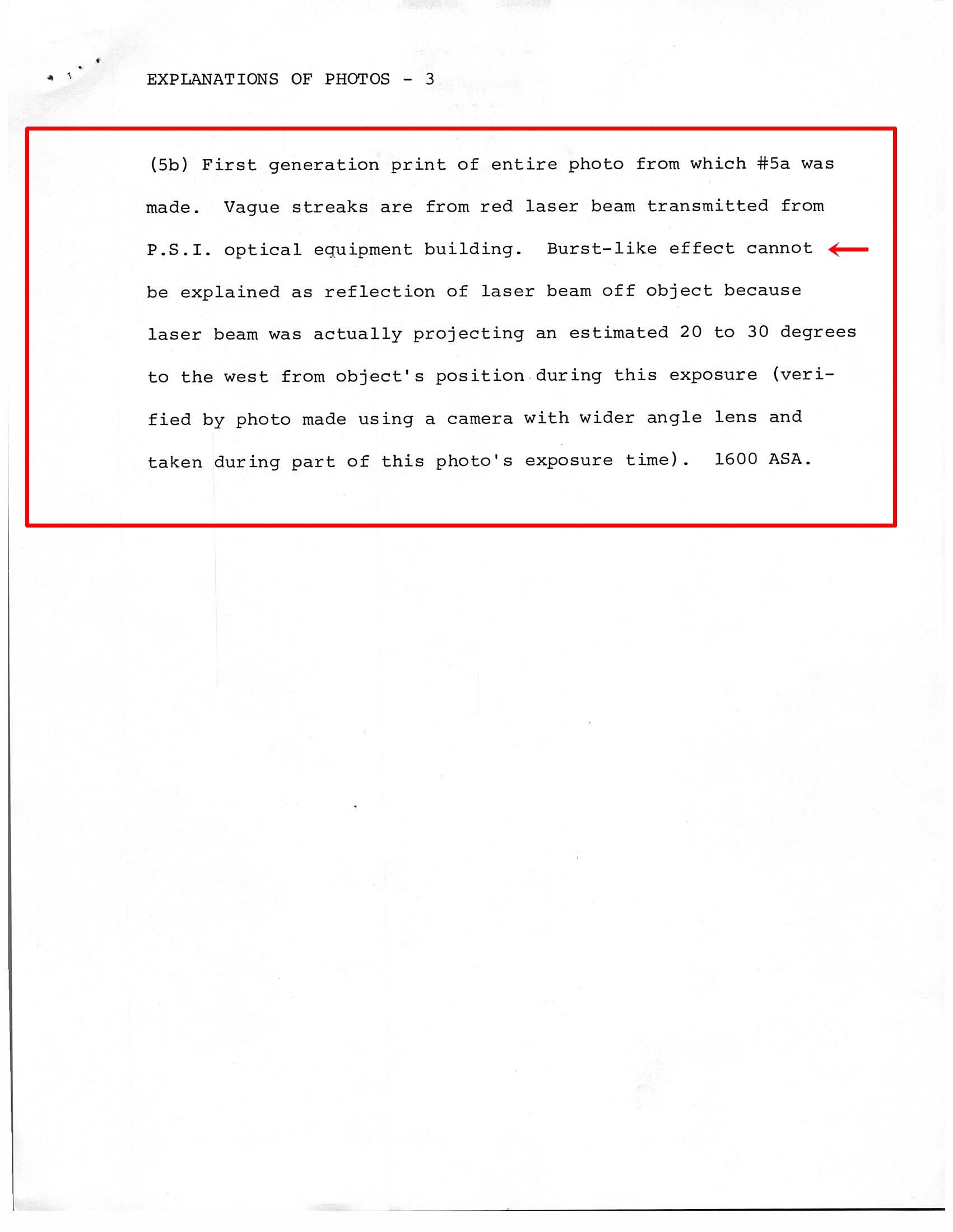 It is true that during the event, Stanford, in an excited state, was at times attempted to direct a small laser towards the distant object, but a printed Stanford release sent out to "UFO research colleagues" a few weeks later (reproduced below) explicitly stated that a "burst-like effect cannot be explained as a reflection of laser beam off object because laser beam was actually projecting an estimated 20 to 30 degrees to the west from the object's position during this exposure (verified by photo made using a camera with wider angle lens and taken during part of this photo's exposure time)."
