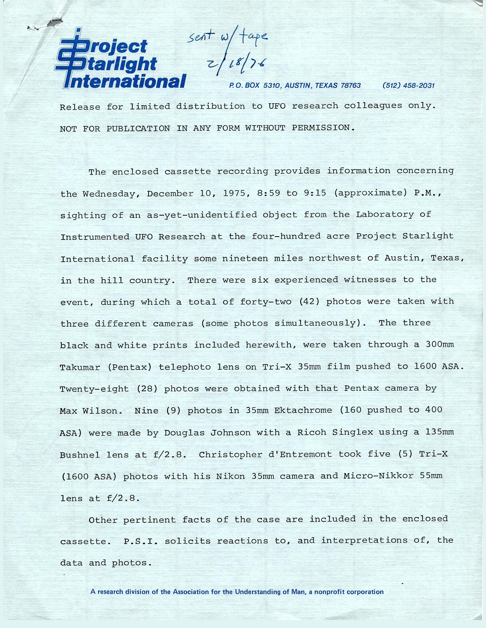 In an audio cassette recording sent to a list of "UFO research colleagues" on February 18, 1976, Stanford said, "We do not think it is a strong UFO case," but that information about it was being shared anyway because of some odd elements. Stanford also said that the laser could not have hit the object (consistent with the printed statement). Stanford also mentioned, accurately, that he had called the Bergstrom radar tower within an hour after the event, with Stanford telling the tower that the team had observed an object in the same apparent position for seven minutes; the response from the tower, as reported by Stanford, was that they did not bring their planes in along that path (which was not news to us). There was on this recording, of course, no mention by Stanford of the Air Force confirming tracking the object, or giving Stanford permission to shoot it with a laser (if any of those manifestly improbable things had really happened, we would have been talking about nothing else back then).