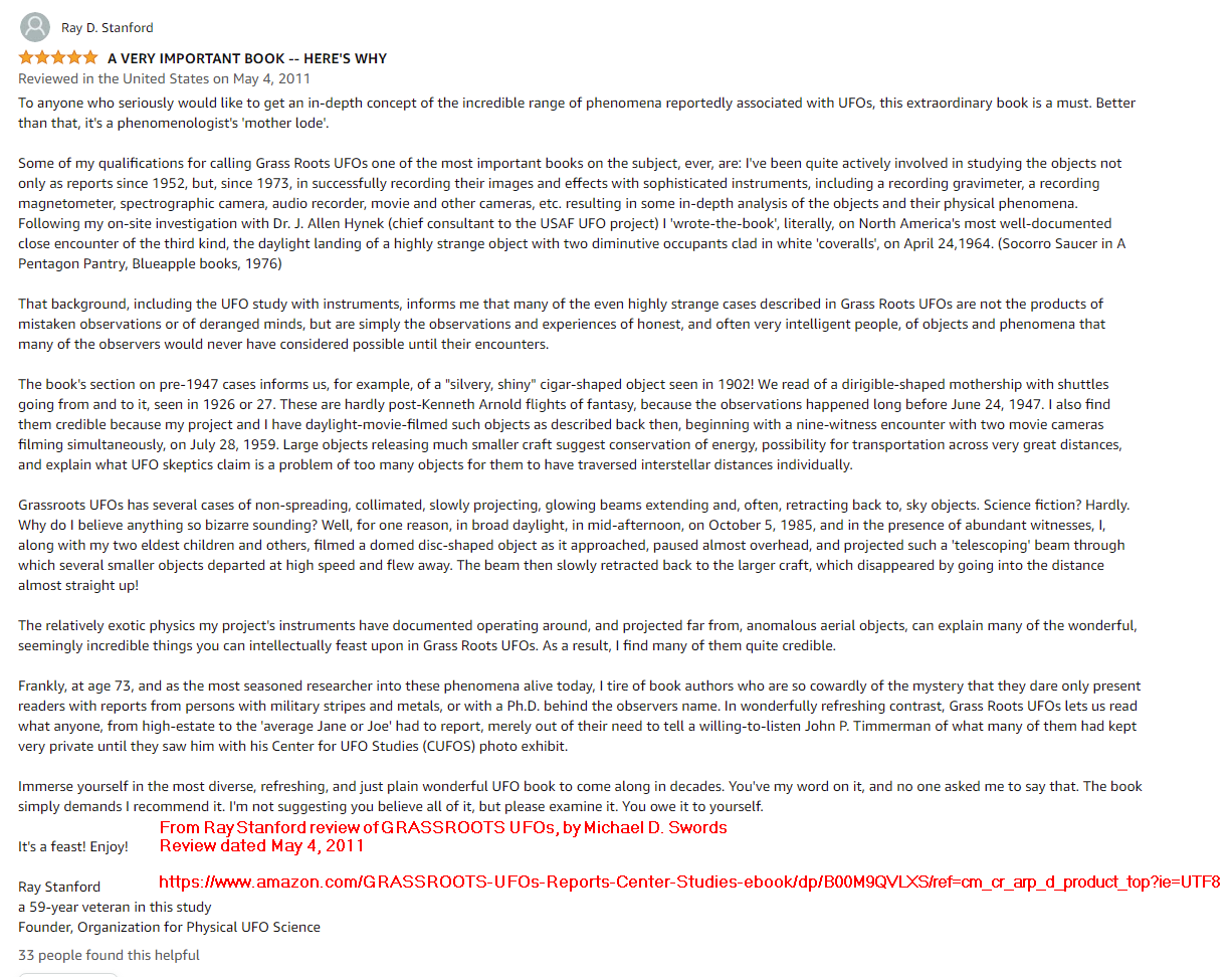 I hold no PhD – and yet, I have some well-informed questions on this matter, and some very pertinent contextual facts. They are, in my view, among the questions and contextual facts that ought to be considered carefully by any author, co-author, editor, peer-reviewer, forensic analyst, field investigator, or journalist who is considering whether anything useful to science can be extracted from the Ray Stanford film.