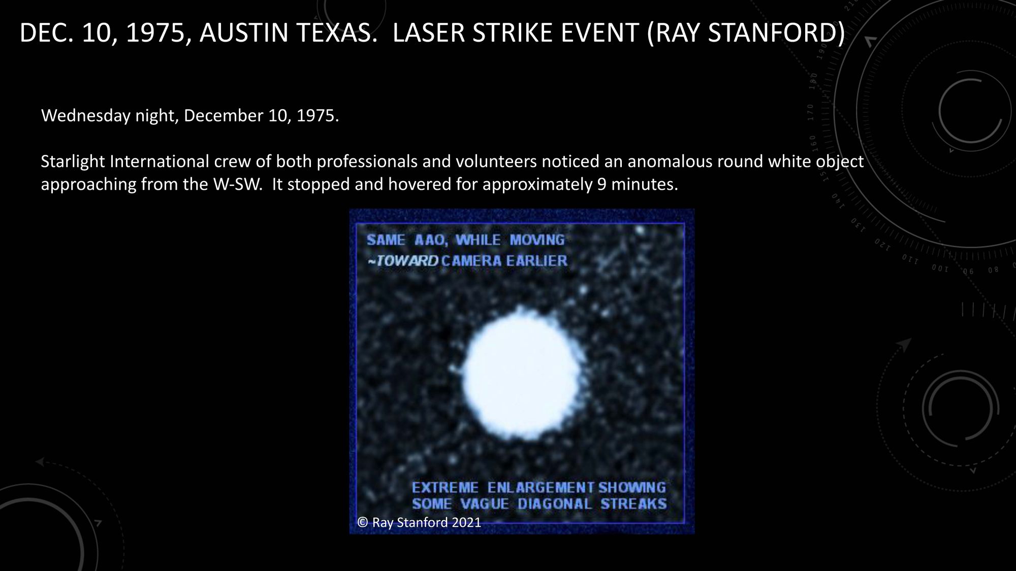 I believe that the presentation of these unsubstantiated images and claims to the public was ill-advised, particularly in view of Ray Stanford's six-decade-plus history of disseminating a great many UFO-alien-related claims that have collapsed under critical scrutiny, been repudiated by Stanford himself, or that otherwise can be shown to be false. For example, Stanford earlier provided to Knuth graphic depictions and startling claims regarding a December 10, 1975 "UFO" event, labeled the "LASER STRIKE EVENT." I know that the account provided by Stanford was heavily fictionalized, because I was present for the event itself. In Section 6 of this article, I present some of the contemporary records that demonstrate that the most sensational aspects of Stanford's presentation were fabricated or imagined by Stanford long after the event.