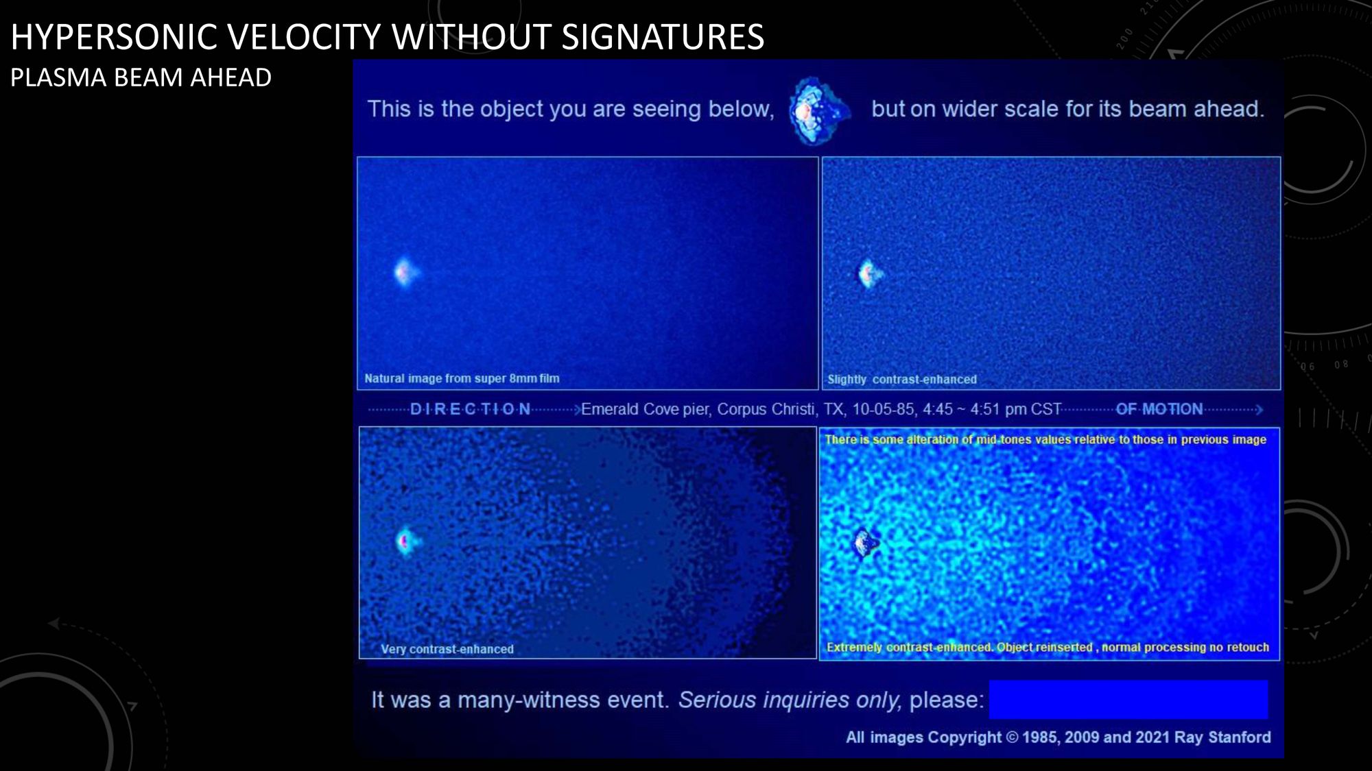 QUESTION: Will those scrutinizing the Stanford film of October 5, 1985, get to the bottom of Stanford's claim pertaining to "plasma penetration" radar images?