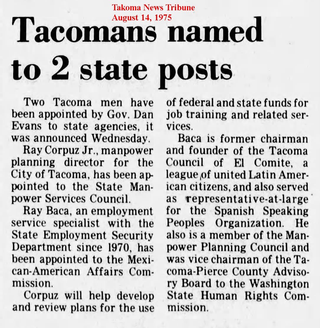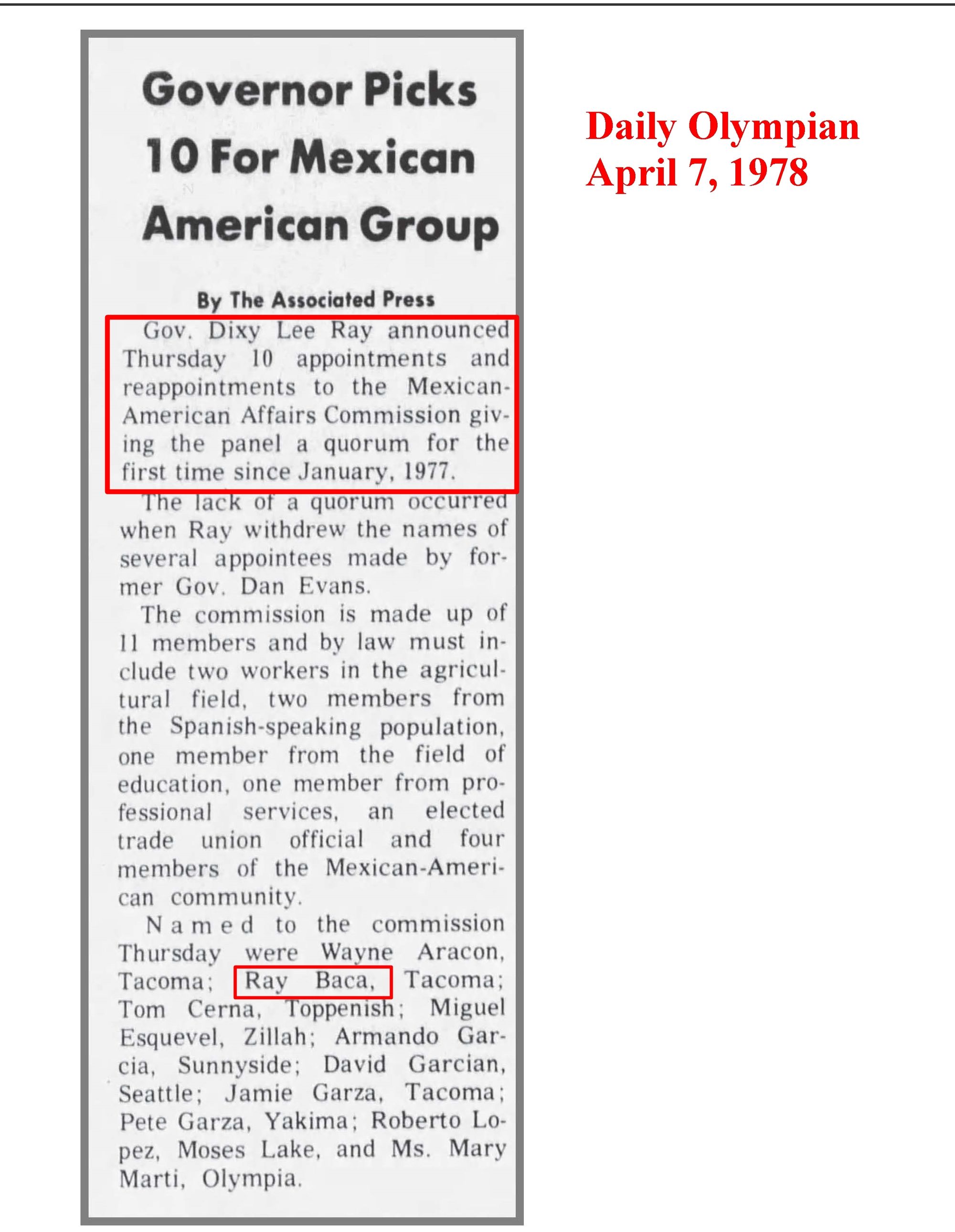 However, Baca’s stature in the Tacoma Hispanic community became sufficient that in 1976, Governor Dan Evans (a Republican who served as governor from 1965-1977) nominated Baca to an unpaid seat on an 11-member advisory panel called the Mexican-American Affairs Commission, for a term that was to end July 1, 1979. A short news article in the News Tribune of August 13, 1975, reported on the appointment of “Ray Baca" (as he was then known), who was identified as “an employment service specialist with the State Employment Security Department since 1970.” That was the state agency responsible administering unemployment benefits.