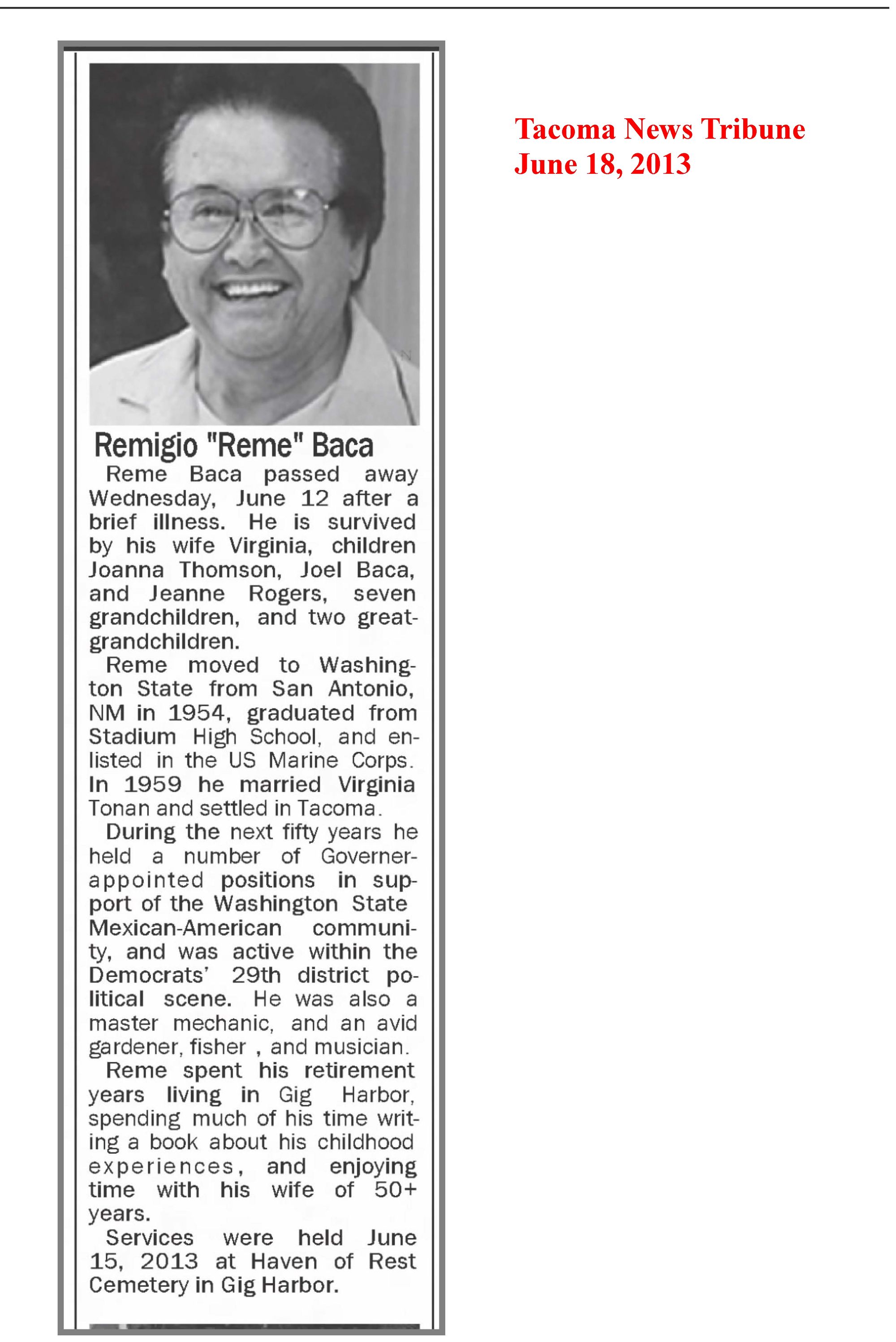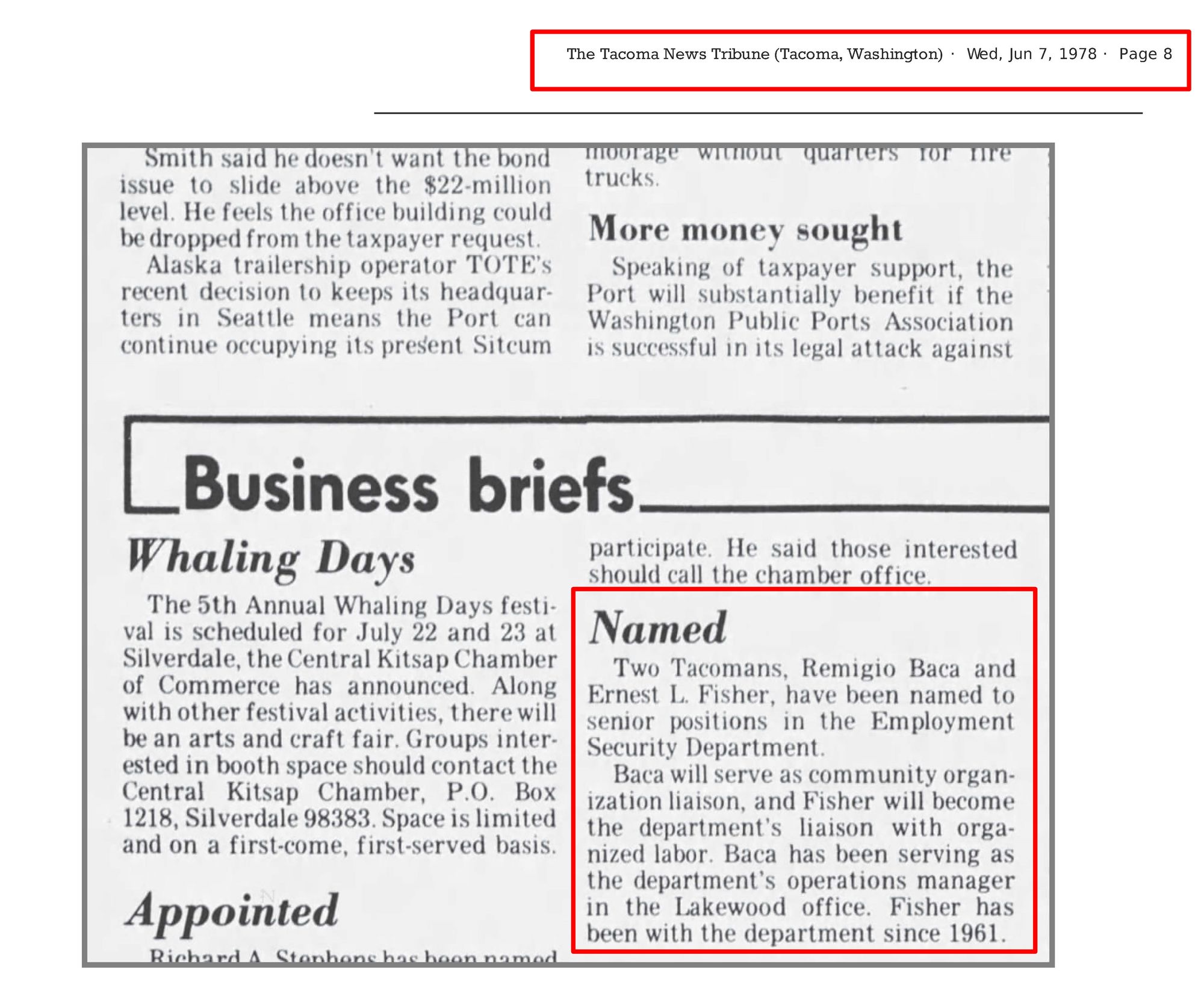 On June 7, 1978, the Tacoma News Tribune ran a very short item, probably based on a press release, that “Remigio Baca” was one of two persons “named to senior positions in the Employment Security Department” (the state agency handling unemployment benefits). “Baca will serve as community organization liaison...Baca has been serving as the department’s operations manager in the Lakewood office.”