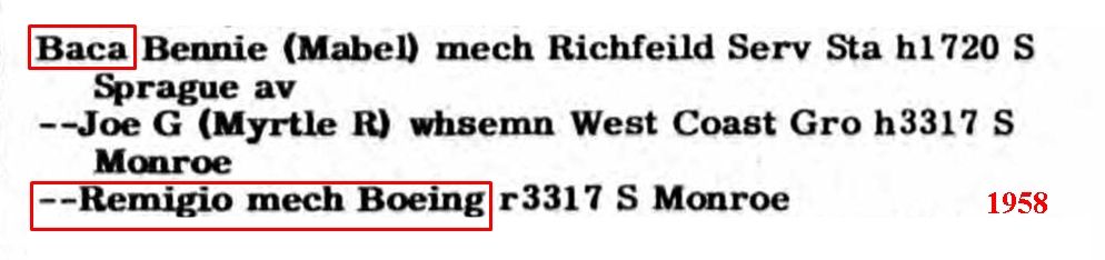 Baca was employed by the Boeing Company as a mechanic in 1958. He later said it was in the “military division.” (“...where he had worked on all types of military and commercial air craft, including Air force One.” Born on the Edge of Ground Zero, p. 72.)