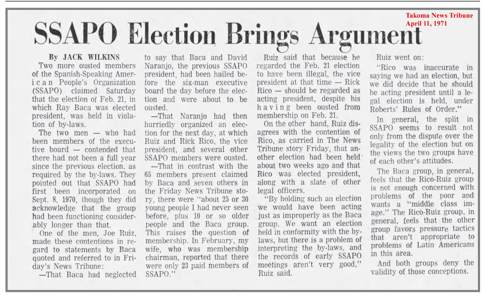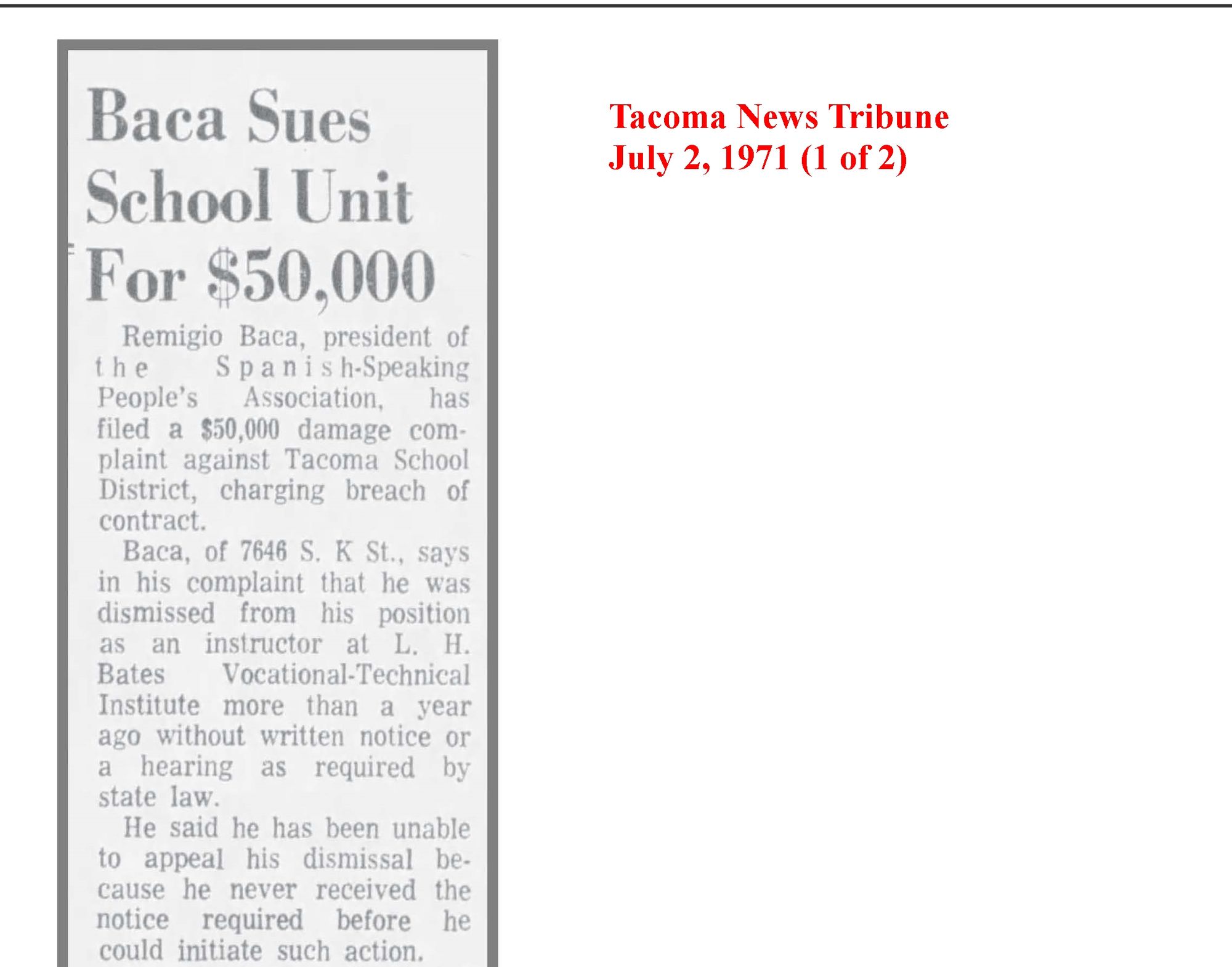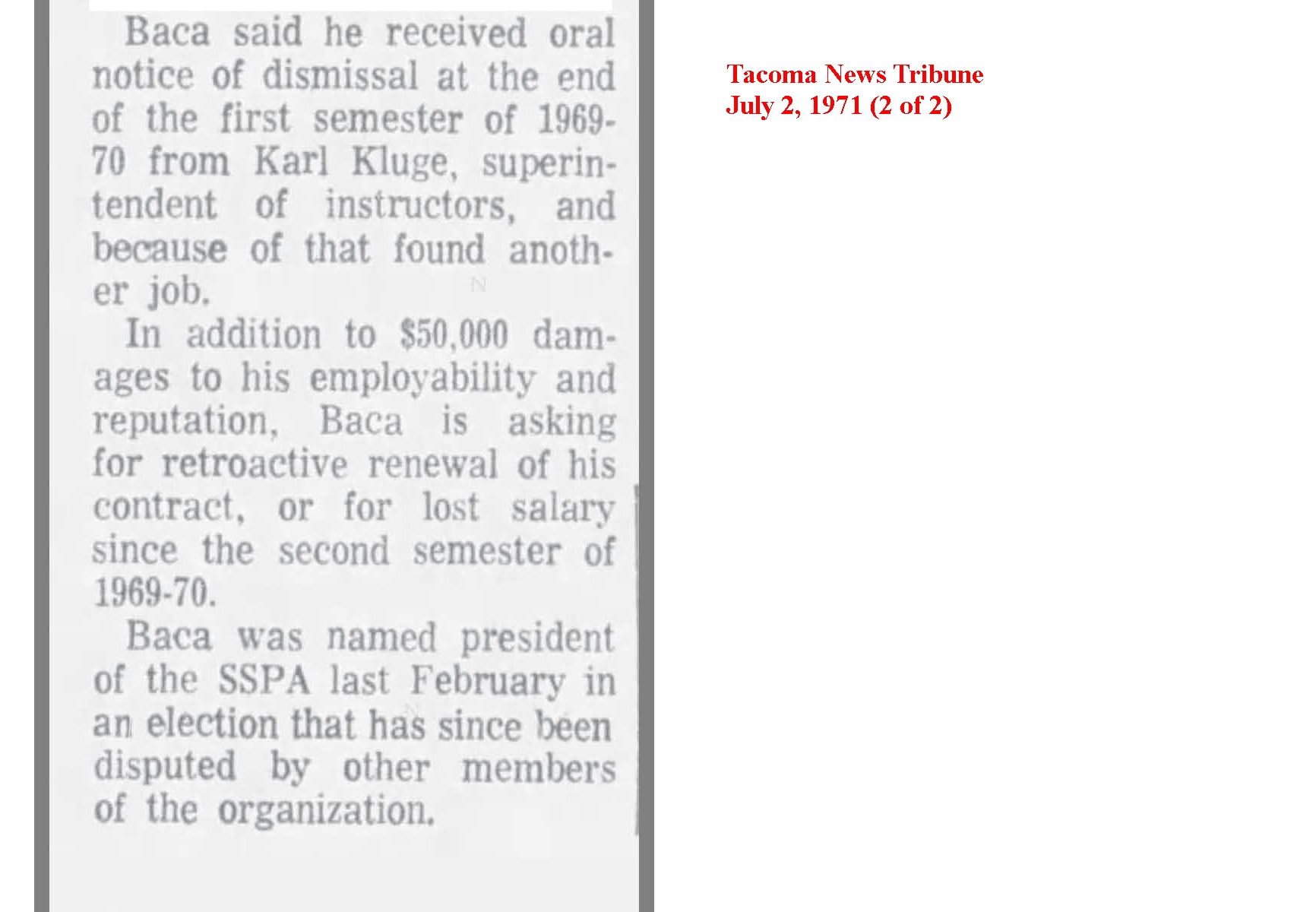 For example, a report in the July 2, 1971 issue of the News Tribune, a Tacoma newspaper, identified Baca as “president of the Spanish-Speaking Citizens Association.” The article said, “Baca was named president of the SSPA last February in an election that has since been disputed by other members of the organization.” The same article said that Baca had filed a $50,000 lawsuit against the Tacoma School District, alleging that he has been dismissed as an instructor at the L.H. Bates Vocational-Technical Institute “without written notice or a hearing as required by state law.”