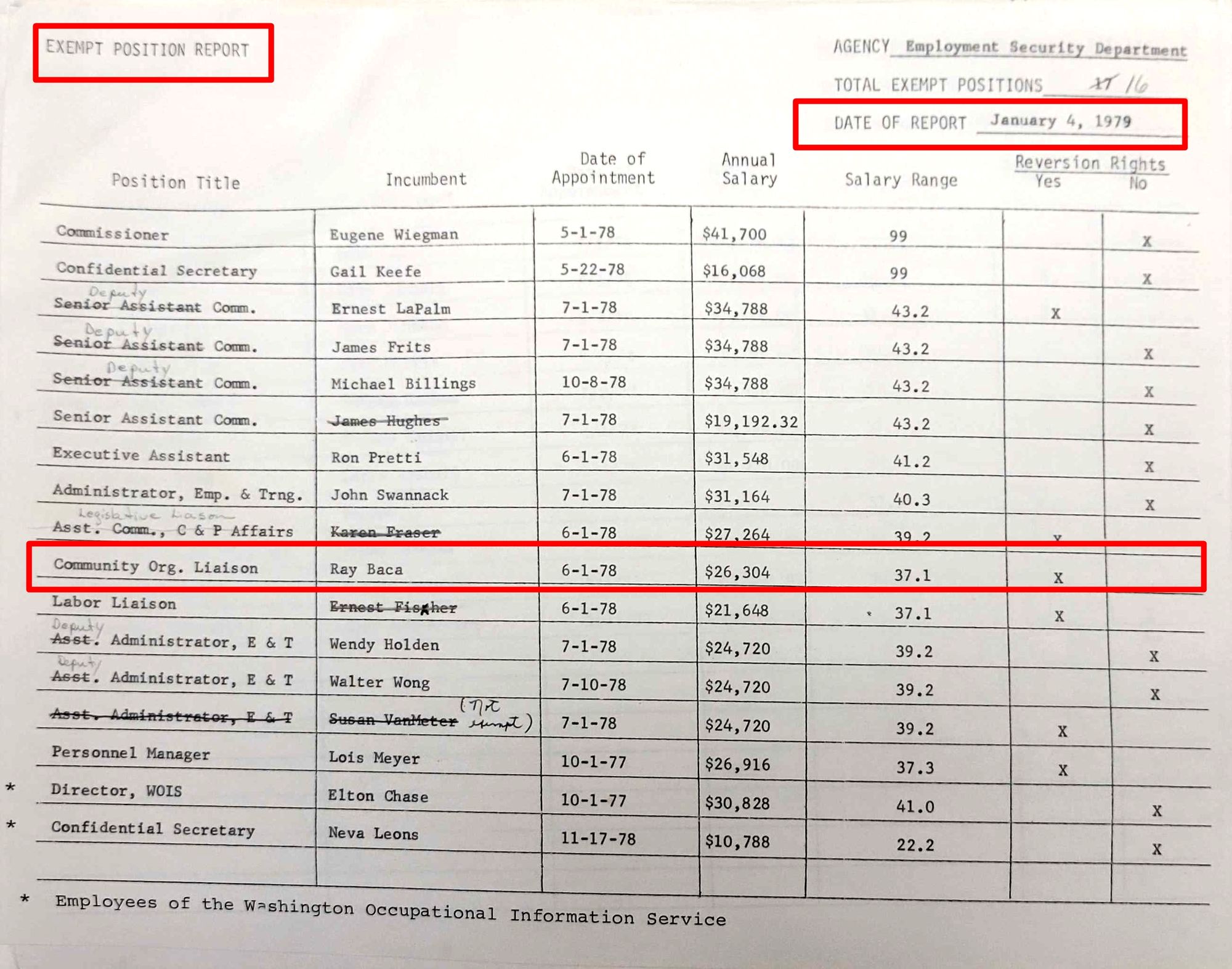 The Hoover Institute Library and Archives archivists found a roster dated January 4, 1979, listing the “exempt” employees in the Employment Security Department. On the roster, a total of 16 titled jobs were deemed “exempt.” Ray Baca was listed as “Community Org. Liaison,” consistent with the Tacoma News Tribune article of the previous June. I have embedded an image of that document below.