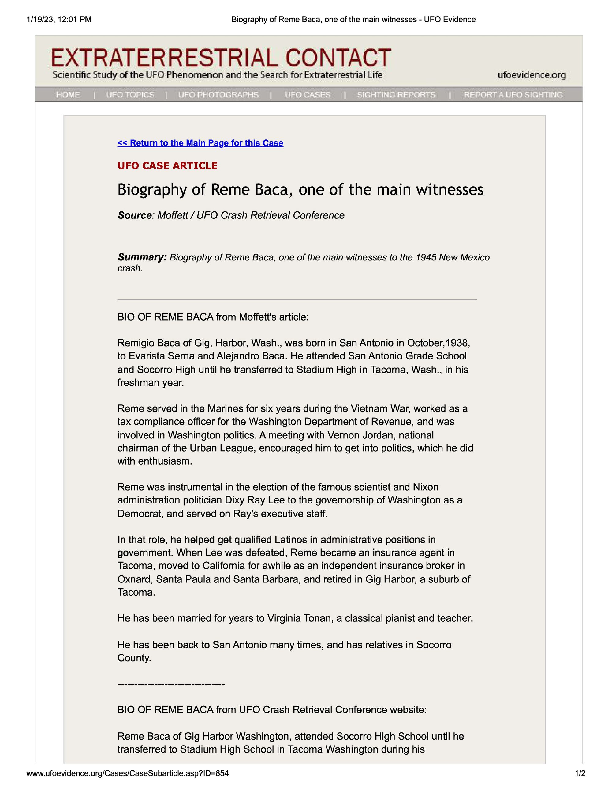 Was Remigio (Reme) Baca (“Ray Baca”), who claimed to be an eyewitness to a UFO crash in New Mexico in 1945, later a political heavyweight in Washington State, responsible for the election of Dixy Lee Ray as governor in 1976? Was Baca ever a close associate of Governor Ray and a member of the governor’s “executive staff”?