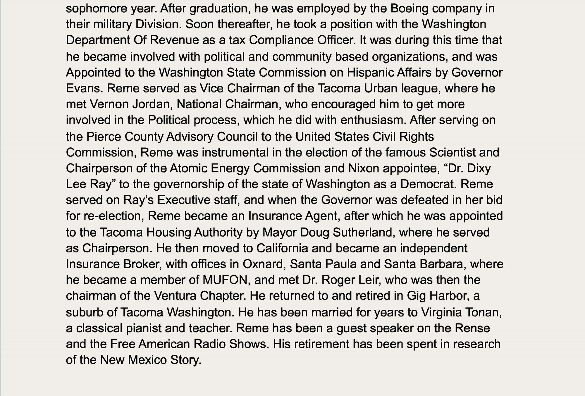 Some other amplifiers of the Trinity story have accepted such representations at face value. Ben Moffett, the writer for the Mountain Mail who was the first to write up the Baca-Padilla UFO crash story in 2003, wrote that “Reme was instrumental in the election [of Governor Ray]...and served on Ray’s executive staff.” However, in 2015 Moffett wrote that in his articles, he merely reported what Baca and Padilla had told him.