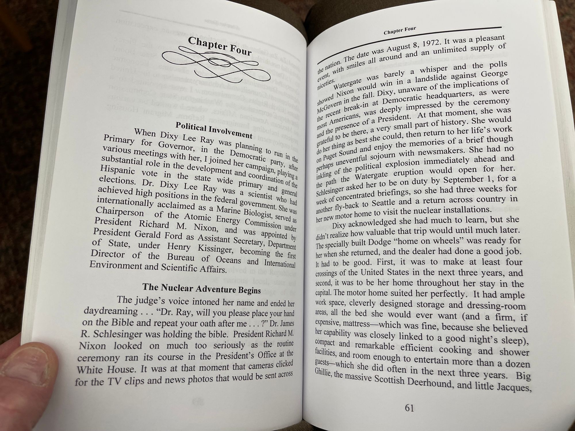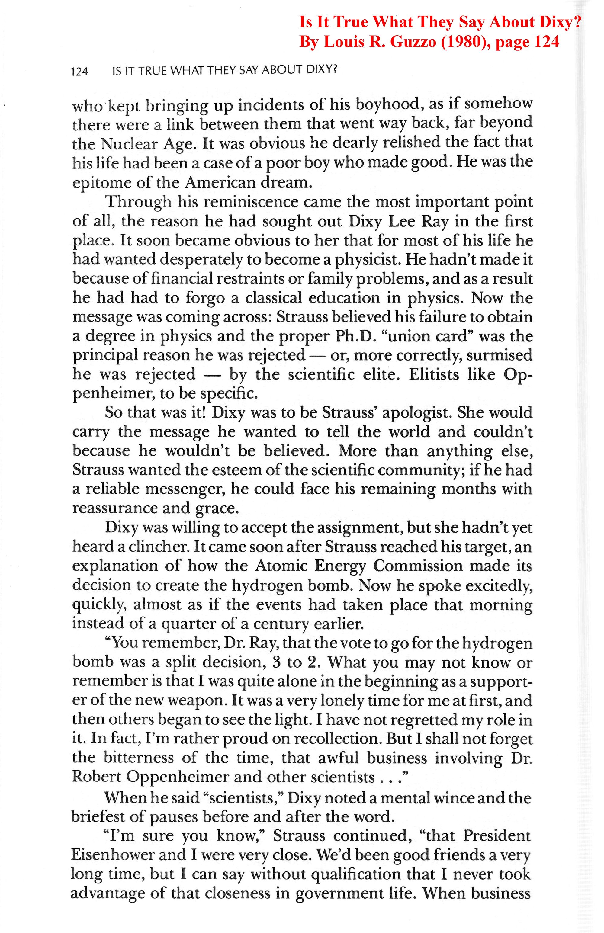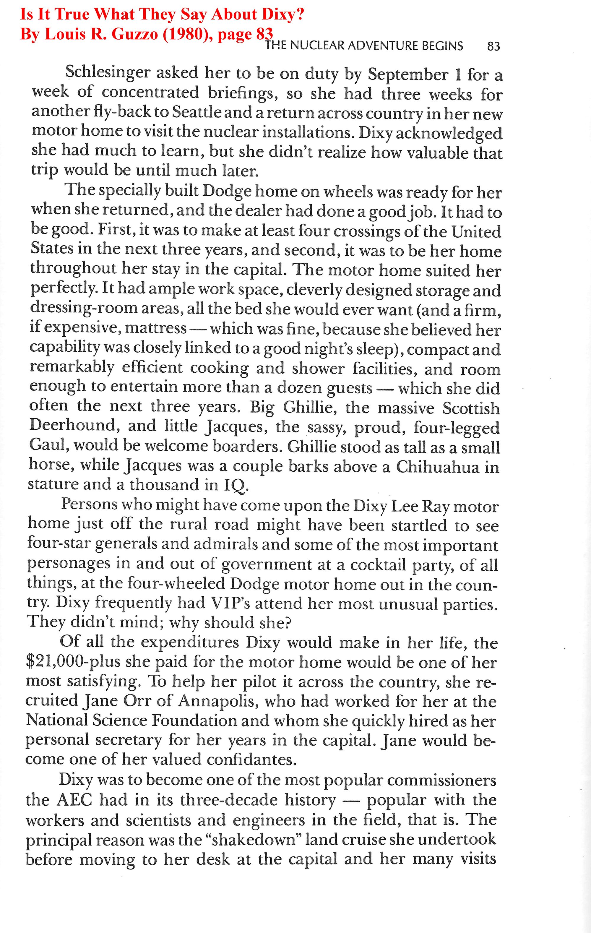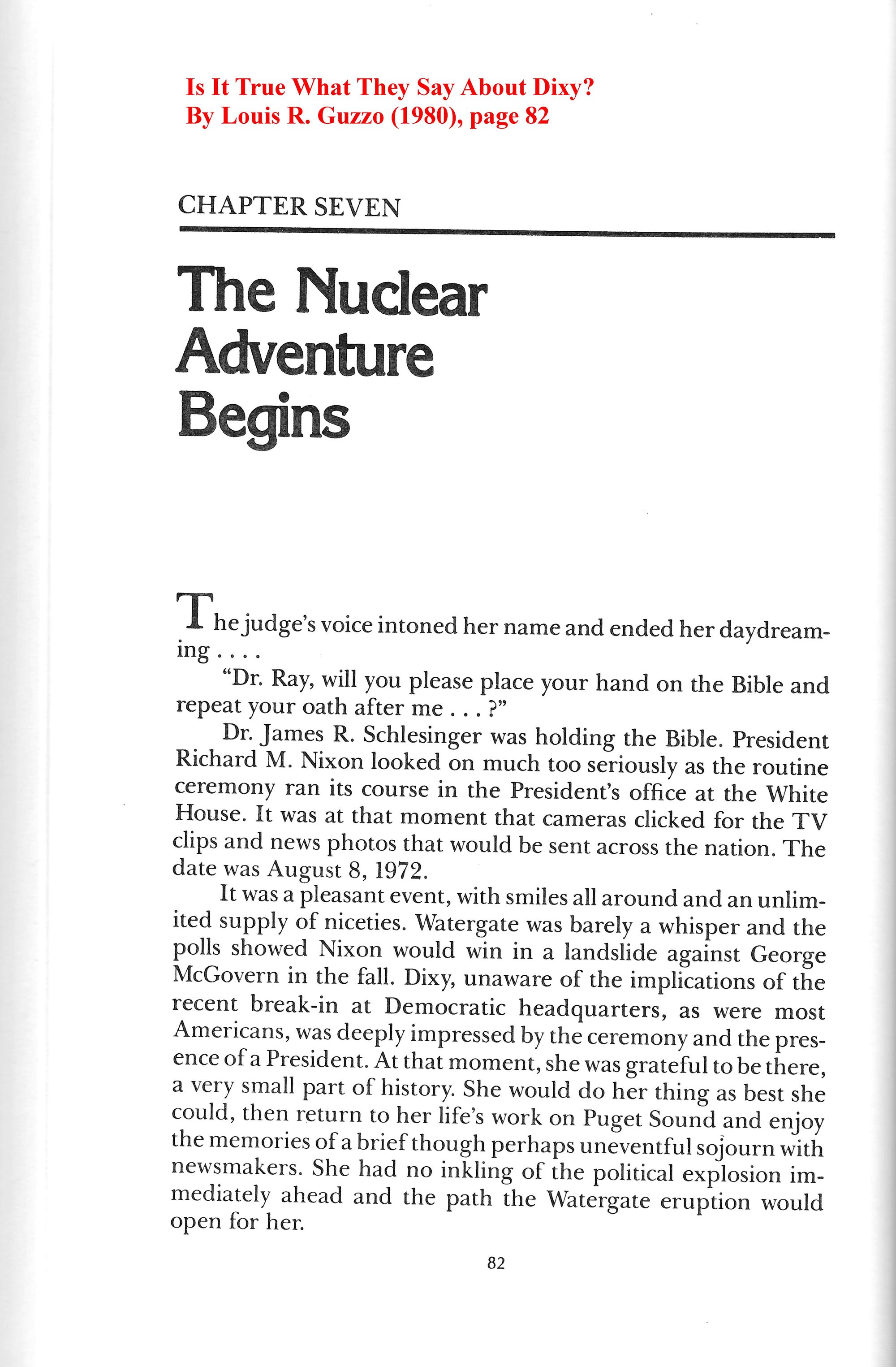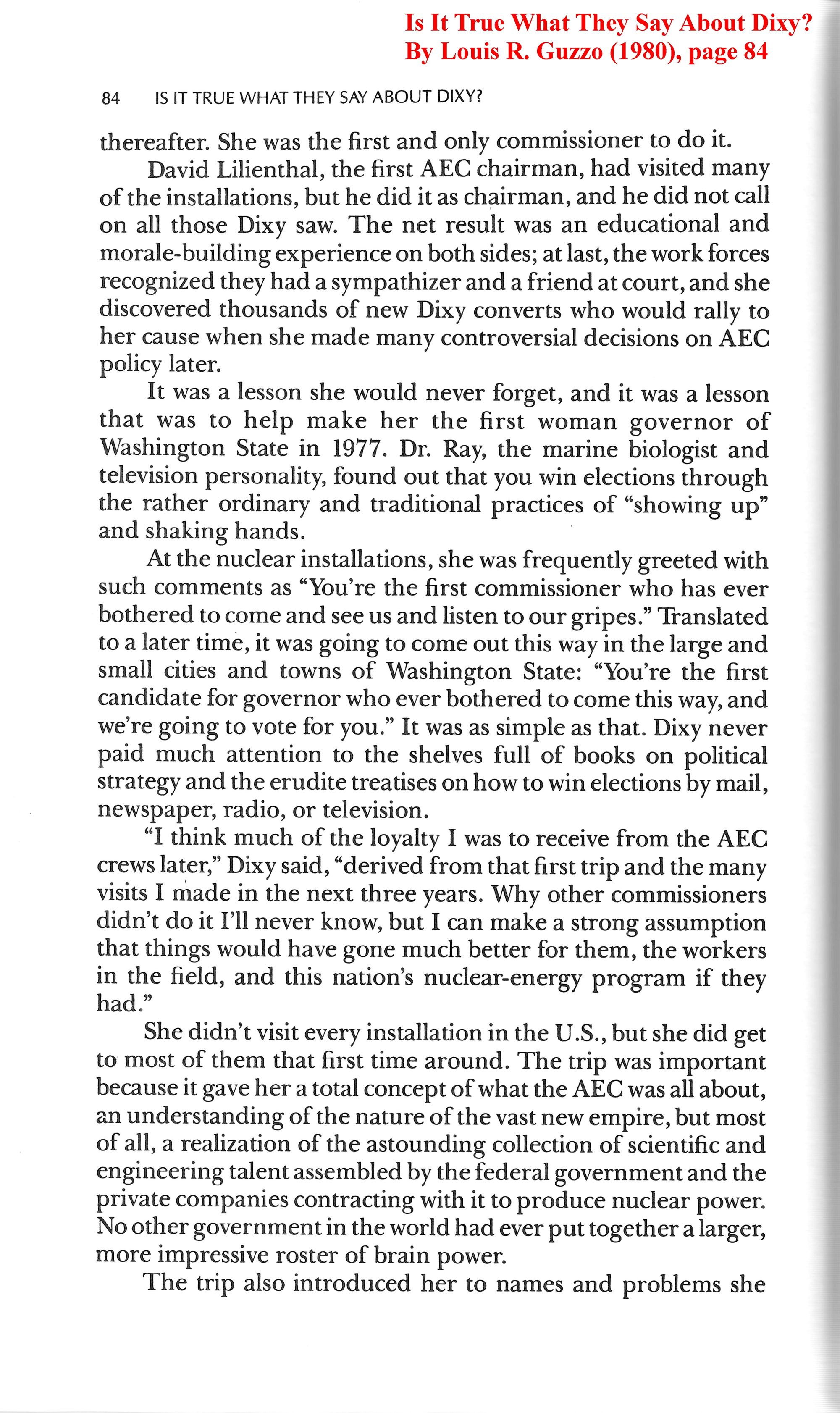 In reality, however, the approximately six pages of that material was lifted virtually verbatim, without attribution, from a biography of Ray that written by Louis R. Guzzo, who was perhaps Dixy Lee Ray’s closest professional associate during this entire era.