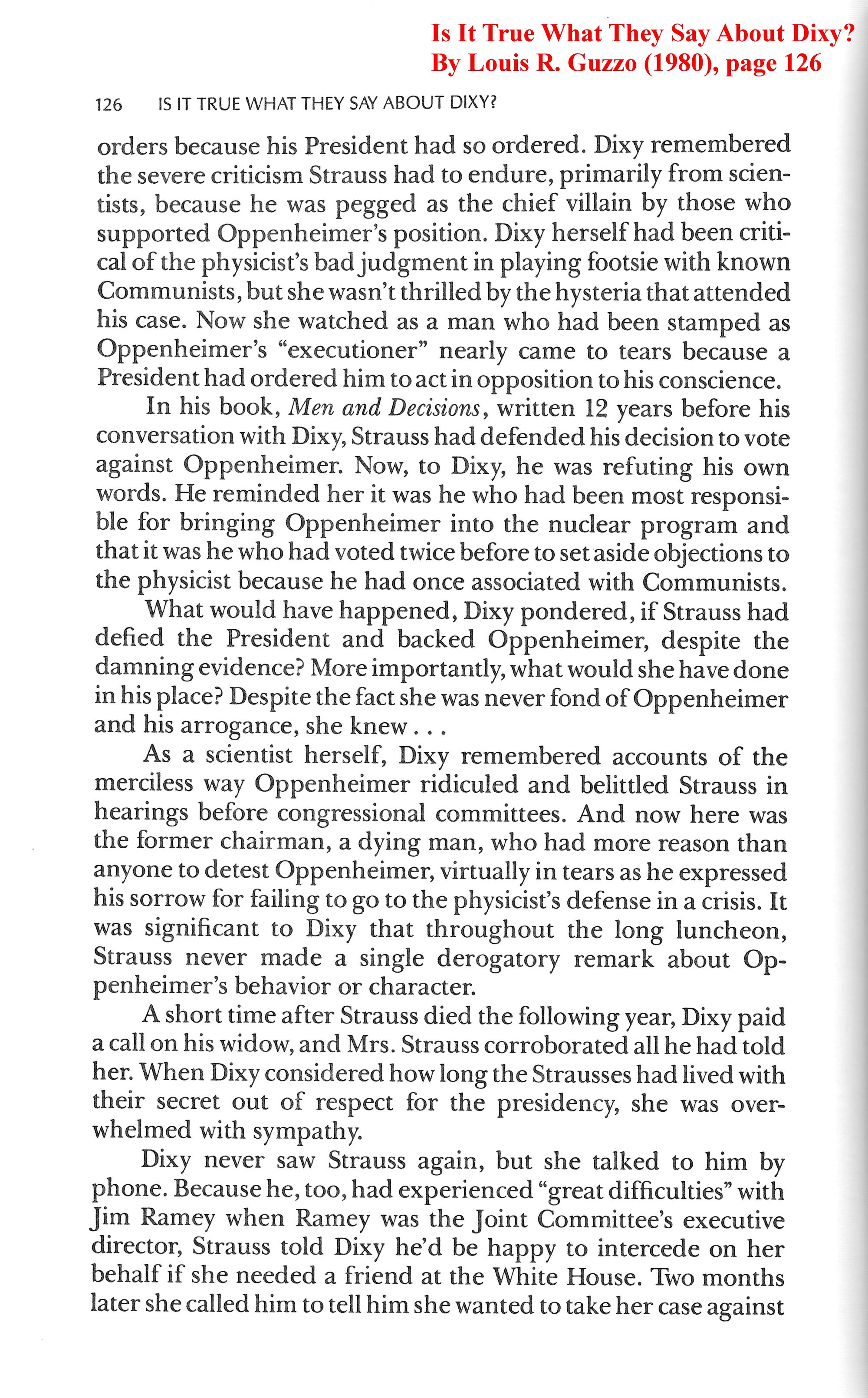 However, what immediately followed that statement in the book are over six pages of detailed information about experiences that Dixy Lee Ray had when she was on the Atomic Energy Commission, including an involved “inside story” relating to J. Robert Oppenheimer. Baca presented this material seamlessly and without attribution, in a way that could only lead the reader to believe that Baca was relaying information that he had heard directly from Dixy Lee Ray or from her close associates.