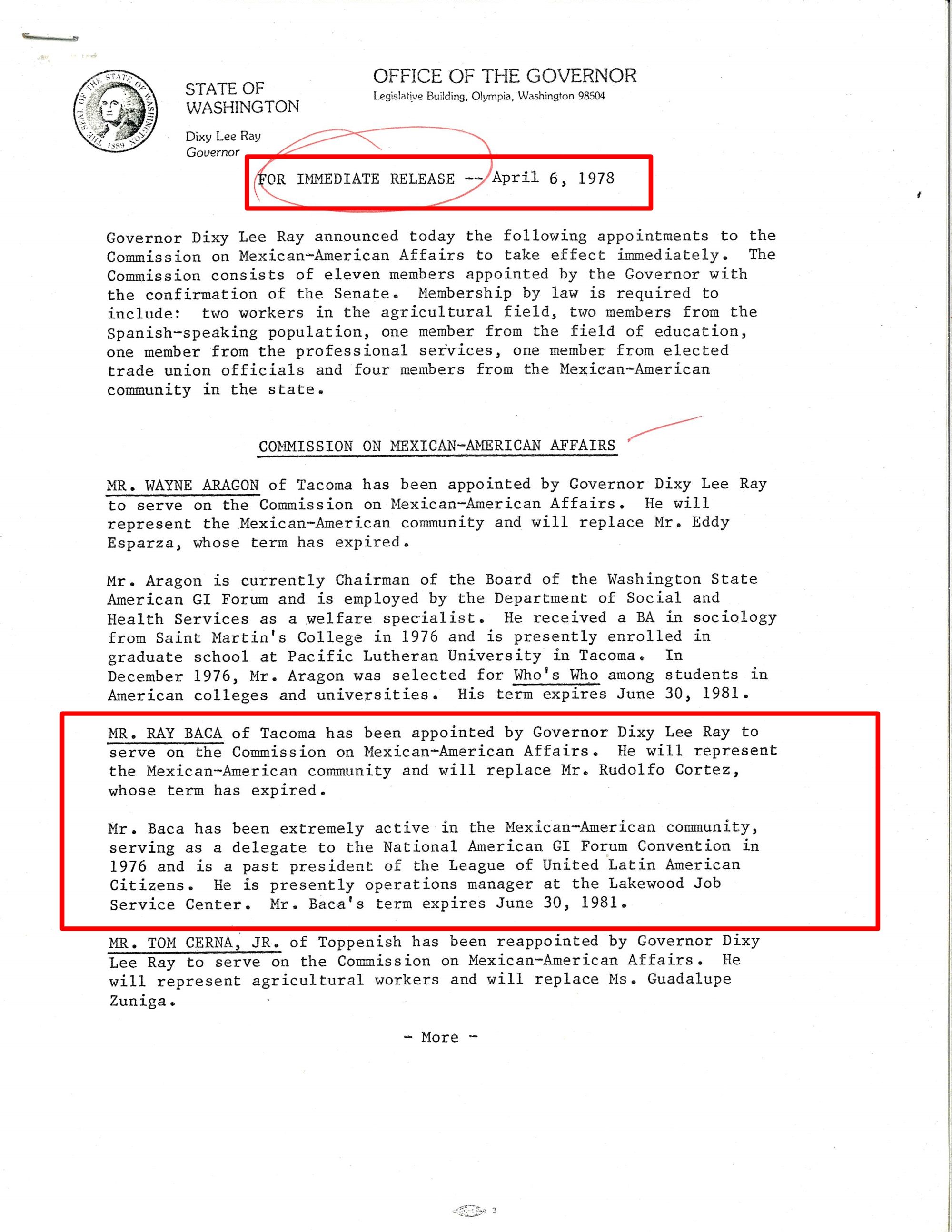I found that Baca was a pretty marginal figure in the Washington State political world, and a fairly minor volunteer player in the 1976 political campaign of Dixy Lee Ray for governor of Washington State. Baca, a local Hispanic activist in Tacoma, was one of two people designated as volunteer coordinators to seek support for Ray in the Hispanic community. As discussed below, Baca did apparently reap some rather minor rewards for his support for Ray’s campaign, mainly a promotion in the state unemployment-benefits agency in which he was already employed, and a nomination to an unpaid 11-member advisory body called the Mexican-American Affairs Commission.