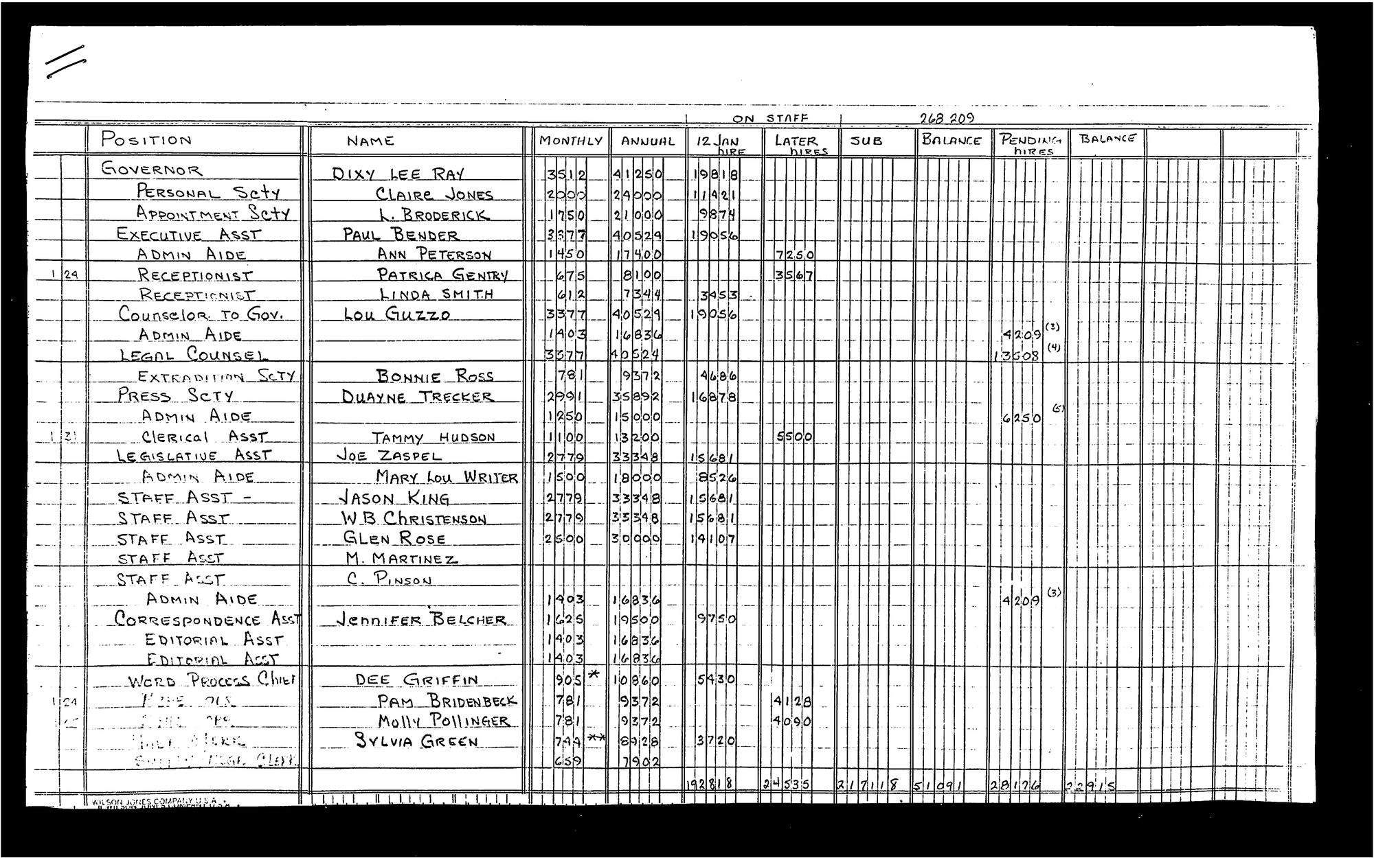 Governor Ray’s executive assistant, Paul C. Bender, wrote a memo dated February 15, 1977, “Subject: Organization of Immediate Office of Governor Ray,” to which he attached “Personnel in the Office of Governor Dixy Lee Ray,” listing 35 positions and 32 names. Ray Baca’s name did not appear.
