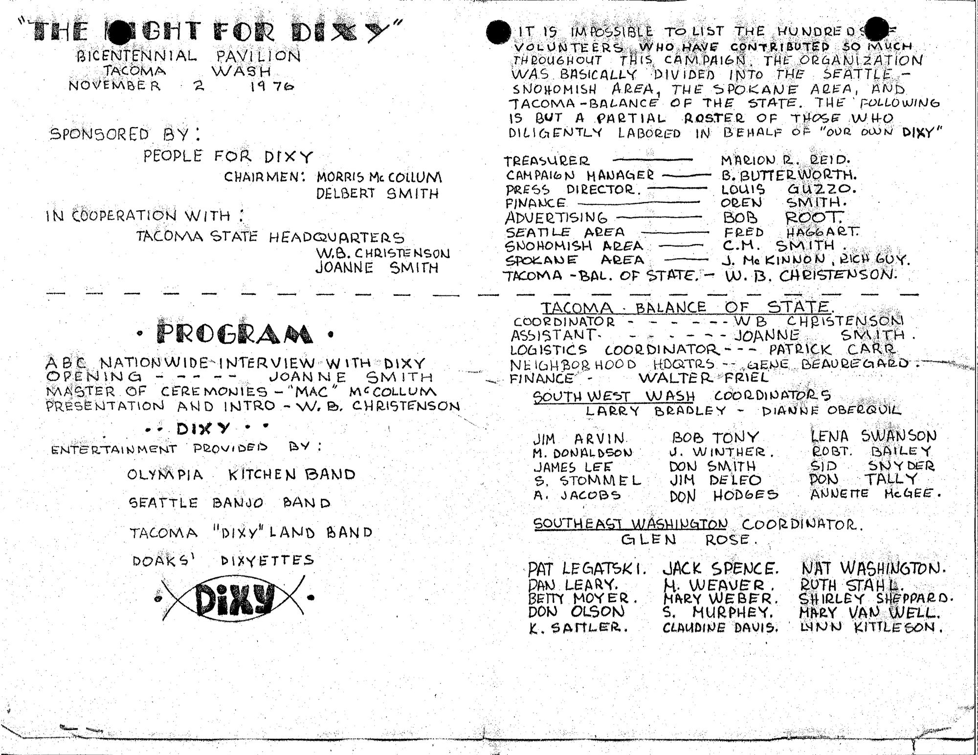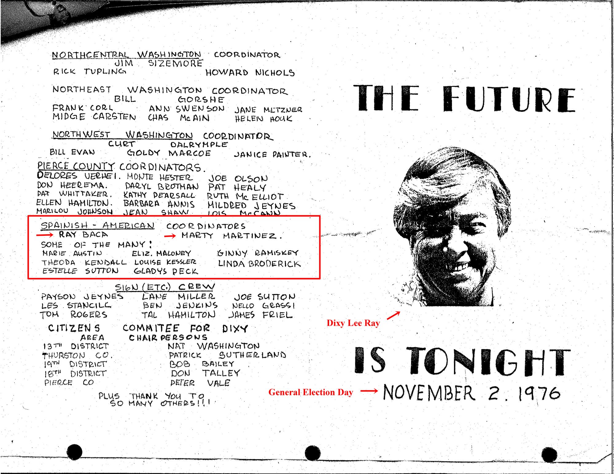 However, among the documents that I obtained from the Washington State Archives was a flyer produced by a campaign committee, “People for Dixy,” and by the Tacoma State Headquarters for the Ray campaign, promoting an election-night event (November 2, 1976). The flyer, embedded below, lists key staff (both paid and volunteer) for the entire statewide Dixy Lee Ray gubernatorial campaign. The name of “Ray Baca” does not appear among the rosters of the top statewide campaign personnel. However, “Ray Baca” is listed as one of two “Spanish-American Coordinators.” (See the red highlighting that I have placed on the image.)