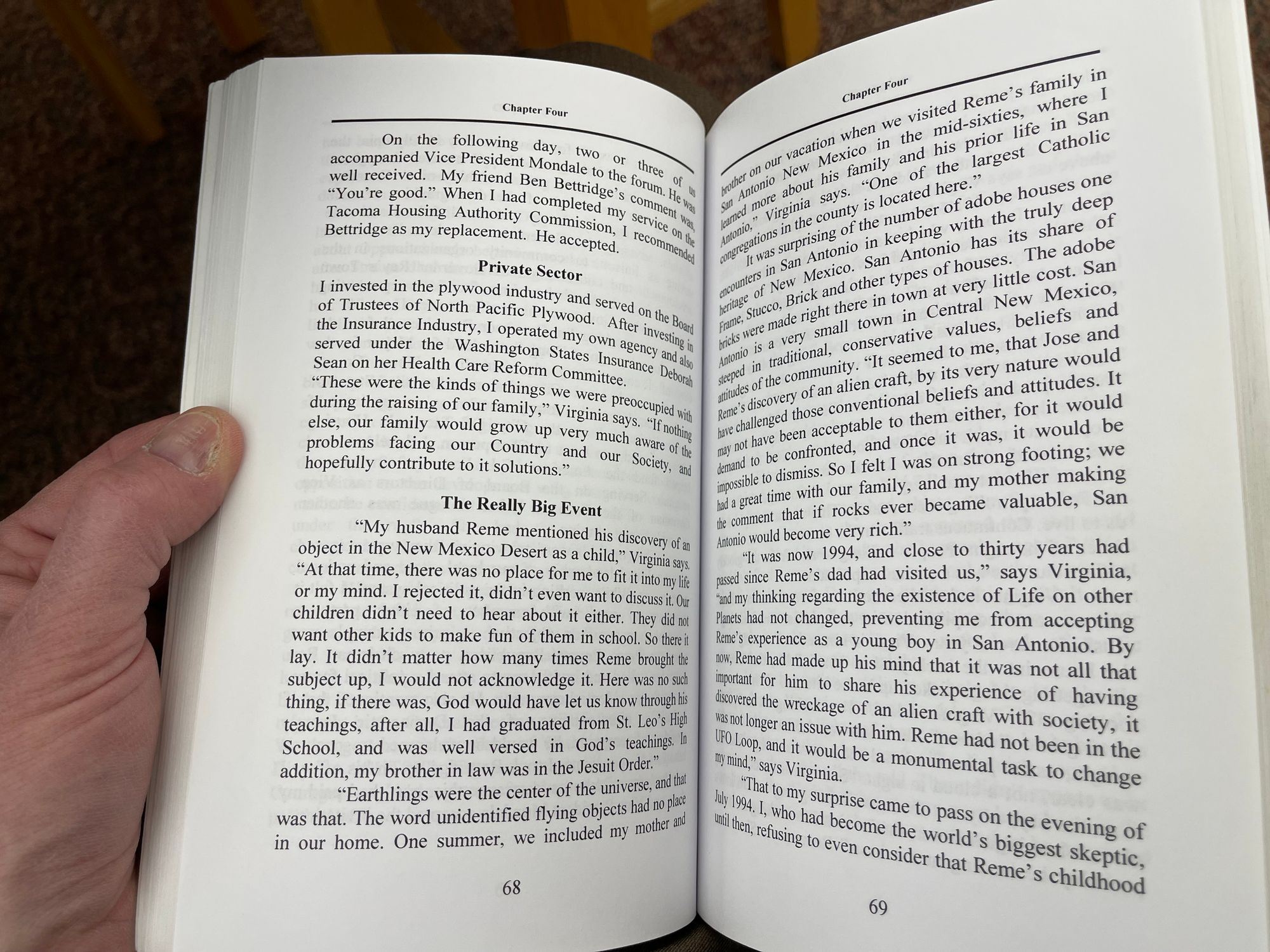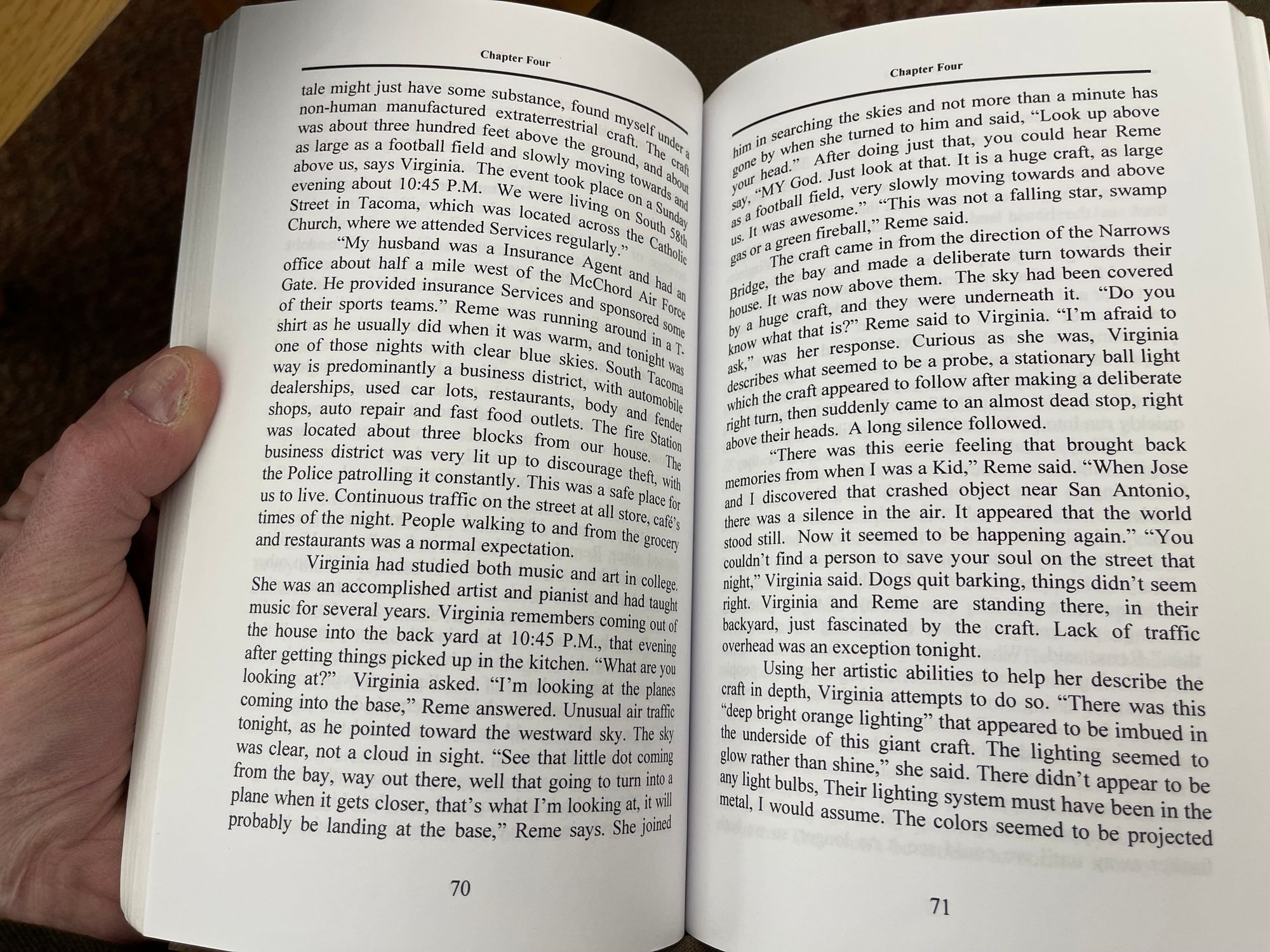 In the accounts, the couple watched pass directly overhead an object “about 200 feet up in the air, and big as a football field.” They related numerous details—observing an “orb” that the large object seeming to be following, watching the object rise and pass over the city, watching a plane pass near it, and so forth. Baca said this event made his wife into a UFO believer. A summary of the account appears on pages 68-73 of Baca's privately published 2011 book, Born on the Edge of Ground Zero. The book is long out of print; I reproduce those pages below for educational and journalistic purposes.