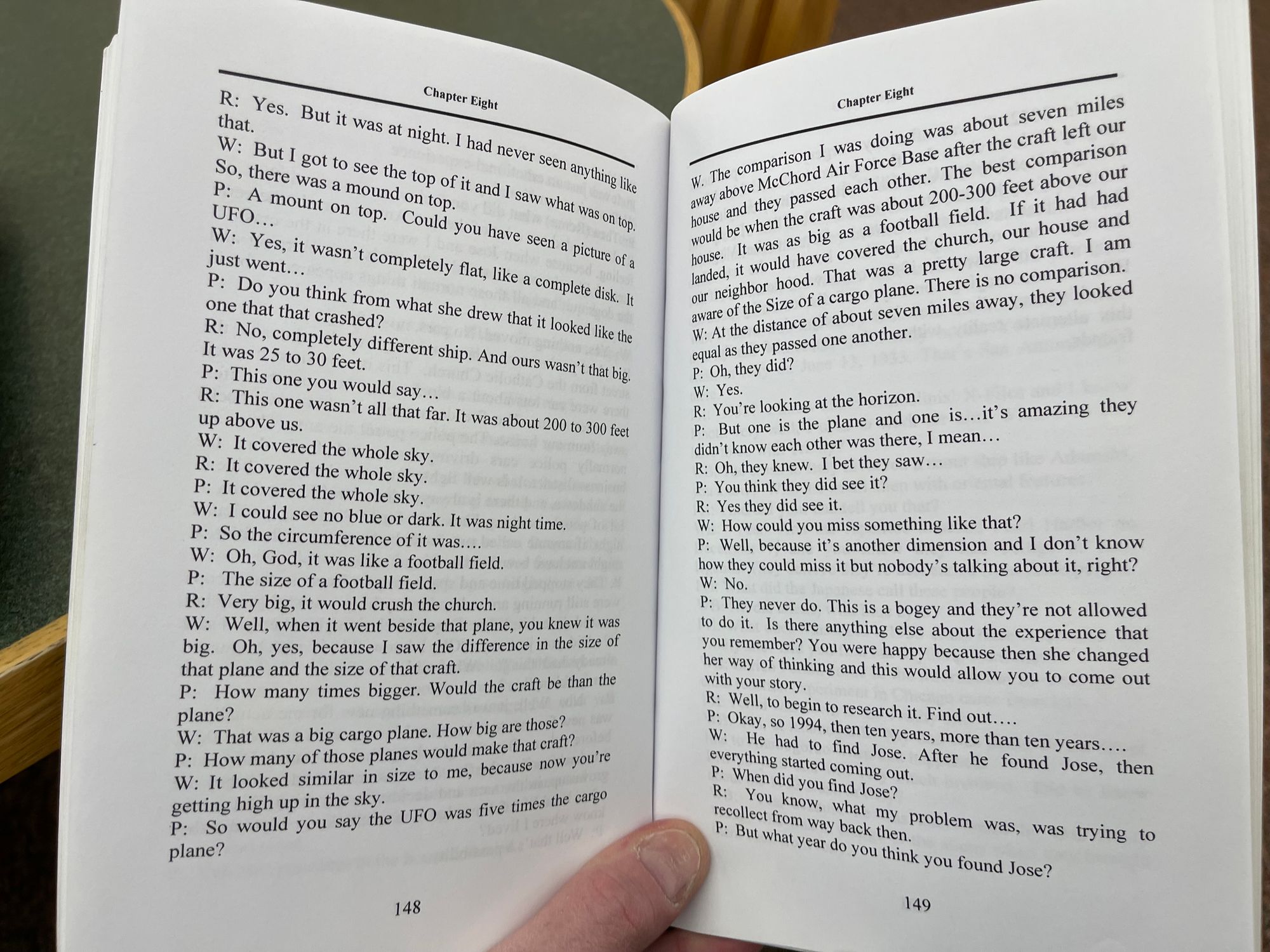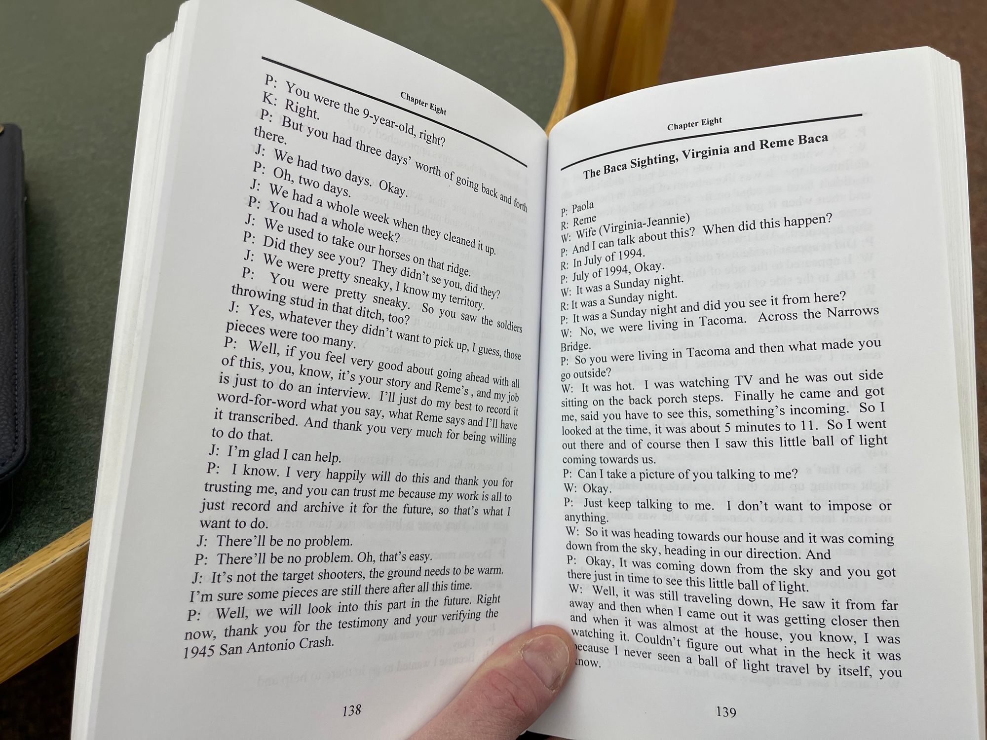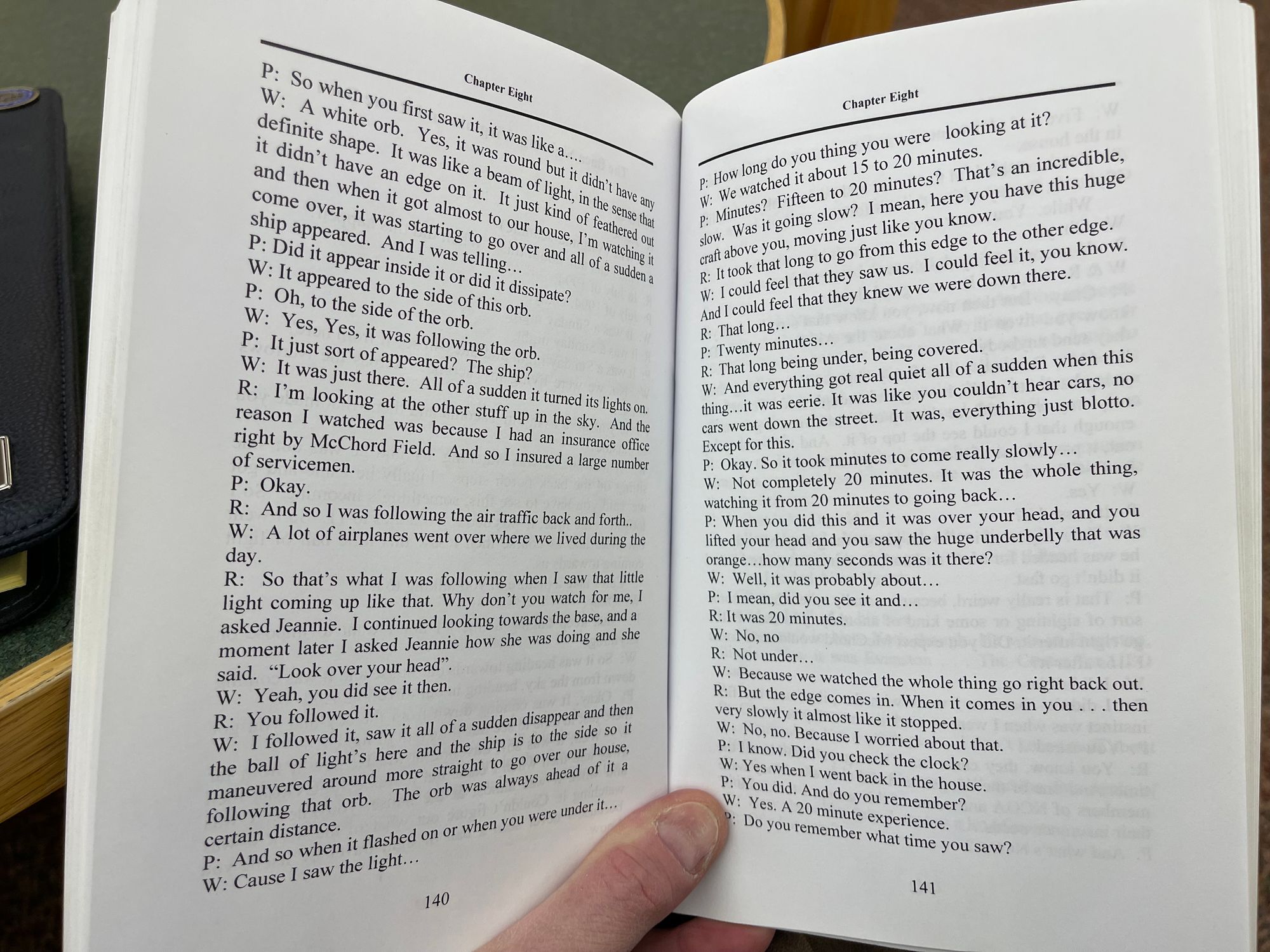 I have reproduced below the pages from the long out-of-print Born on the Edge of Ground Zero (2011) that contain the transcript of Paola Harris' conversation with the Bacas (pages 139-150 in the book). I do so in part because it provides the most detail on the purported 1994 UFO sighting, and in part because it provides an excellent example of Paola Harris’s interview technique. The transcript shows Harris repeatedly suggesting details before an interviewee could provide them, with interviewees sometimes agreeing to or adopting her interpolations. I would characterize the transcript as displaying something more akin to collaborative story construction than anything properly described as a witness interview.