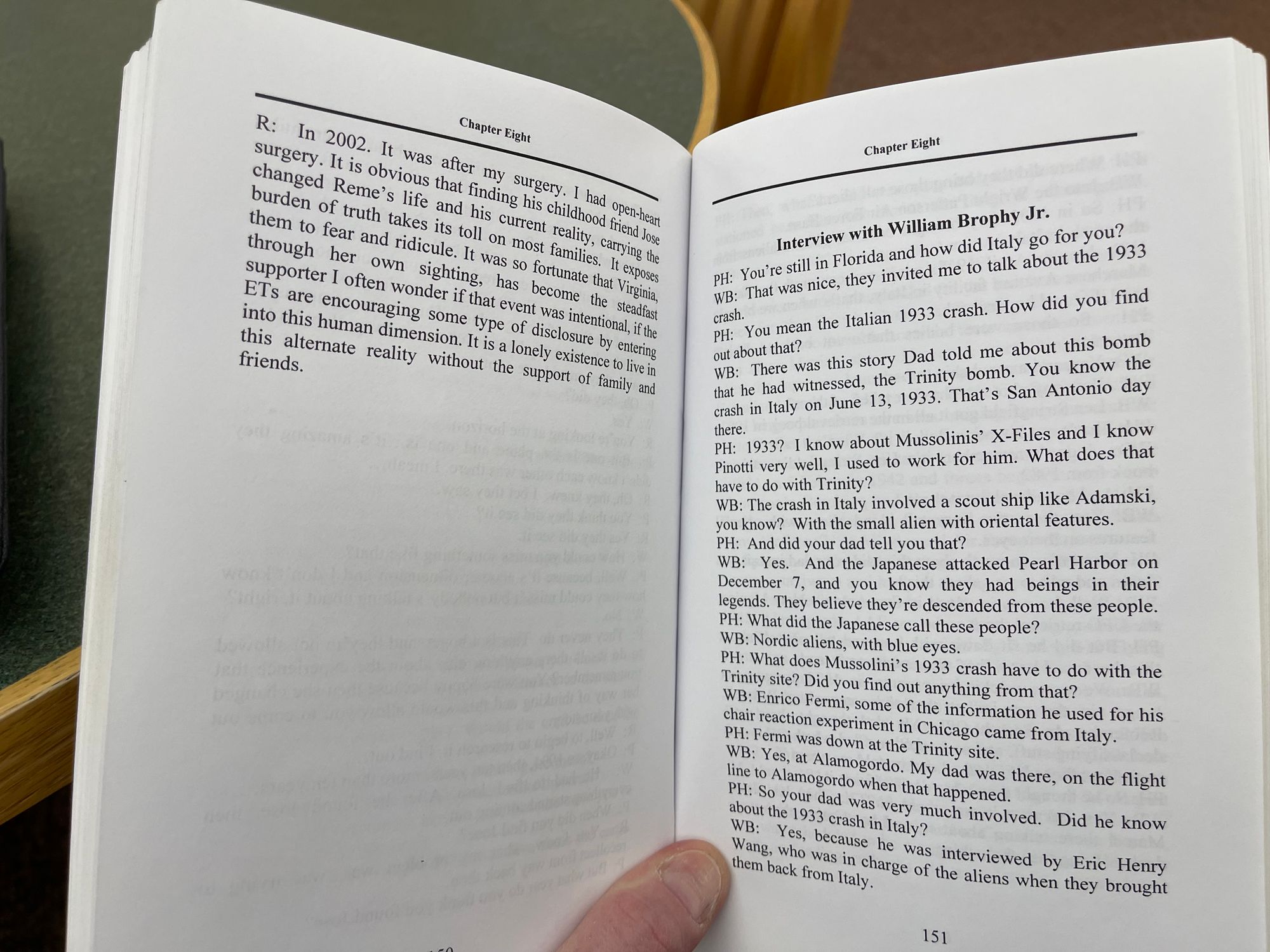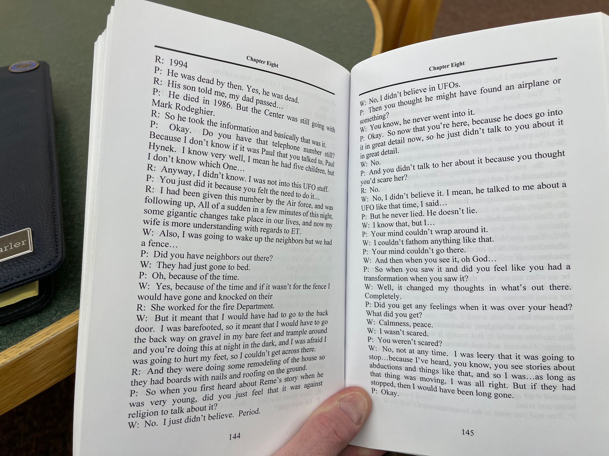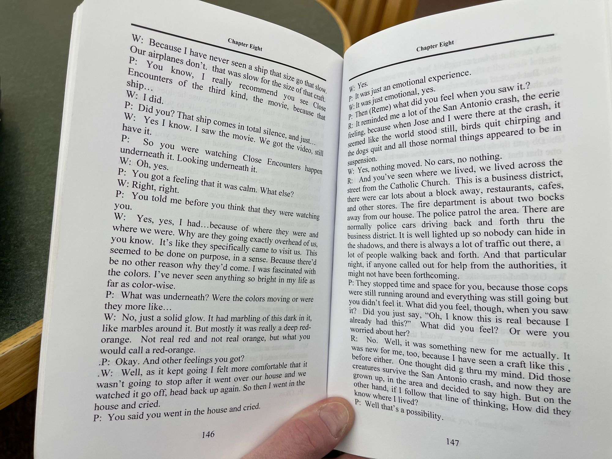 I have reproduced below the pages from the long out-of-print Born on the Edge of Ground Zero (2011) that contain the transcript of Paola Harris' conversation with the Bacas (pages 139-150 in the book). I do so in part because it provides the most detail on the purported 1994 UFO sighting, and in part because it provides an excellent example of Paola Harris’s interview technique. The transcript shows Harris repeatedly suggesting details before an interviewee could provide them, with interviewees sometimes agreeing to or adopting her interpolations. I would characterize the transcript as displaying something more akin to collaborative story construction than anything properly described as a witness interview.