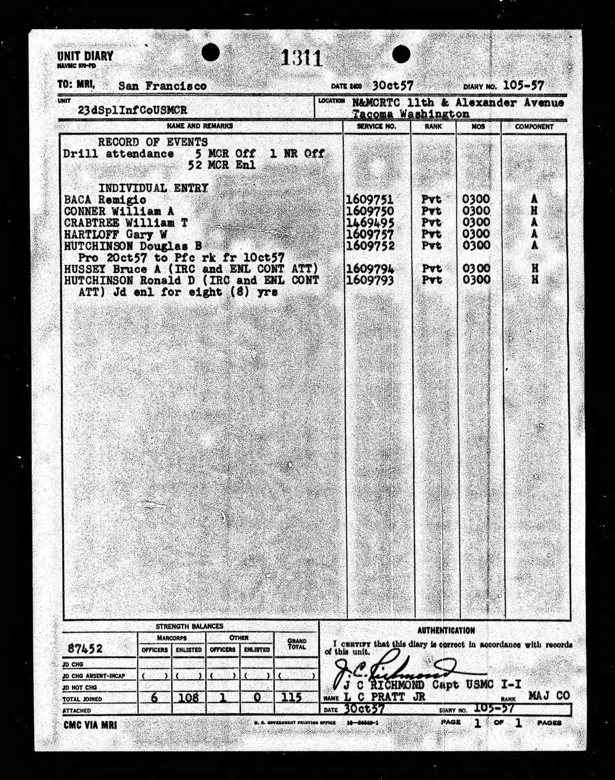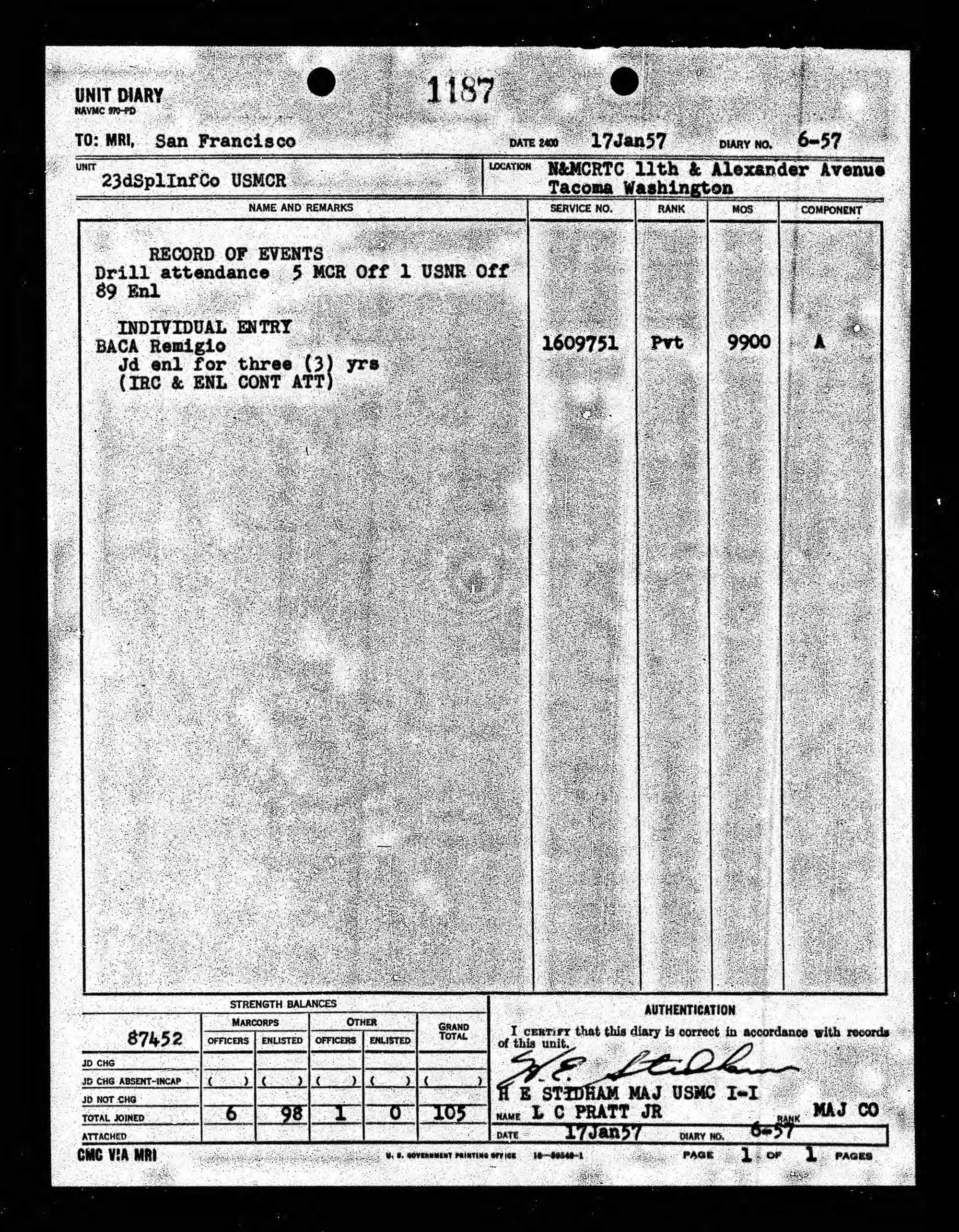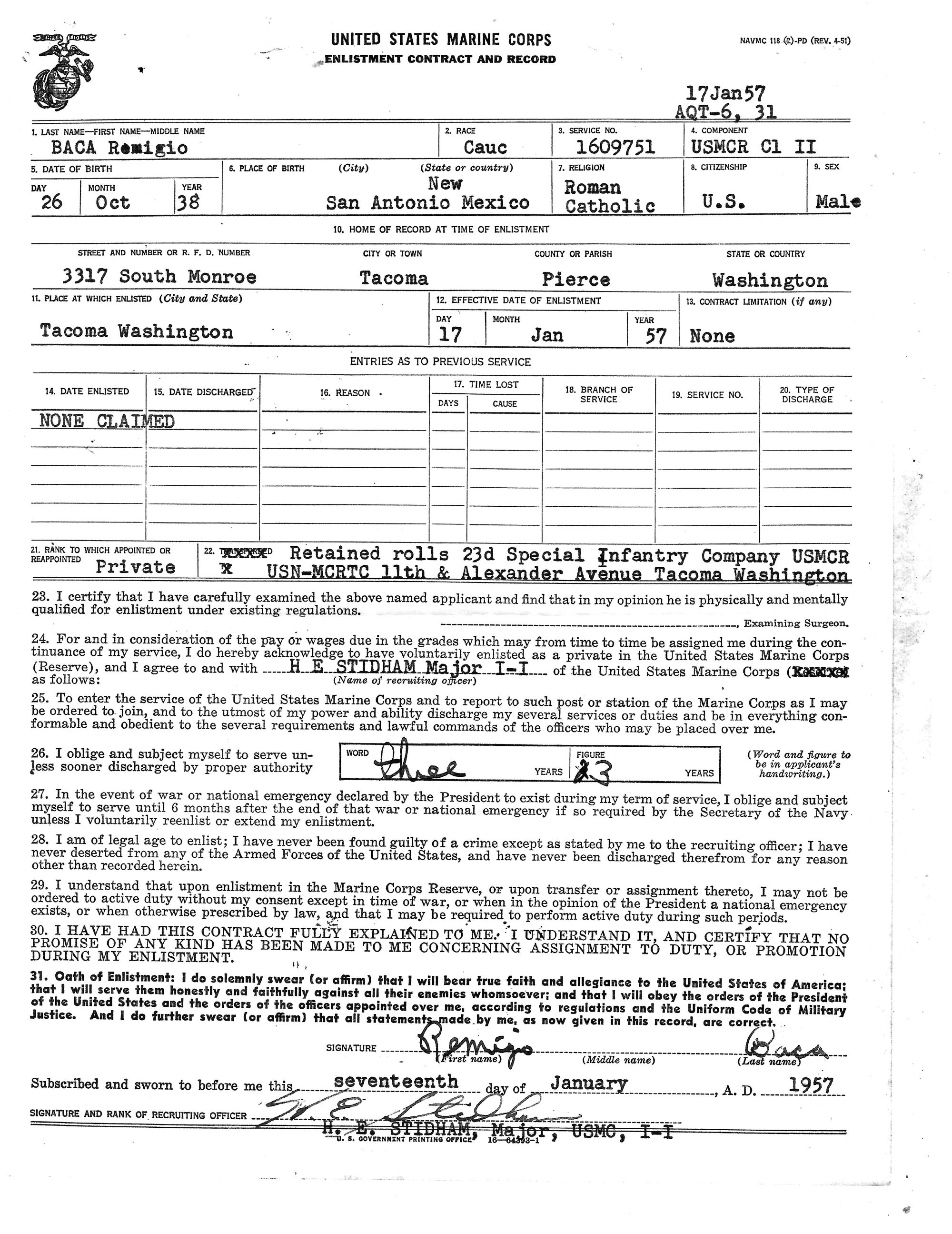 I obtained some documents pertaining to Baca’s military record. They show that he enlisted in a United States Marine Corps National Guard unit based in Tacoma in 1957, and was part of that organization for six years, until 1963. In that era, few National Guard units were mobilized for combat service. Baca’s service was entirely on the home front. His record shows a number of "not satisfactorily completed" and "inactivity" entries for 1958 and later, but I am unable to interpret the significance of these. In any event, Baca was honorably discharged as a private first class effective January 16, 1963.