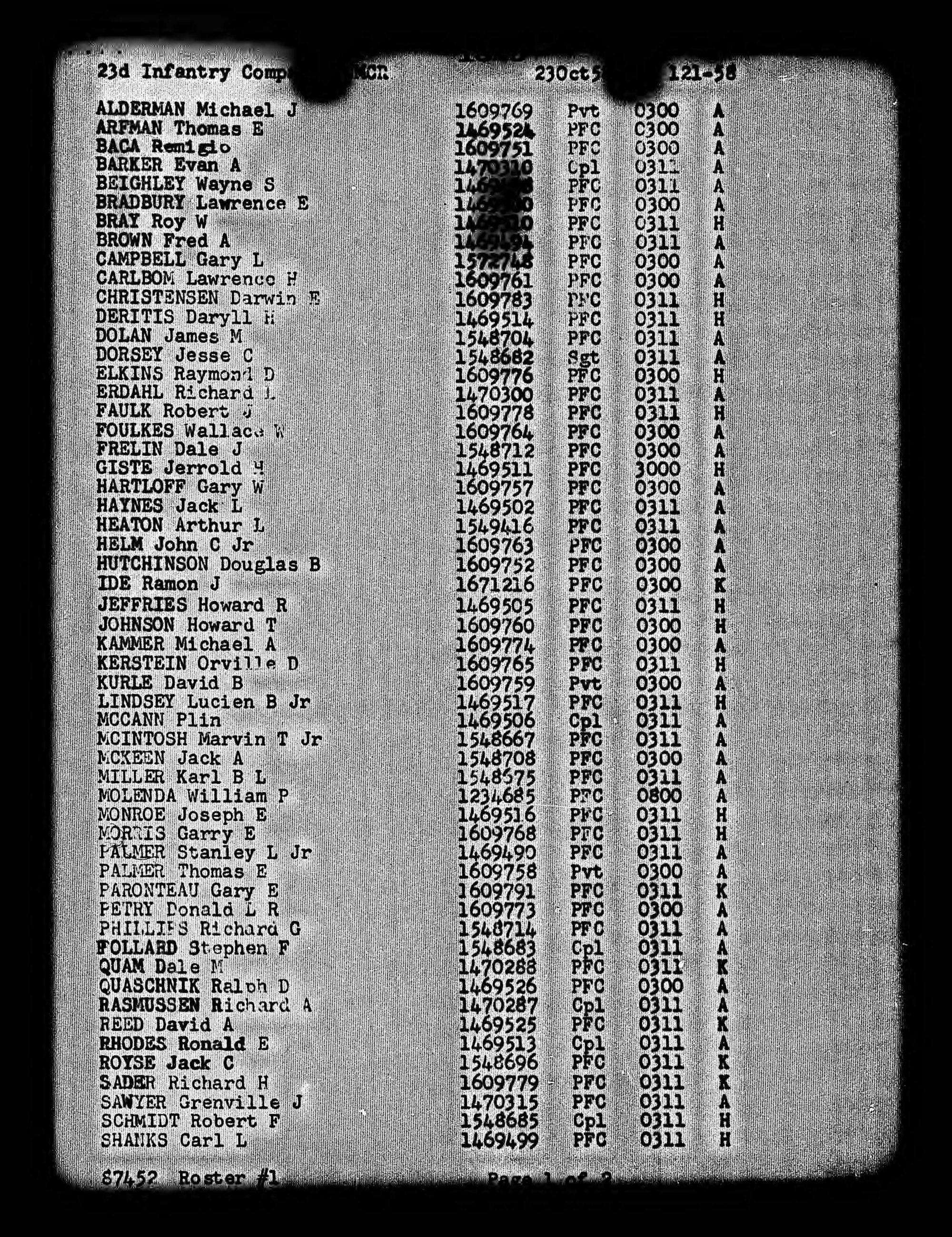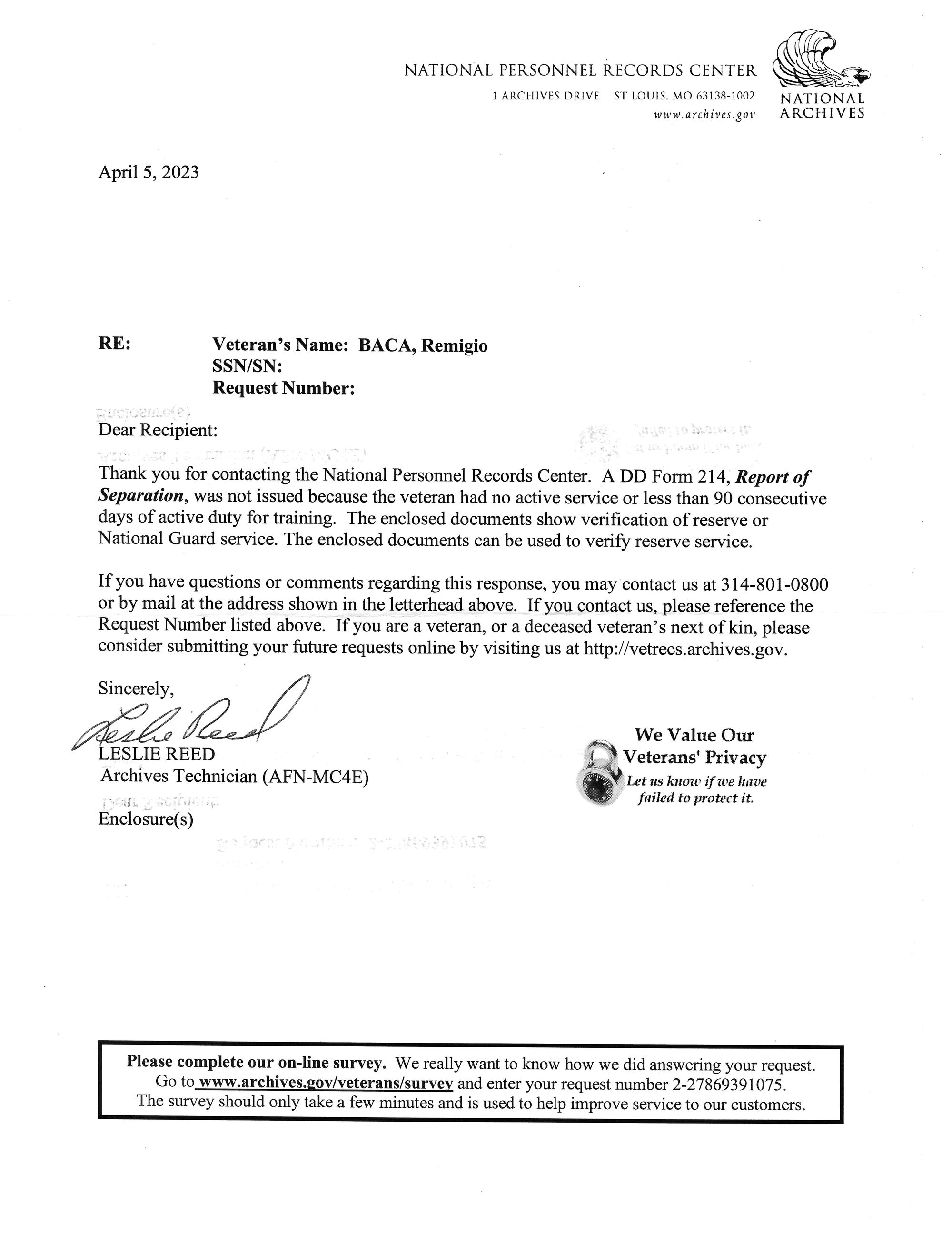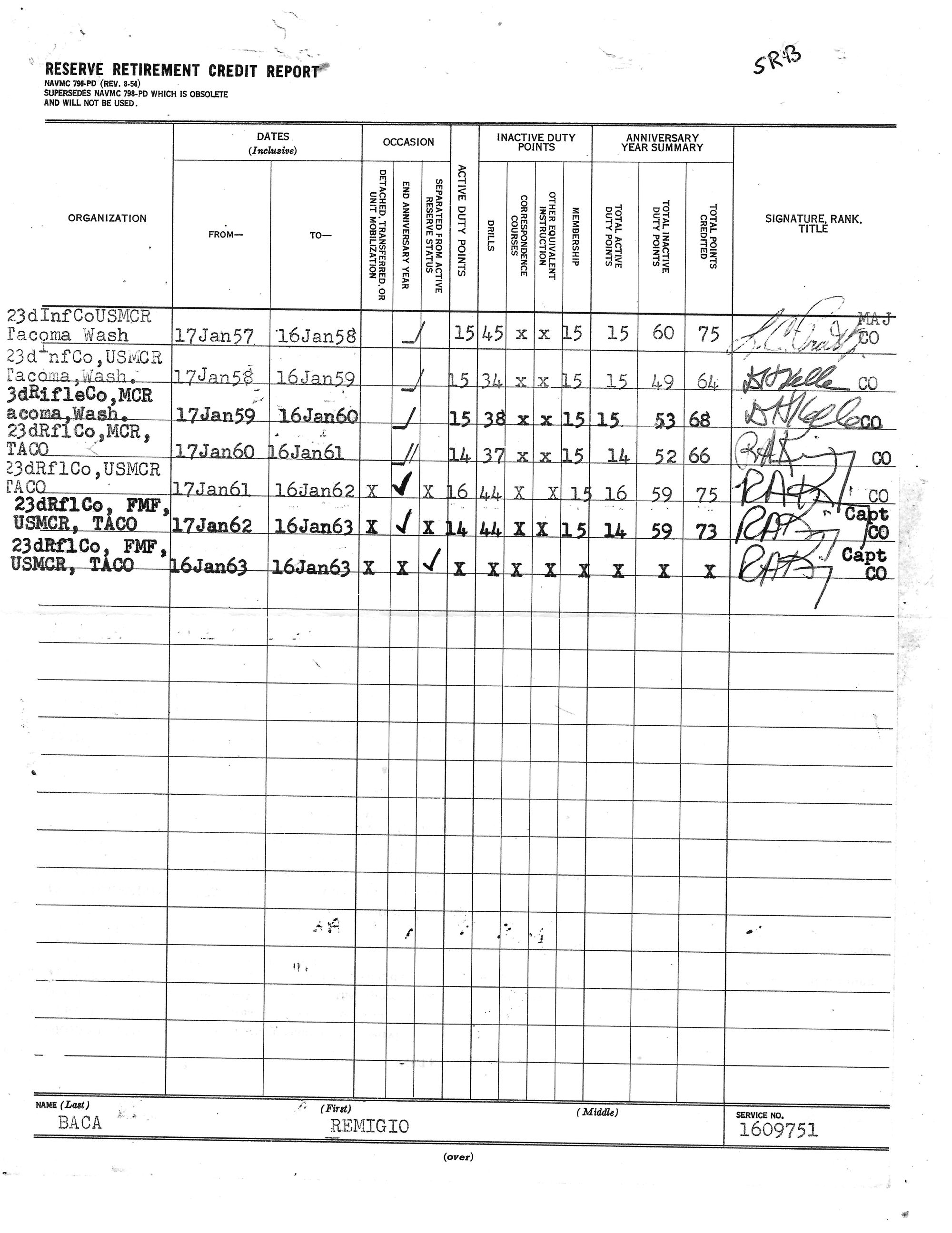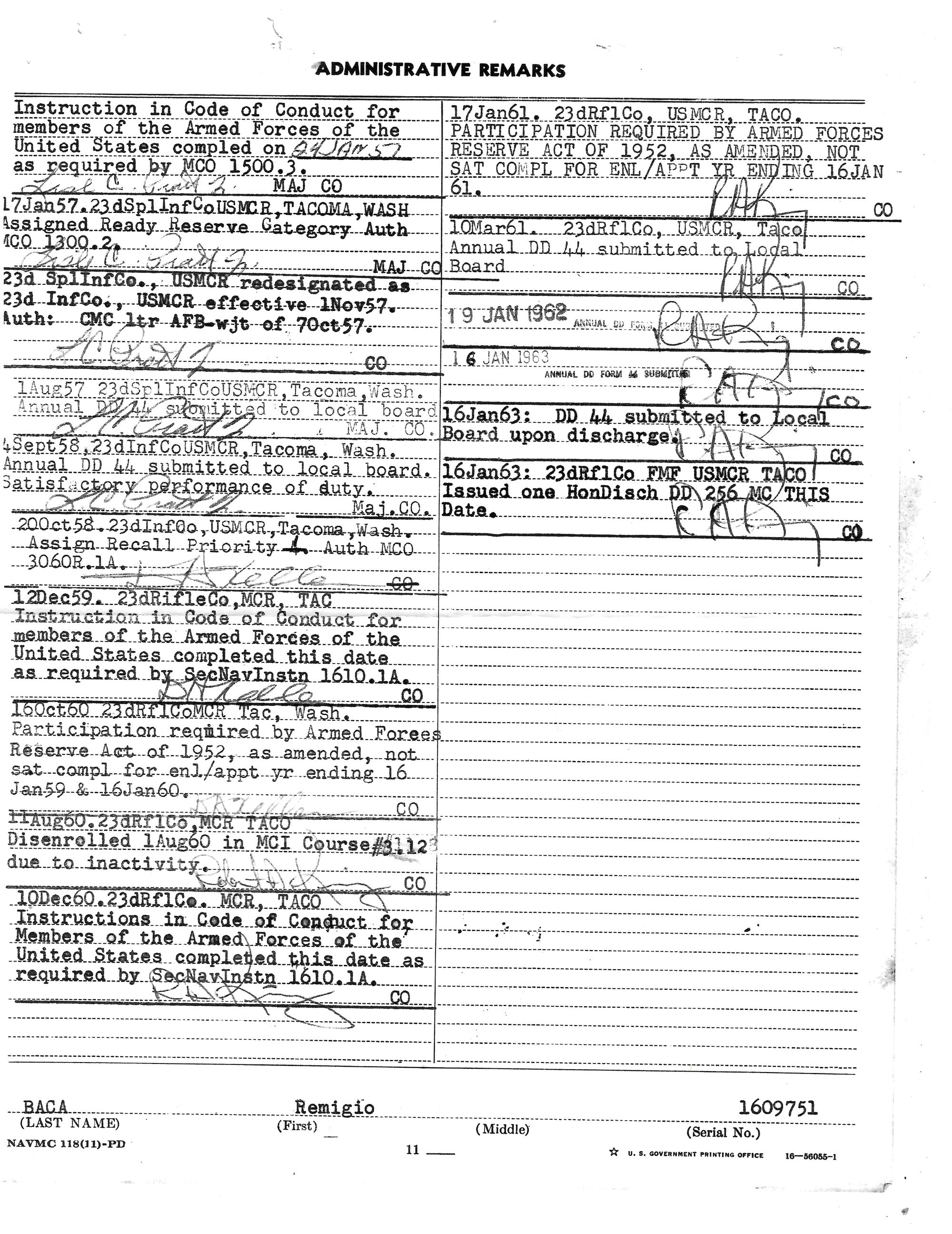 I obtained some documents pertaining to Baca’s military record. They show that he enlisted in a United States Marine Corps National Guard unit based in Tacoma in 1957, and was part of that organization for six years, until 1963. In that era, few National Guard units were mobilized for combat service. Baca’s service was entirely on the home front. His record shows a number of "not satisfactorily completed" and "inactivity" entries for 1958 and later, but I am unable to interpret the significance of these. In any event, Baca was honorably discharged as a private first class effective January 16, 1963.