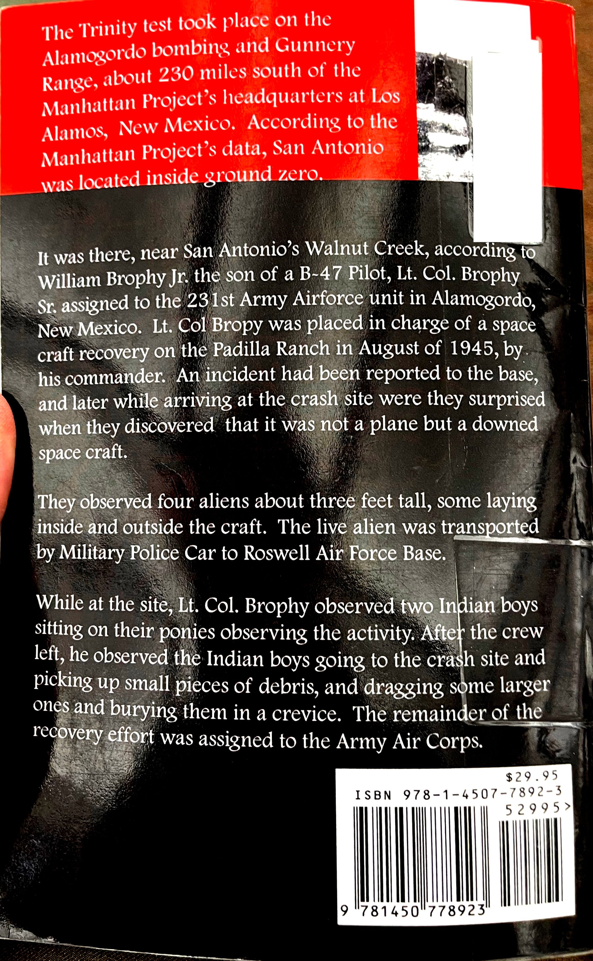 Remigio Baca’s 2011 book Born on the Edge of Ground Zero – the book designated as “the primary reference to the events described here” on page 337 of the Vallee-Harris book Trinity: The Best-Kept Secret (Second Edition, August 2022)-- includes this statement about the Trinity UFO crash-recovery, on the back cover: