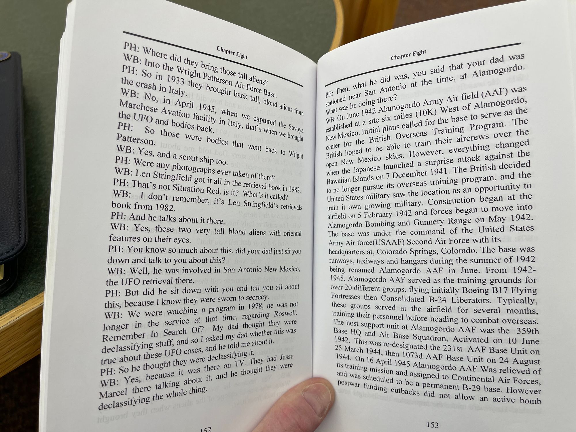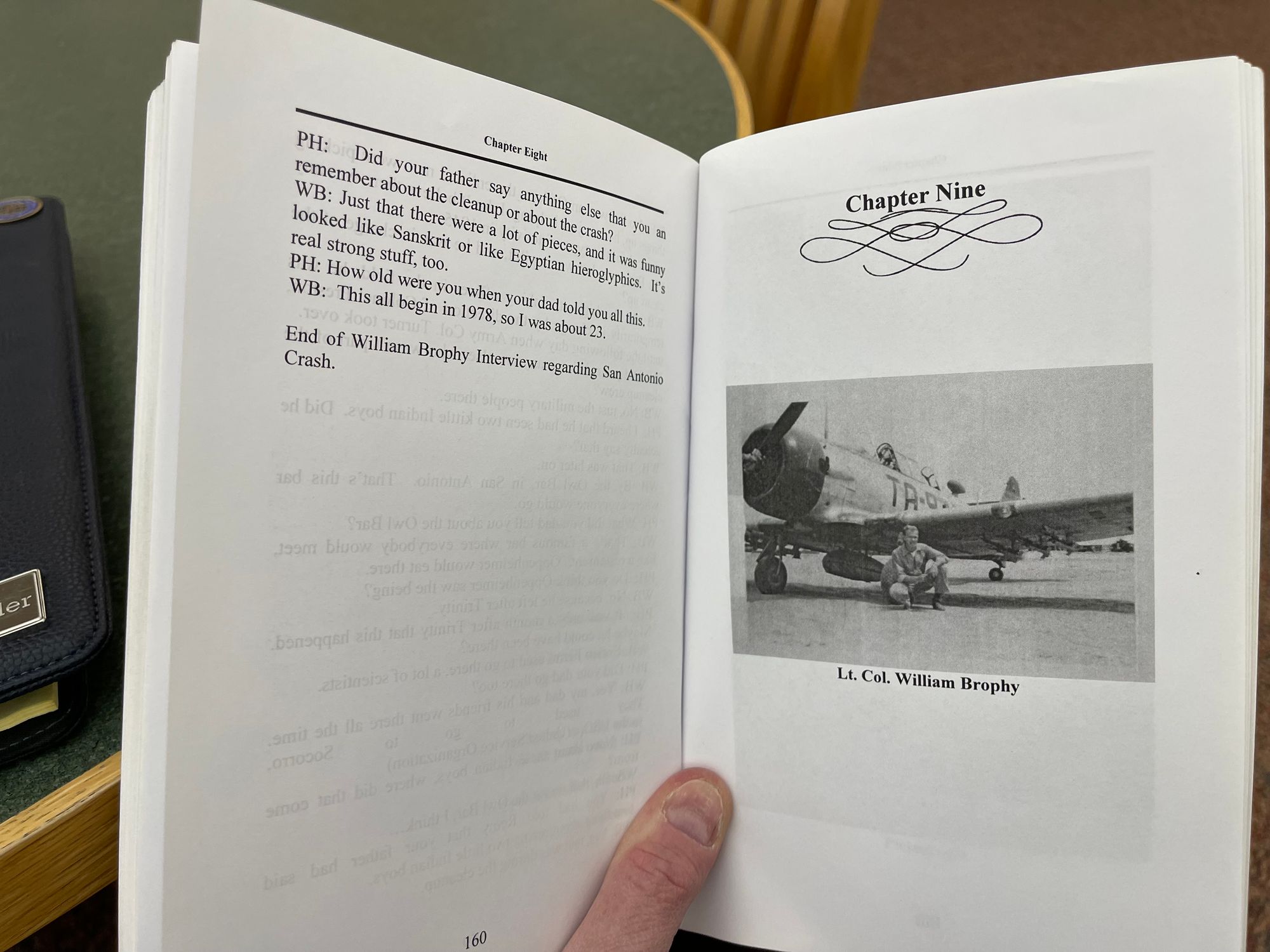 In this interview, Brophy did not say explicitly who flew the plane that carried the aliens to Wright. But in an interview on Coast to Coast AM on December 1, 2010, Harris said, "I originally got this story from a man whose father was the pilot that said he flew out the bodies of the 1945 San Antonio crash," and this can refer only to Billy Brophy.