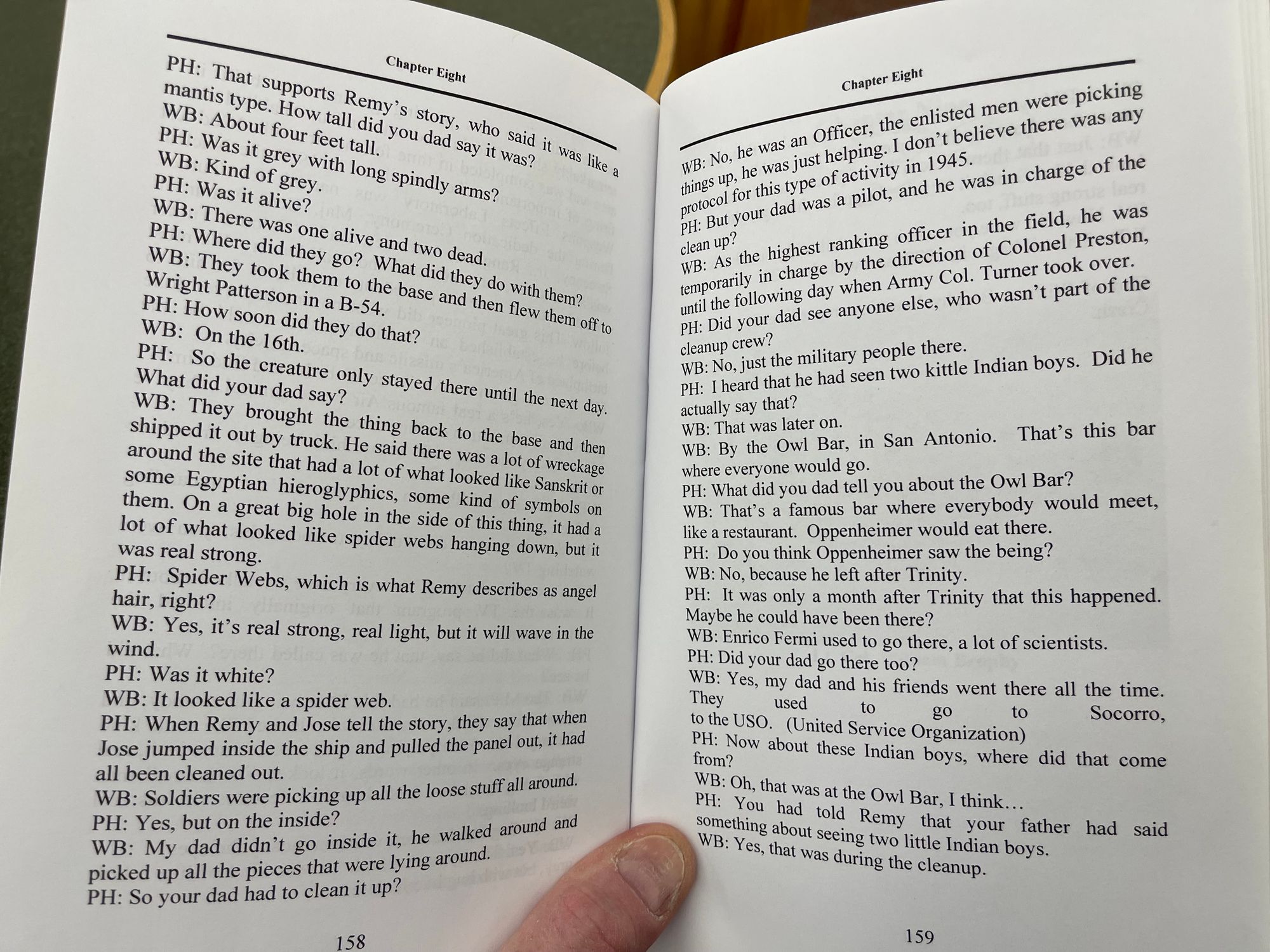 Now, consider this: In their Trinity: The Best-Kept Secret (Second Edition), and in multiple interviews on podcasts and with news media, Vallee and Harris have placed great weight on Billy Brophy’s late-coming claim that his father saw the just-crashed alien craft and the two boys while piloting a plane overhead – even though that overhead-plane account flatly contradicts both the original Baca-Padilla narratives, and Billy's earlier descriptions of his father's role in the affair, including the above-quoted 2010 interview of Billy by Harris (in which pilot Brophy first sees the two boys "by the Owl Barn in San Antonio," or in the alternative, "during the cleanup.") Clearly, Harris and Vallee regard Billy Brophy as a very credible source – even when the stories he attributes to his father morph drastically over time.