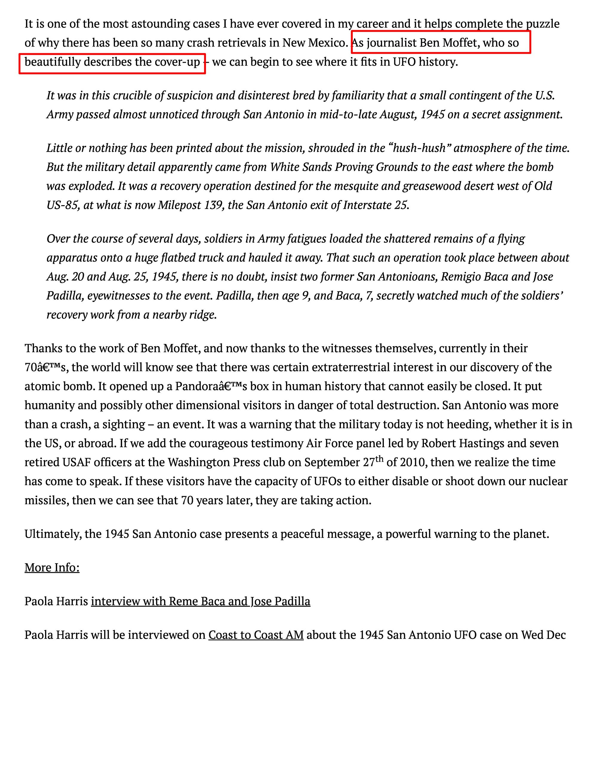 ● "The 1945 San Antonio UFO Crash: The Reme Baca and Jose Padilla Witness Case," by Paola Leopizza Harris, November 29, 2010. This document, which appears on various websites, appears to be a sort of press release intended mainly to promote the forthcoming publication of the Baca-Padilla book Born on the Edge of Ground Zero. The release misappropriated language written by Ben Moffett in 2003, quoting it as if Moffett had independently reported on historical events, when in reality Moffett merely wrote a narrative based on what Baca and Padilla told him (as Moffett took pains to clarify in 2015).