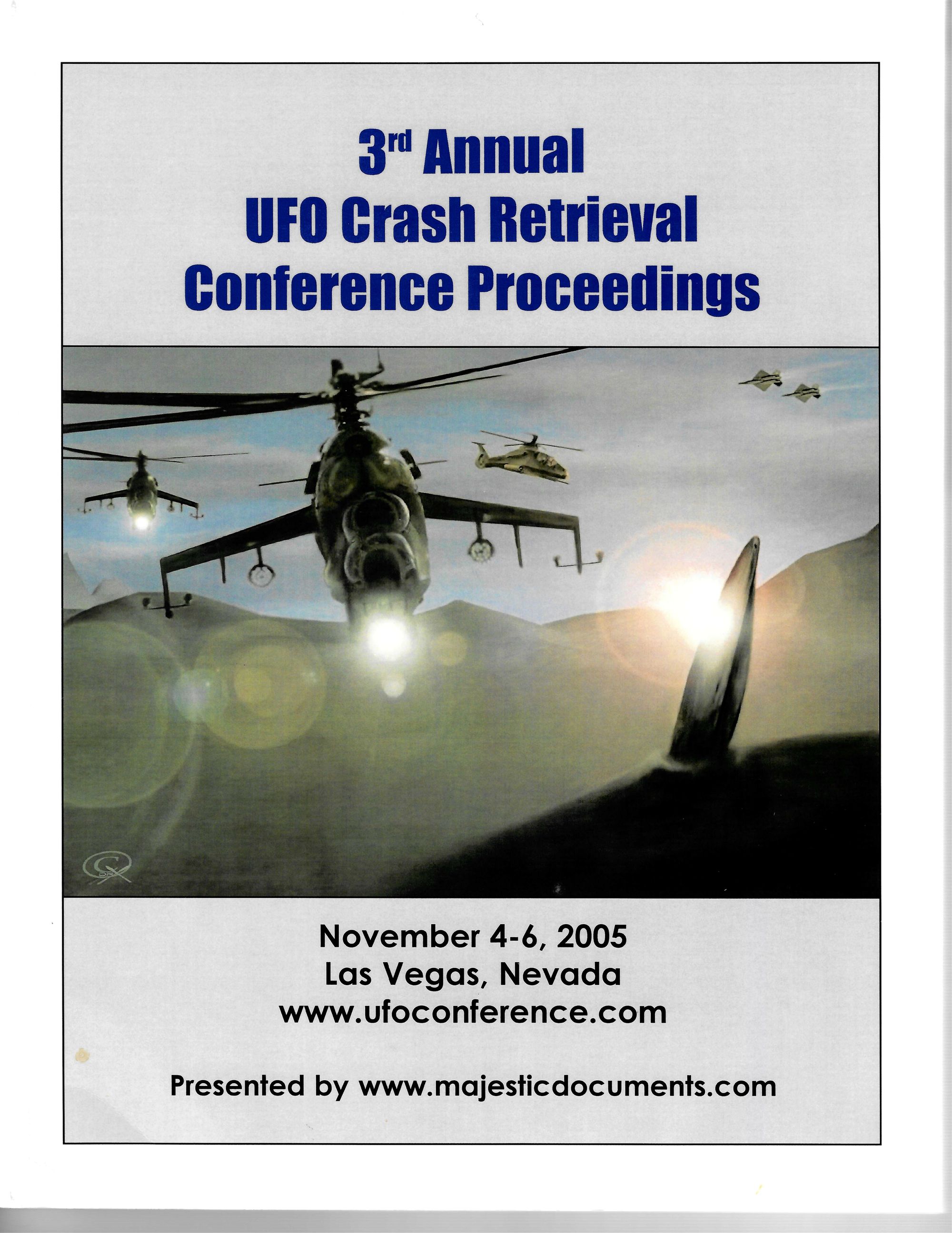 ● “San Antonio, NM August 1945 Crash Retrieval,” by Reme Baca, published in 3rd Annual UFO Crash Retrieval Conference Proceedings, November 4-6, 2005, Las Vegas, Nevada, organized by Ryan S. Wood (pages 151-156). This is the earliest published document containing an extended description of the purported crash-retrieval events given directly in Baca’s own words. An earlier manuscript that apparently provided the basis for the published paper is embedded below. (At times Baca adopted verbatim language from Ben Moffett’s article, without attribution, a practice found throughout Baca’s writings.) On the first page of the Proceedings chapter, Baca was identified as author of “Born on the Edge of Ground Zero: Living in the Shadow of Area 51, Remigio Baca & Jose Padilla, 2005.” However, that book was not actually published until early 2011. Baca had been scheduled to speak at Wood’s conference, but cancelled; Wood himself presented a Powerpoint that Baca sent in.