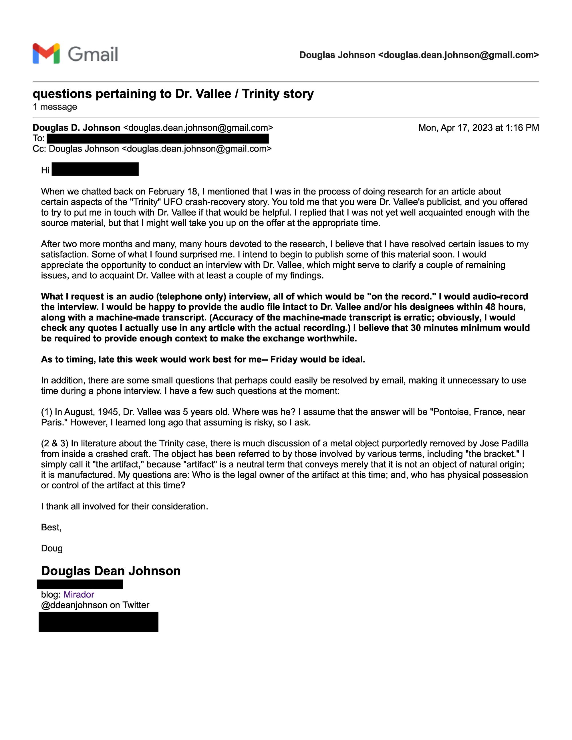 On April 17, 2023, I submitted to Jacques Vallee, through his publicist, a request for a 30-minute, on-record interview in which I would ask questions based on some of my findings. With that request I also submitted three questions that I regarded as very simple. Dr. Vallee declined the interview request, and answered one of the three questions; the complete e-mail exchange is reproduced below.