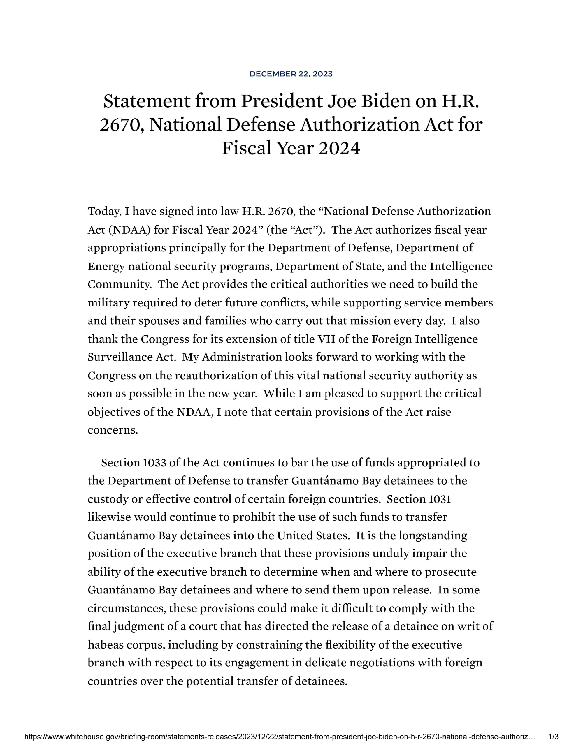 On December 22, 2023, President Biden signed into law the FY 2024 National Defense Authorization Act (NDAA, H.R. 2670).