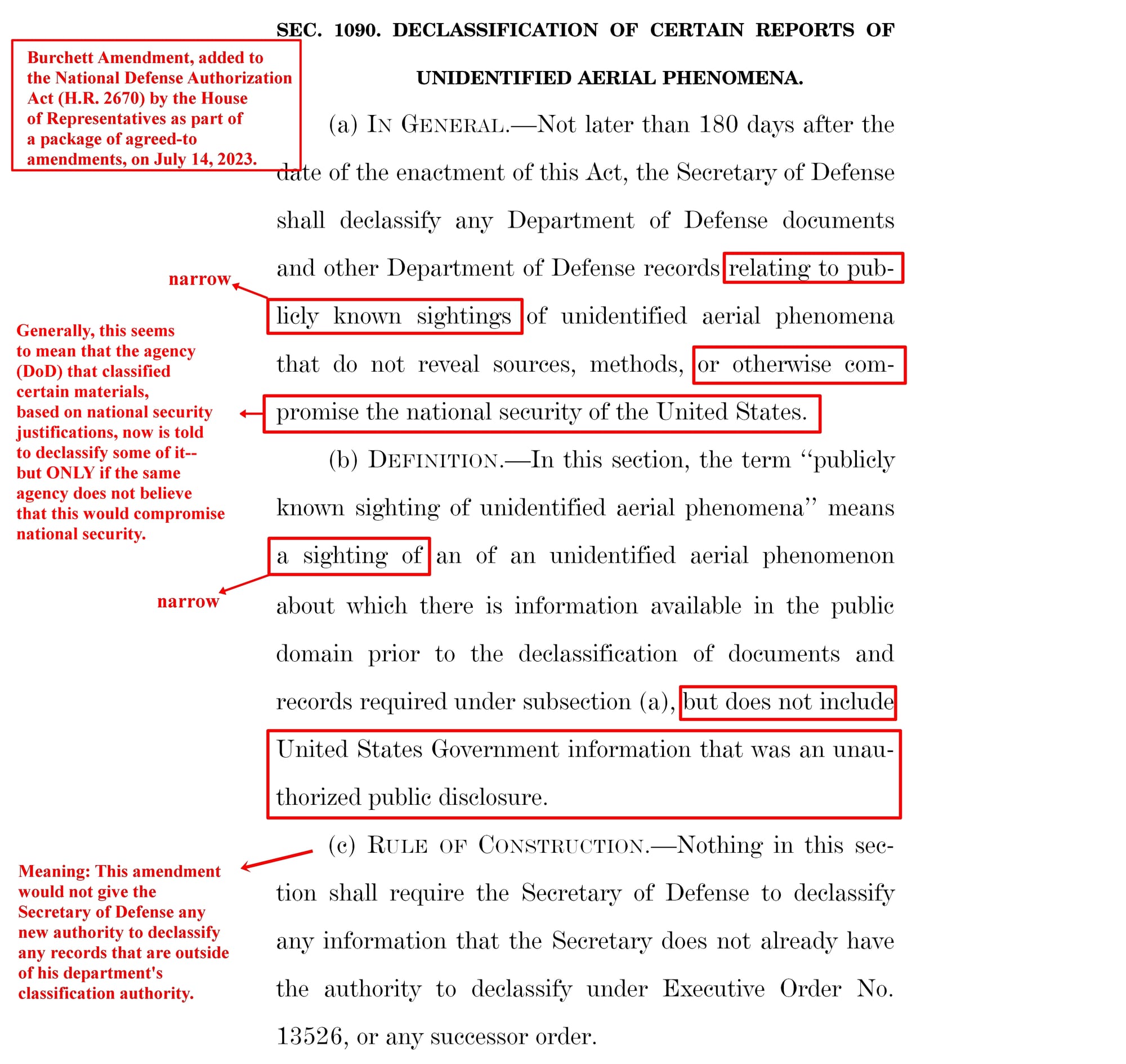 [3] On July 14, 2023, the House of Representatives adopted a UAP-related amendment sponsored by Rep. Tim Burchett (R-Tn.) during House consideration of its version of NDAA. The Burchett Amendment was accepted by House Armed Services Committee Chairman Mike Rogers (R-AL) as part of a bloc of amendments that were added to the bill without debate or a roll call vote. In my opinion, the amendment (which was dropped by the House-Senate conference committee) likely would have had very limited effect, due to the narrow scope of records described, and the unreviewable discretion it afforded to the Department of Defense to decline to release even the covered types of records, based on national security concerns. On November 29, 2023, I posted a graphic on X/Twitter highlighting some of the limitations of the proposal (shown below).