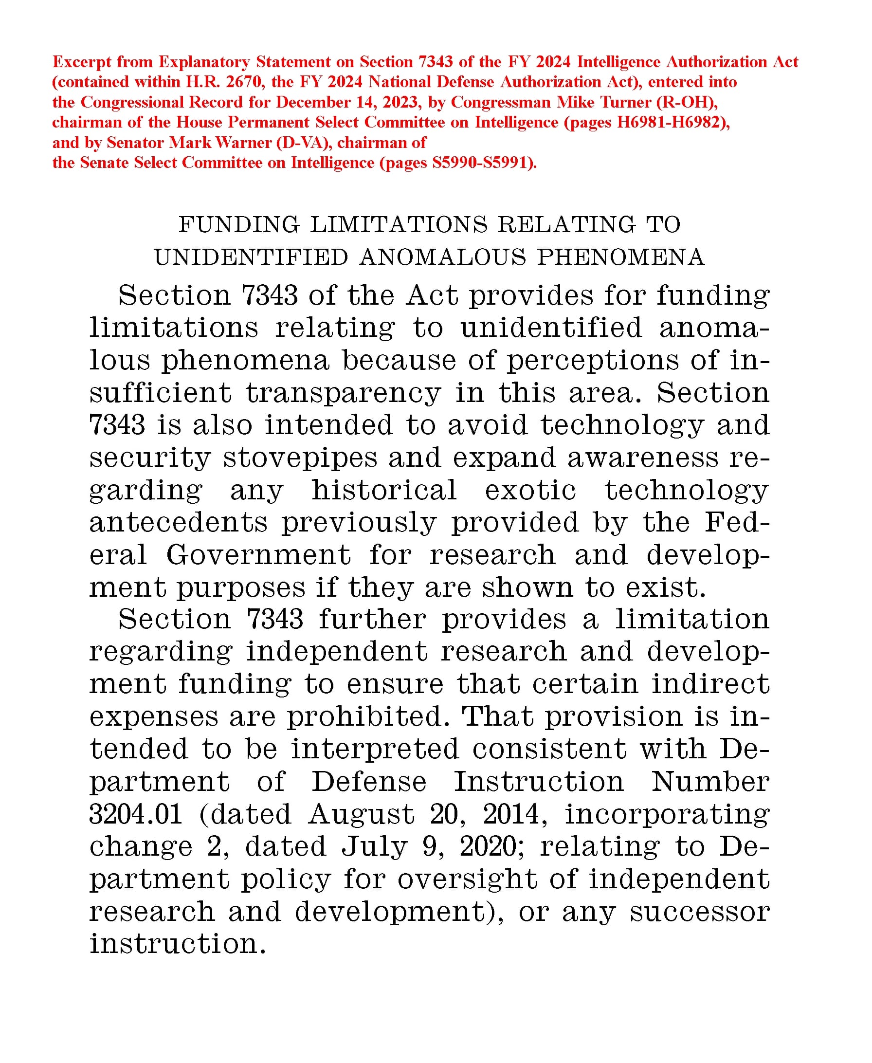 - December 15, 2023: Added material drawn from the Explanatory Statement entered into the Congressional Record of December 14, 2023, by the chairmen of the Intelligence committees of the U.S. Senate and U.S. House of Representatives, including an image of the UAP-related section describing the purposes of Section 7343 of the legislation.