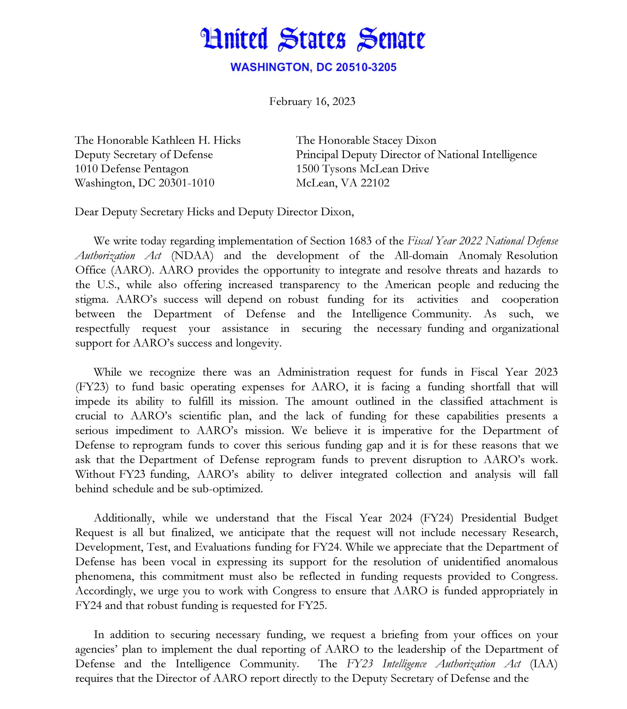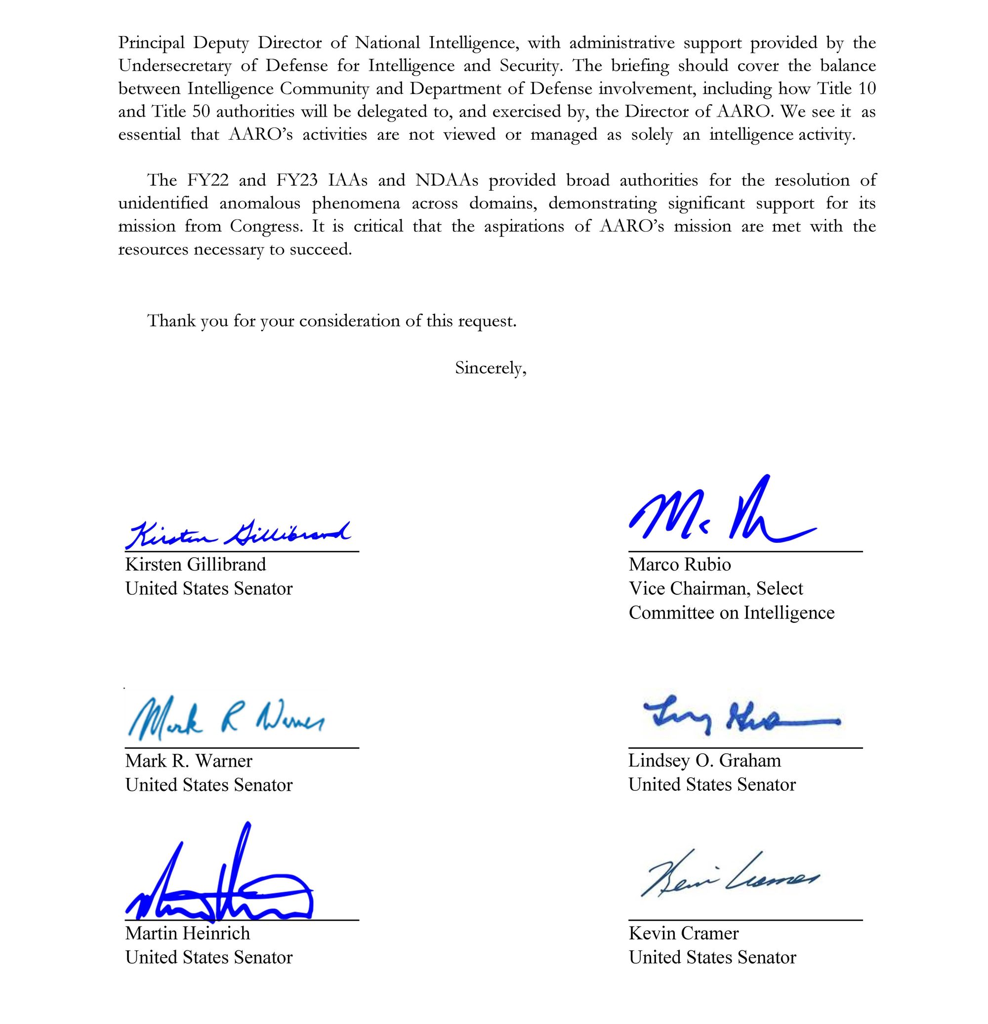 On February 16 a bipartisan group of 16 senators – including Gillibrand, SSCI ranking minority member Senator Marco Rubio (R-Fl.), and SSCI Chairman Senator Mark Warner (D-Va.) -- sent a letter to the second-ranking officials at the Department of Defense and in the Office of the Director of National Intelligence, urging support for more robust funding for AARO, and raising questions about the pace at which the Pentagon bureaucracy has implemented some of the AARO-related mandates enacted in December, 2022.