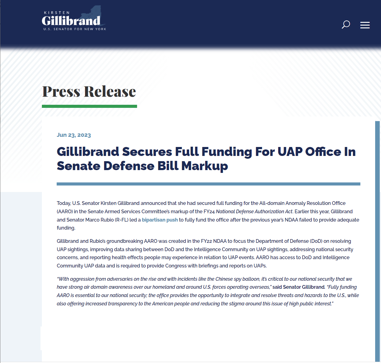 Following the conclusion of the Senate Armed Services Committee's closed-door voting sessions on the NDAA on June 22, Senator Gillibrand issued a press release (shown below) stating that "she had secured full funding" for AARO as part of the bill. [UDPATE: The Armed Services Committee's report on the NDAA (report no. 118-58), issued July 13, 2023, did not give the total amount of funding to be authorized for AARO in 2024, because funding levels for intelligence programs are including only in classified report annexes, not in public documents. However, the public report did say this: "The [Department of Defense] budget request included classified amounts for Research, Development, Test, and Evaluation, Defense Wide (RDDW) for the all-domain Anomaly Resolution Office. The committee understands that the AARO requires an additional $27.0 million in fiscal year 2024 to execute its mission. Therefore, the committee recommends an increase of $27.0 million for AARO in RDDW in line 999 Classified Programs. The committee expects the Secretary of Defense to request appropriate funding in future years."]