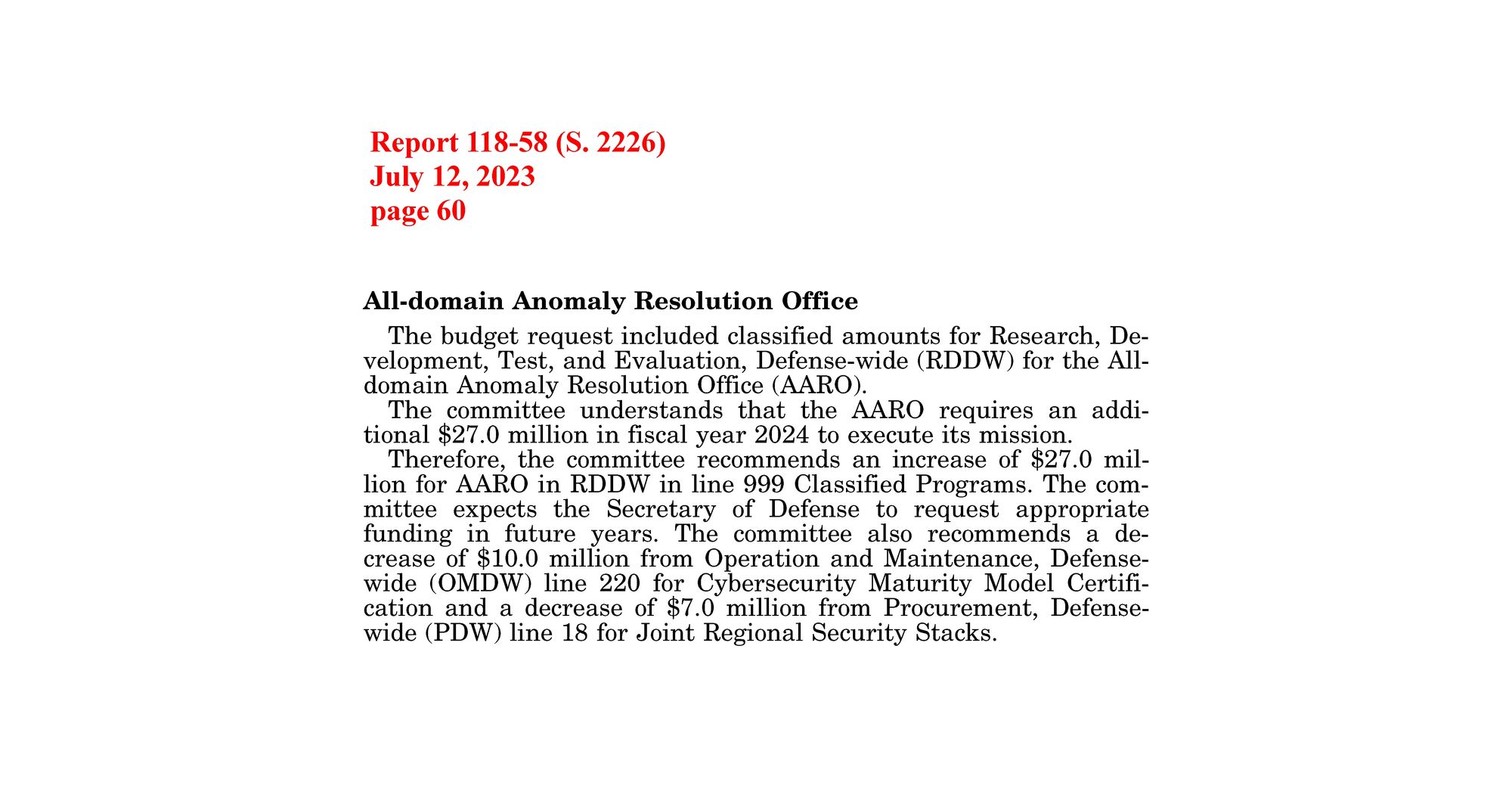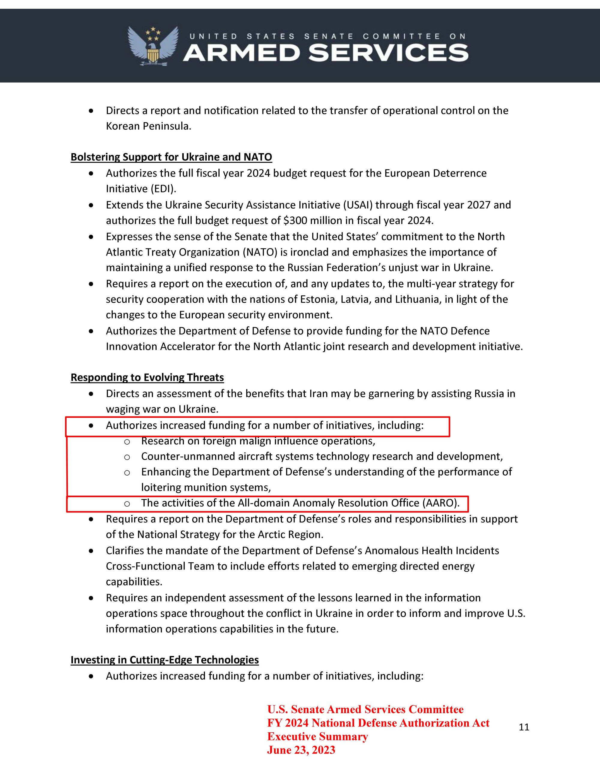 (6) July 17, 2023, 2:30 PM EDT: Clarified my previous partly erroneous statement regarding what is known about the authorized funding level for the All-domain Anomaly Resolution Office (AARO) in Fiscal Year 2024. Inserted images from the report of the Senate Armed Services Committee on S. 2226, stating that the committee recommended a funding increase of $27 million, over and above the classified figure that had been submitted as part of the Department of Defense budget request (but the total figure remains classified).