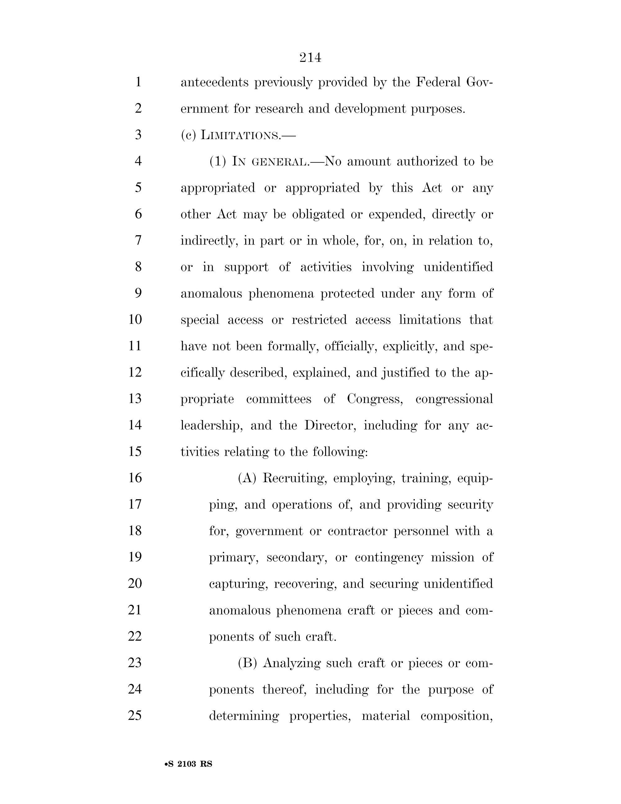 Besides the notification and make-available requirements for UAP-related information and hardware, S. 2103 contains a sweeping prohibition on any future direct or indirect funding for any special-access program (SAP) activity related to unidentified anomalous phenomena (as that term is broadly defined in current law--see the box below), unless the program has been "formally, officially, explicitly, and specifically described, explained, and justified to the appropriate committees of Congress, congressional leadership, and the Director [of AARO]."