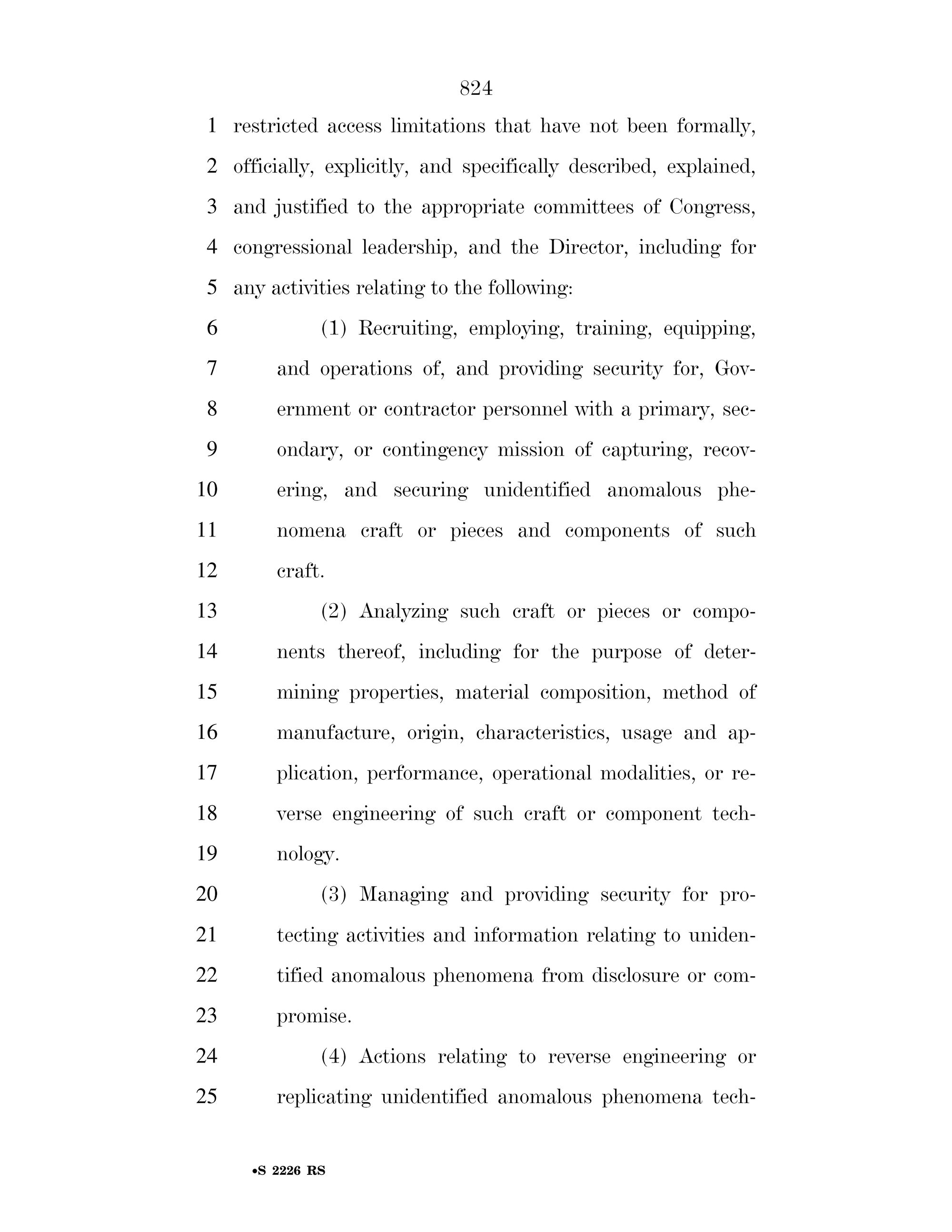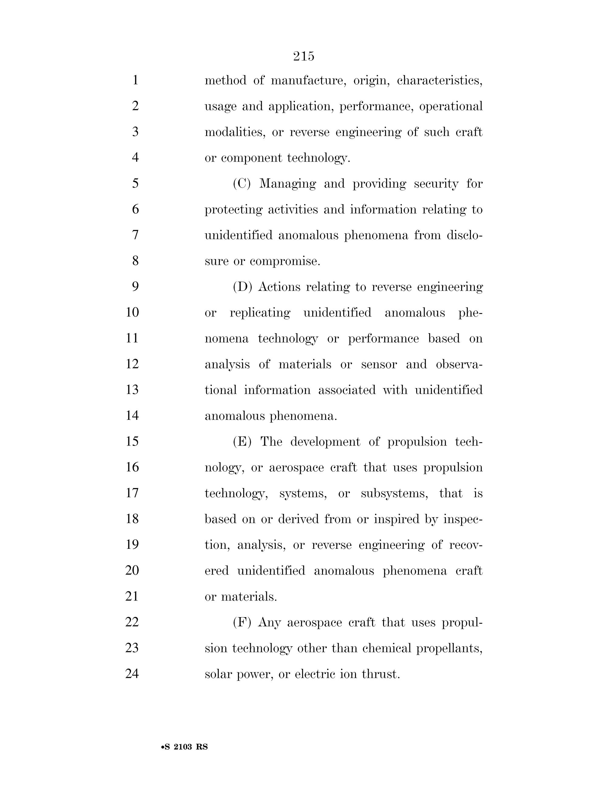 The categories of activities covered by the prospective funding ban are defined in six expansive paragraphs, to include "any activities relating to," among other things, "Recruiting, employing, training, equipping, and operations of, and providing security for, government or contractor personnel with a primary, secondary, or contingency mission of capturing, recovering, and securing unidentified anomalous phenomena craft or pieces and components of such craft," and "managing and providing security for protecting activities and information relating to unidentified anomalous phenomena from disclosure." Also included is a broad range of activity related to reverse-engineering, including work on "any aerospace craft that uses propulsion technology other than chemical propellants, solar power, and electric ion thrust."