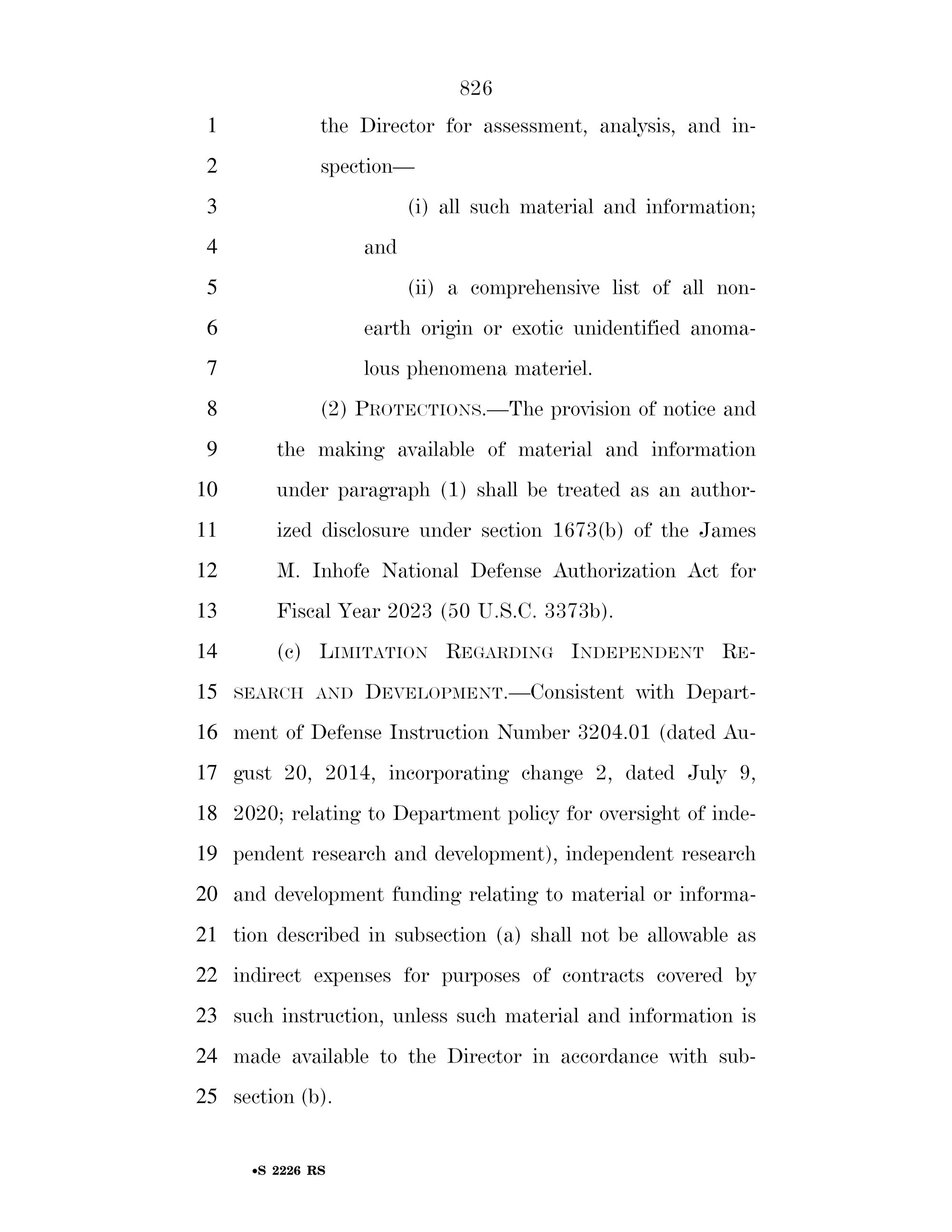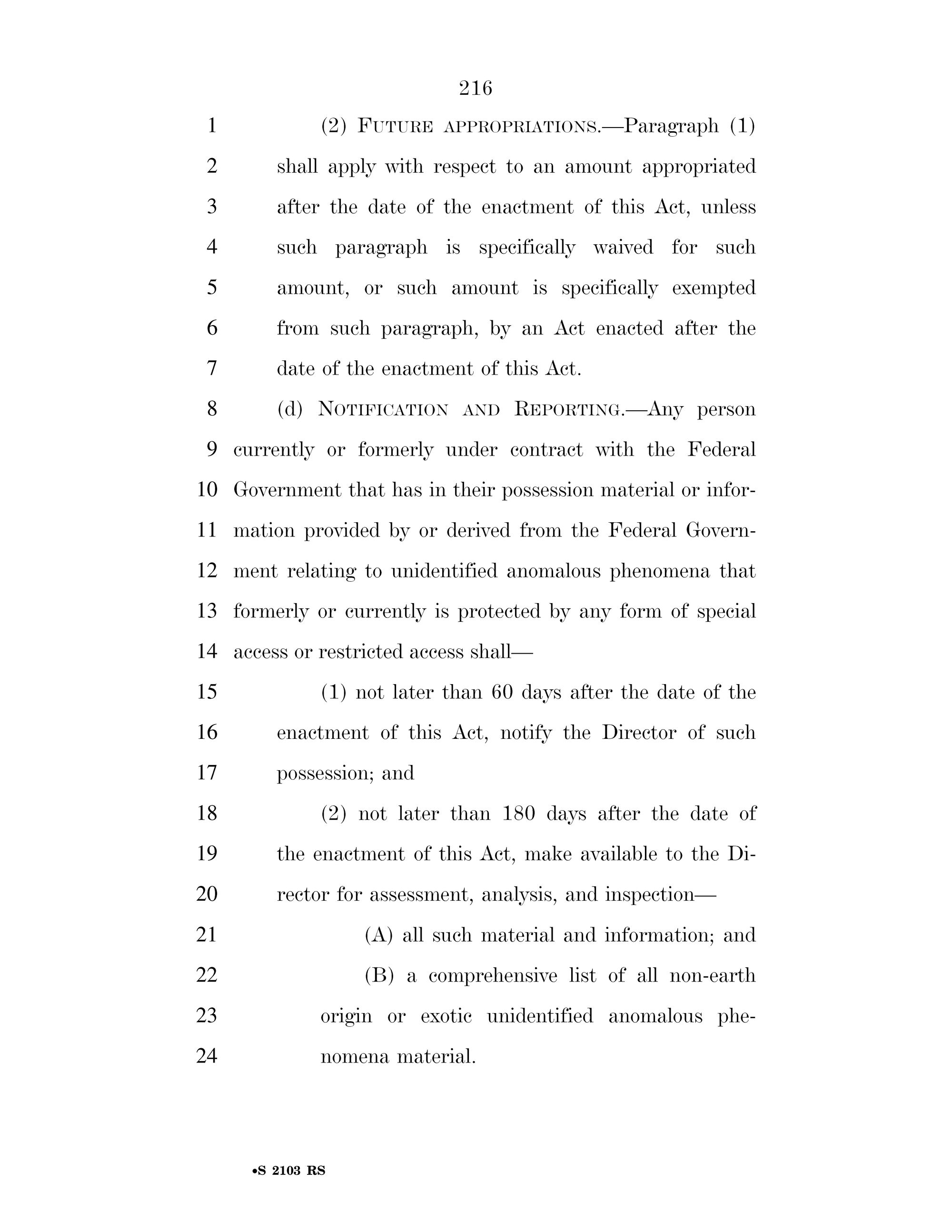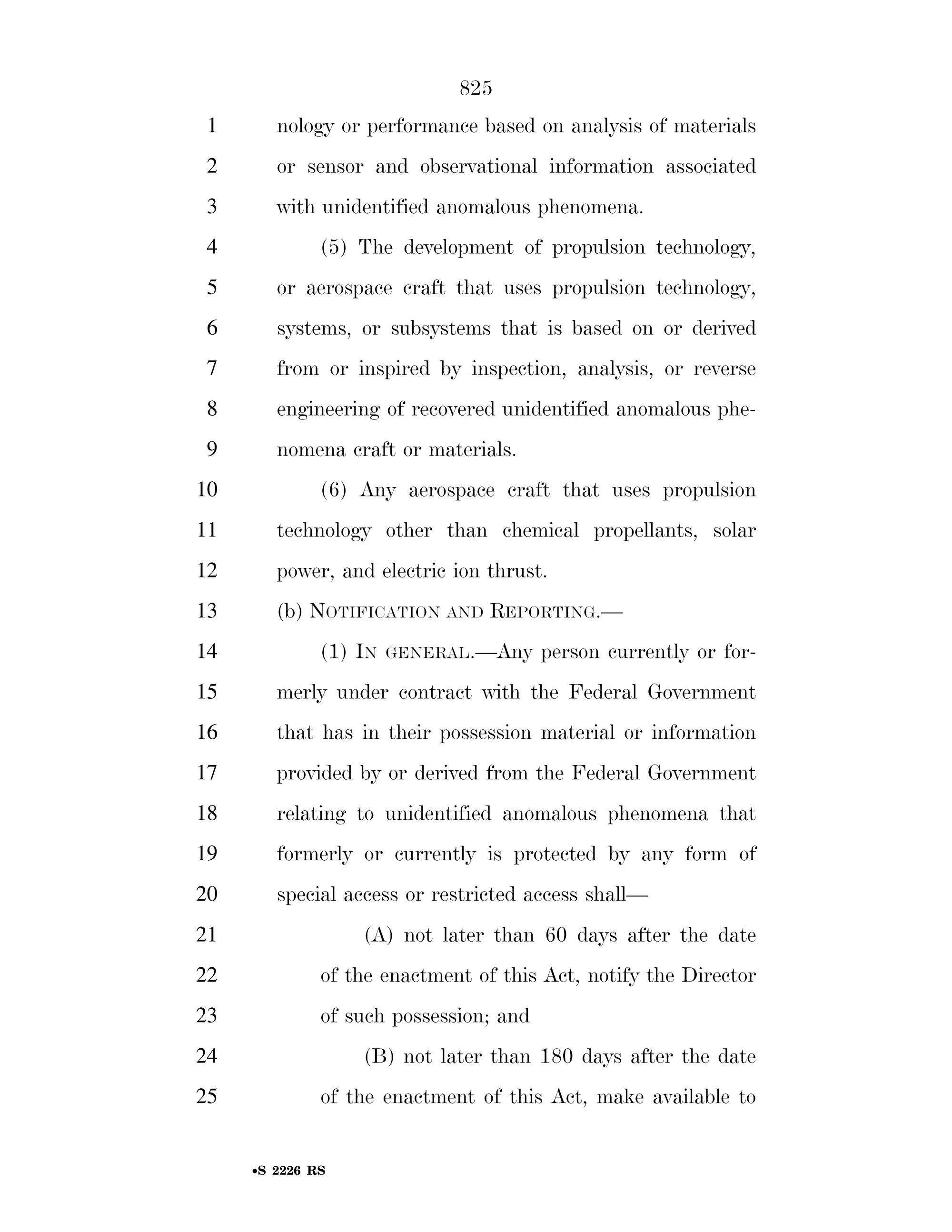 The new UAP language (found in Section 1104 of the bill) would require "any person currently or formerly under contract with the Federal Government that has in their possession material or information provided by or derived from the Federal Government relating to unidentified anomalous phenomena that formerly or currently is protected by any form of special access or restricted access" to notify the director of the All-domain Anomaly Resolution Office (AARO) within 60 days of enactment, and to provide within 180 days (six months) "a comprehensive list of all non-earth origin or exotic unidentified anomalous phenomena material" possessed and to make it available to the AARO director for "assessment, analysis, and inspection."