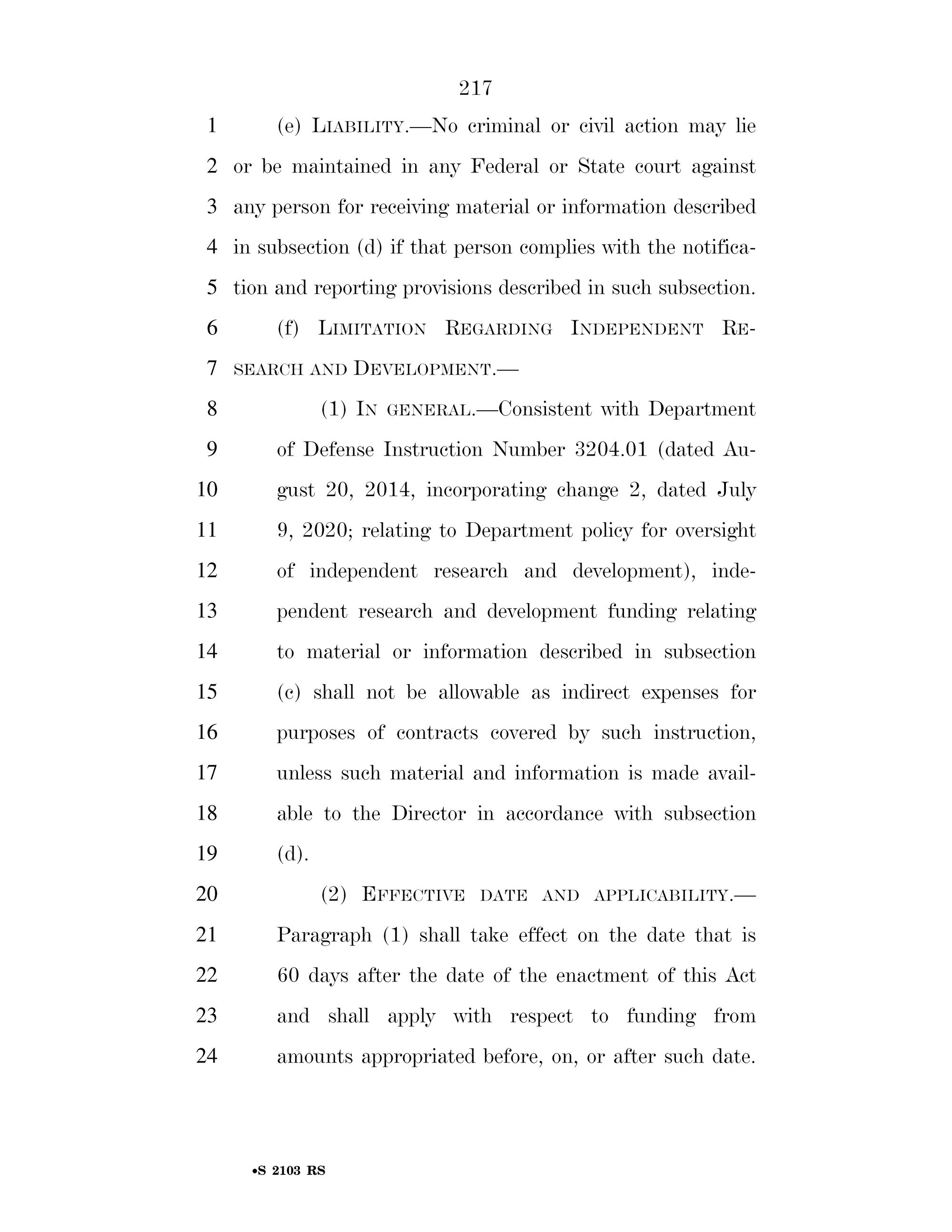 The NDAA contains a provision stating that anyone complying with the notice and reporting requirements is not committing any violation of classification laws or of previous non-disclosure agreements, but it does not contain the IAA's "safe harbor" provision described above, which apparently intended to address some ownership or possession issues. The NDAA does not contain the IAA "sense of Congress" justifications discussed above. Finally, the NDAA funding limitation applies only to programs authorized within the Department of Defense for Fiscal Year 2024, while the IAA provision as initially approved by the Senate Select Committee on Intelligence (SSCI) would have have applied, on its face, to all future appropriated funds under any bill, unless the limitation is explicitly repealed or explicitly waived in future legislation. However, on July 20, 2023, SSCI Chairman Senator Mark Warner (D-VA) filed a revised version of its bill (SA 994) as a possible amendment to the NDAA, which changed the funding limitation to apply only to Fiscal Year 2024.]