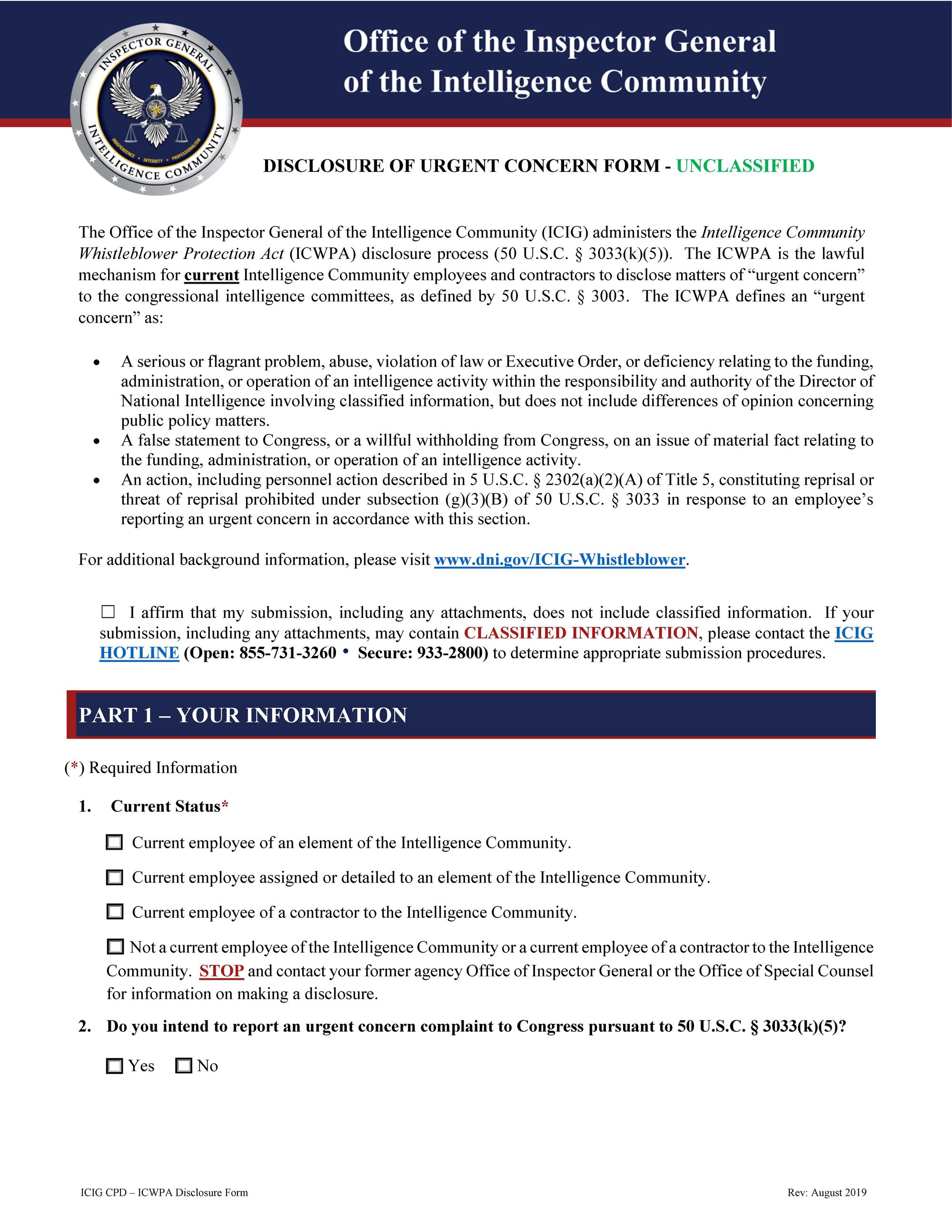 In May 2022, Grusch submitted a complaint to the Inspector General of the Intelligence Community (ICIG), employing a longstanding law, the Intelligence Community Whistleblower Protection Act (ICWPA) ((50 U.S.C. § 3033(k)(5)), which spells out a process for members of certain intelligence agency to report matters defined as being of "urgent concern," including serious violations of law, willful withholding of information from Congress, and some types of reprisals. The law requires that the Senate and House intelligence committees to receive notification of any "urgent concern" complaint, if the ICIG finds it to be "credible," which he did in this case; the committees were notified in July 2022.