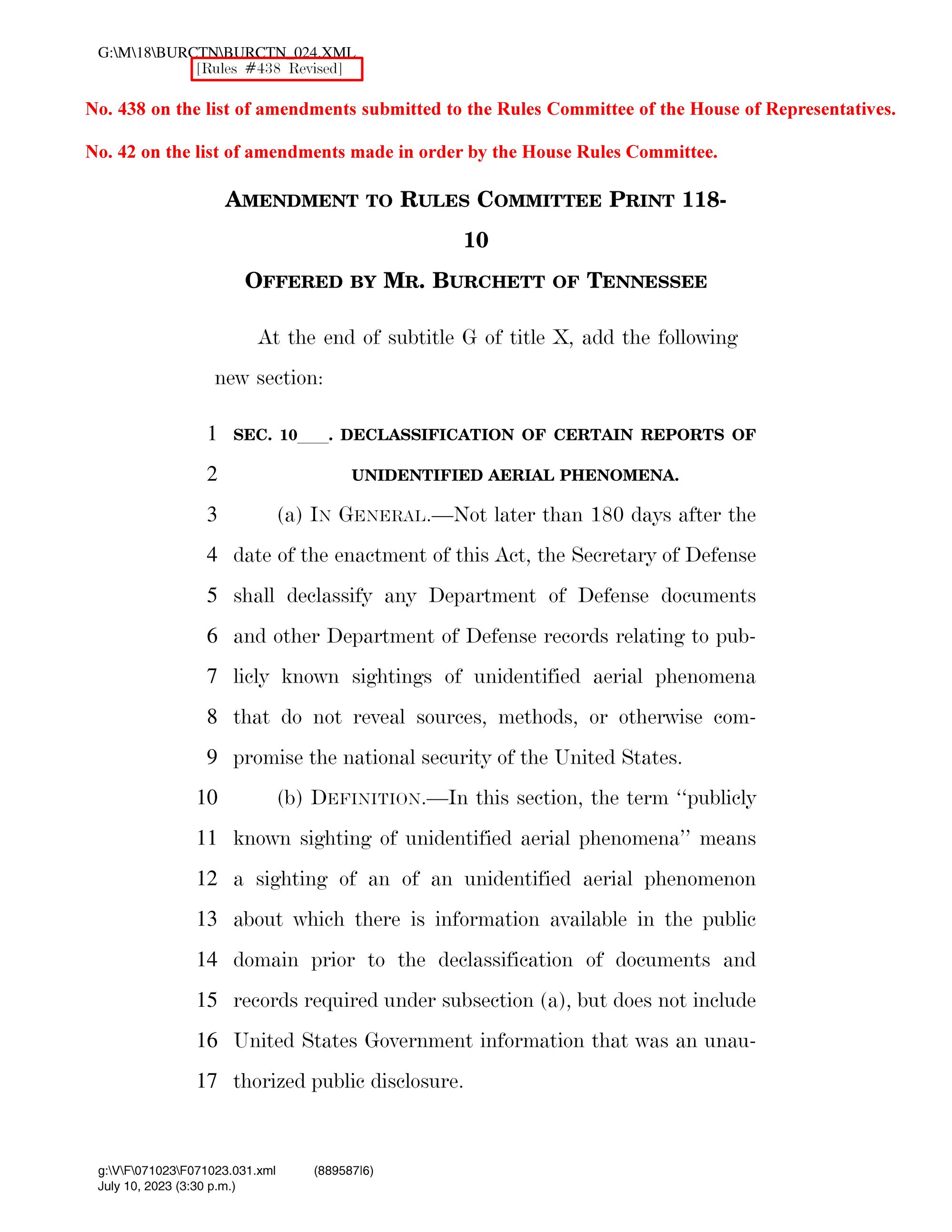 The senior members of the Armed Services Committee of the House of Representatives have said little publicly about the Grusch allegations, and the version of the NDAA approved by the committee (H.R. 2670) contained no UAP-related provisions. [UPDATE: On July 14, 2023, the House passed its version of the NDAA (H.R. 2670) by a vote of 219-210. The House first adopted, without debate, an amendment offered by Rep. Tim Burchett (R-TN) that seeks to encourage the Department of Defense to declassify more UAP-related information-- but as I read it, the amendment would do little if anything to narrow the discretion that Executive Branch authorities have over those decisions. An image of the Burchett amendment as adopted is inserted below. A second amendment, proposed by Rep. Mike Gallagher (R-Wi.), tracked the expansive UAP special-access project language advanced by Senator Gillibrand and found in the Senate Armed Services Committee's version of NDAA, as described above – but the House Rules Committee did not allow a House floor vote on the Gallagher amendment, apparently because of objections from leaders of the House Permanent Select Committee on Intelligence.]