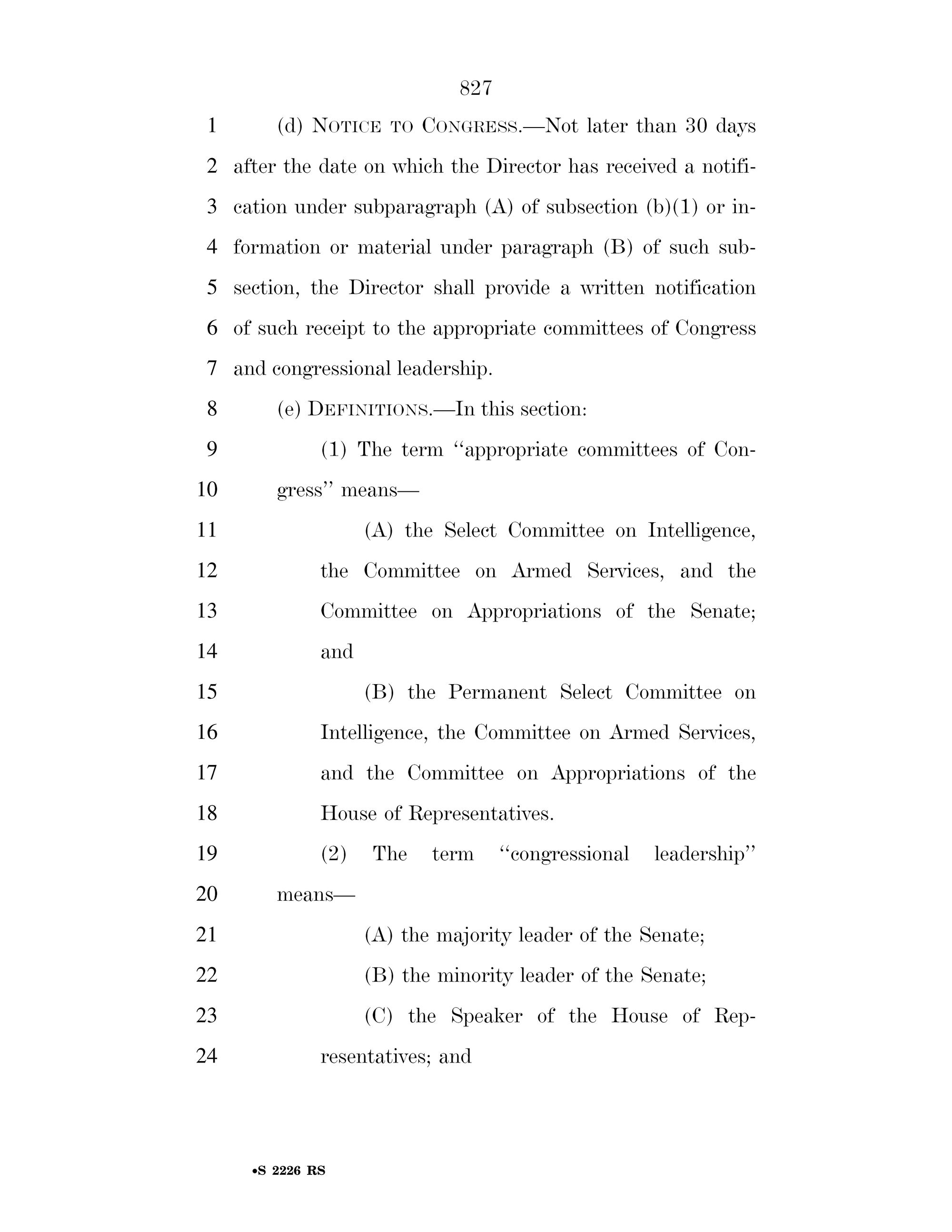 The designated "appropriate committees" are the intelligence, armed services, and appropriations committees of both houses of Congress. "Congressional leadership" is defined as the Speaker and minority leader in the House of Representatives, and the majority and minority leaders in the Senate. A total of 58 senators and 137 House members hold the positions that the bill designates to receive such notifications.